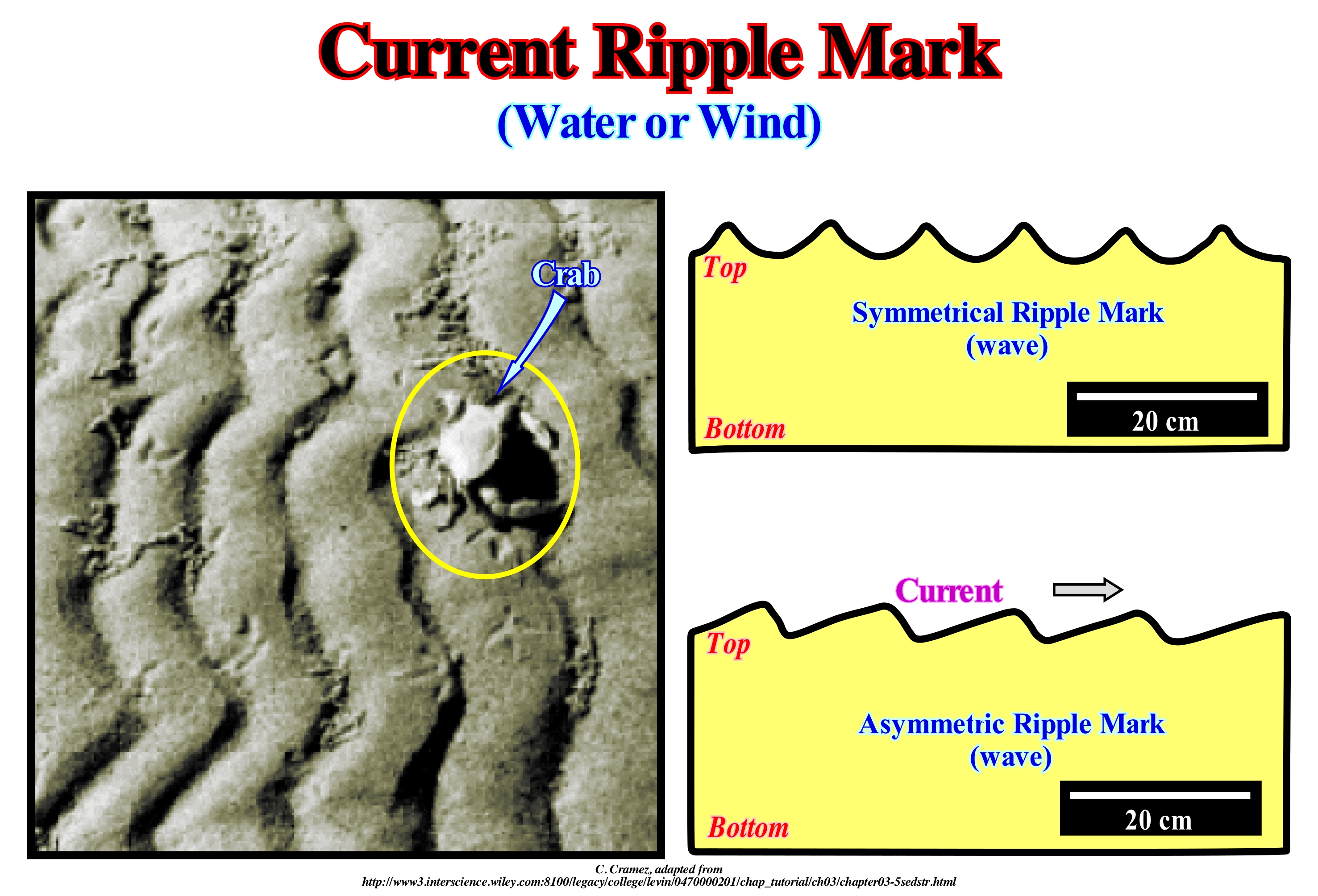 The current marks are wavy surfaces formed by an alternation of small crests and depressions created at the interface between a fluid and an inconsistent sedimentary material. They can be produced by the action of wind, action of submarine currents or wave agitation. They may be oriented perpendicularly or obliquely to the flow direction. They are distinguished, easily, from wave-induced symmetrical ripple-marks. Although, in certain cases, the waves may induce asymmetrical ripple-marks. The ripple-marks are induced by currents and the asymmetric ripple-marks induced by waves are, in both cases, formed at the base of a shallow water-body and are, often, preserved in certain sedimentary rocks. Since they can give very important information about the deposit conditions, it is important to know the characteristics by which they are distinguished from each other. The main differences can be summarized as follows: (i) Along the longitudinal axis, the axes of the ripple-marks formed by the oscillating waves are rectilinear or, when curved, the curves are long and uniform and the axes, more or less, parallel ; in the ripple-marks formed by the currents, the longitudinal axes are not parallel and each mark is curved and irregular ; (ii) At the top and bottom angles, the wave induced asymmetrical ripple-marks are rounded at the top and bottom, while those induced by the currents are, often, angular if the current is, sufficiently, fast to cause a steady flow of sand grains ; (iii) There is little difference in the height of the crests along the ripple-marks, induced by the waves, but in the marks induced by the currents the height is irregular ; (iv) Regarding their form, the waves induce crests in flat sediments, where there are practically no troughs, while currents sweep the surfaces of the sediments, and thus the troughs and crest have a similar development. These waves are of oscillation waves* (orbital movement of water) and not of translation waves (when the water moves to the continent).