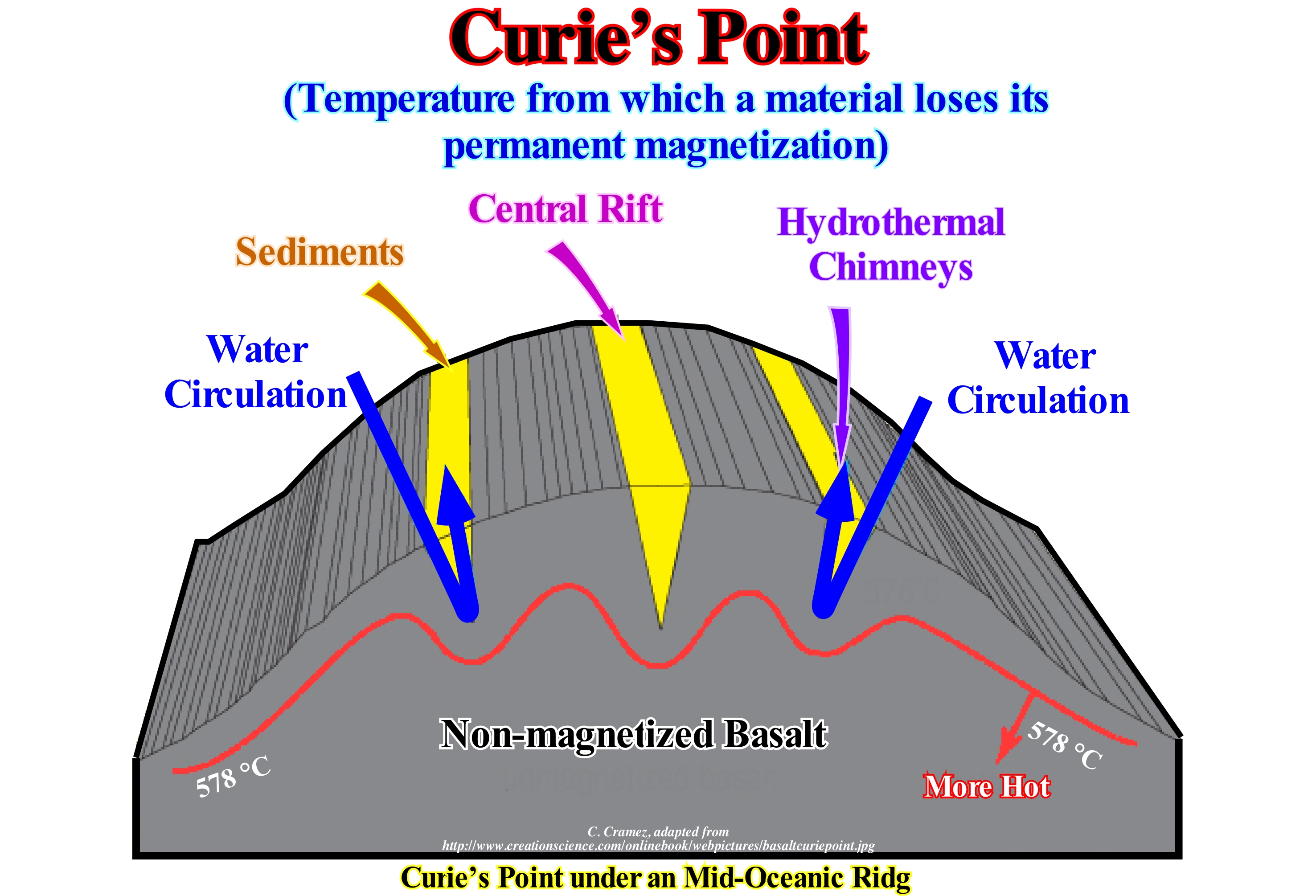 A magnet, when heated, loses its magnetic properties, since heat causes a break-down in the arrangement of its particles. Above a certain temperature. the conductors lose their magnetic properties. This temperature, which is constant for each substance, is called Curie's temperature or Curie's point. At this temperature the materials lose their ferromagnetic properties. This transition is reversible through the cooling of the material. As examples of Curie's temperature we can mention 770° C for iron, 1075° C for cobalt, 365° C for nickel, etc. Unlike a ferromagnetic material, a paramagnetic, which is attracted by a magnetic field, does not retain magnetization in the absence of an external magnetic field. Below the Curie's temperature, magnetic moments are aligned in parallel within magnetic domains in ferromagnetic materials and anti-parallel in ferromagnetic materials (magnetic moments of the atoms have an opposite direction). Above the Curie's point, a ferromagnetic material becomes paramagnetic and thus the magnetic moments are in a total disorder. This figure shows a typical geological section of a mid-oceanic ridge. The ridge temperature, usually, increases with depth. However, the walls of fractures in a mid-oceanic ridge are, usually, cooled by the cold water circulating down and out of them by natural convection. After several thousand years of cooling, a temperature line corresponding to the Curie's point forms, perpendicularly, the ridge (dorsal), as shown in this sketch (red line). When a rock particle cools, for example, from 579 ° C to 577 ° C, it takes the magnetism of the Earth's magnetic field at that point, which implies that the most magnetized material must be close to the fractures, whereas the material above Curie's temperature is not magnetized. They form magnetic anomalies, perpendicularly, to the ridge along fracture zones, as the ocean floor is expanded.