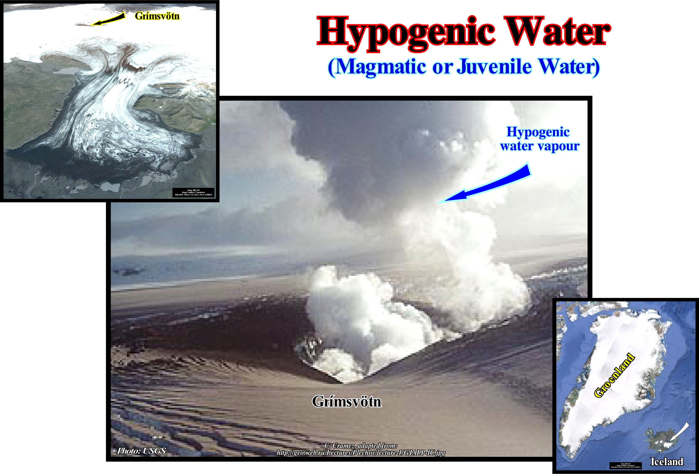 Hypogenic or juvenile water, in the form of vapour, is almost always associated with volcanic eruptions, as witnessed by this photograph of the eruption along the lakes' fissures of Grímsvötn (Iceland) in 1998. Sometimes, water is very likely to come to the Earth's surface for the first time. This is certainly true when hypogenic or juvenile water is associated with hot spots in the asthenosphere. At present, i.e., after 4.5 Gy (billions of years) of geological history, the most likely is that water is recycled in the same way as rocks are, that is, that water has already made part of the composition of the Earth's surface. Subduction zones, whether B-type (Benioff) or A-type (Ampferer), strongly, suggest a superficial origin of the hypogenic water. Most of the geoscientists now admit that: (i) All Paleozoic oceanic crusts were consumed in the subduction zones (except for the very small fraction that forms the Paleozoic Ophiolites) and (ii) In the post-Pangea oceanic crust, the larger part, in particular, formed during the Triassic and Jurassic, has also disappeared along the B-type subduction zones (a small amount of this ancient oceanic crust is found in the Meso-Cenozoic mountain belts in the form of Mesozoic ophiolites). All this means that in the B-type subduction zones the descending lithospheric plates (oceanic crust and deep pelagic sediments that are rich in water) carry the water to the deeper parts of the subduction zone where it is swallowed and assimilated by the asthenosphere, at the same time, as new magmas form**. The continuation of this geological history is well known to all geoscientists and especially to people living near the volcanic arcs of the lithospheric plates. The magma, thus formed, rise to the Earth's surface through the riding plate, most often, catastrophically, where they form a whole series of effusive rocks, at the same time releasing a large part of the water they contain. It is this water, which the vast majority of geoscientists call hypogenic or juvenile water.