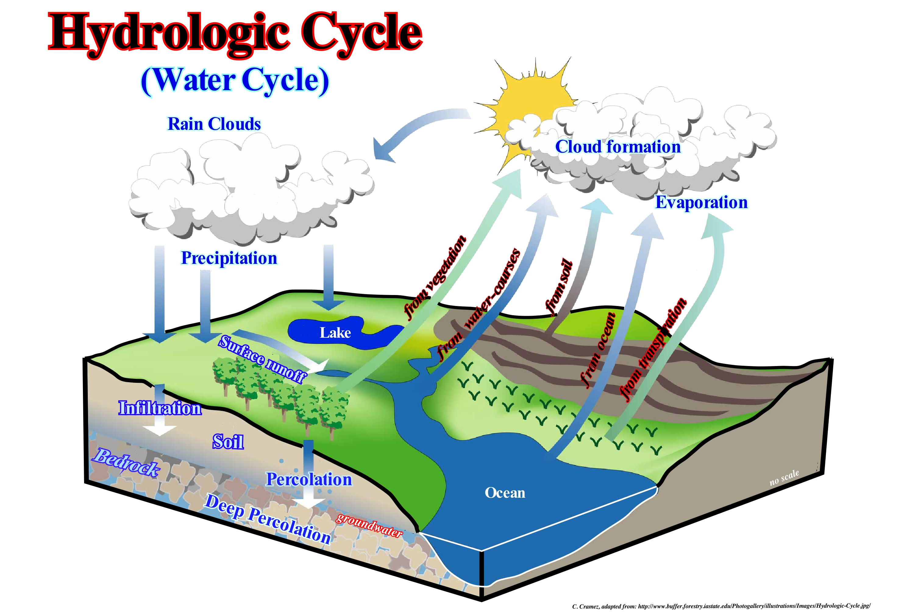 The hydrosphere includes all the water on Earth. In fact, 71% of the Earth is covered with water and only 29% corresponds to land. The abundance of water on Earth is a unique feature. It distinguishes our planet from the other planets in the solar system. The most likely reason for the presence of water on Earth is that it has mass, chemical composition and just atmosphere. On the other hand, the Earth is at just distance from the Sun, which allows water to exist in liquid form. The variations of temperature and pressure on our planet allow water to exist in three states: (i) Solid (ice) ; (ii) Liquid (water) and (iii) Gaseous (water vapour). Most of the water is contained in the oceans (1.35 M km3). The high heat capacity of this large body of water protects the Earth's surface from major changes in temperature. The amount of water on Earth is limited, since it is constant. Geoscientists think the amount of water (in all its forms) is constant since the formation of the Earth. This conjecture explains the eustatic cycles associated with the rupture of the supercontinents (1st order eustatic cycles). The movement of water through the hydrosphere, as illustrated in the diagram on the right, is called the water cycle or hydrological cycle. This cycle can be divided into six parts: (a) Evaporation/Transpiration ; (b) Condensation ; (c) Precipitation ; (iv) Infiltration ; (v) Flow and (vi) Harvest. Condensation occurs when water vapour condenses into the atmosphere to form clouds. When the air cools sufficiently, the water vapour condenses in the air into particles to form the clouds. Since the clouds form, the wind moves them across the earth's surface, spreading water vapor. When the clouds can not contain more moisture, they release the water in the form of precipitation, which can be rain, snow, hail, etc. Infiltration, runoff and evaporation occur at the same time. Infiltration occurs when precipitation falls on the ground. If the precipitation is faster than the infiltration it begins to seep into a body of water. The same happens to groundwater. Evaporation changes the liquid water from bodies of water into gas that rises in the atmosphere to condense later.