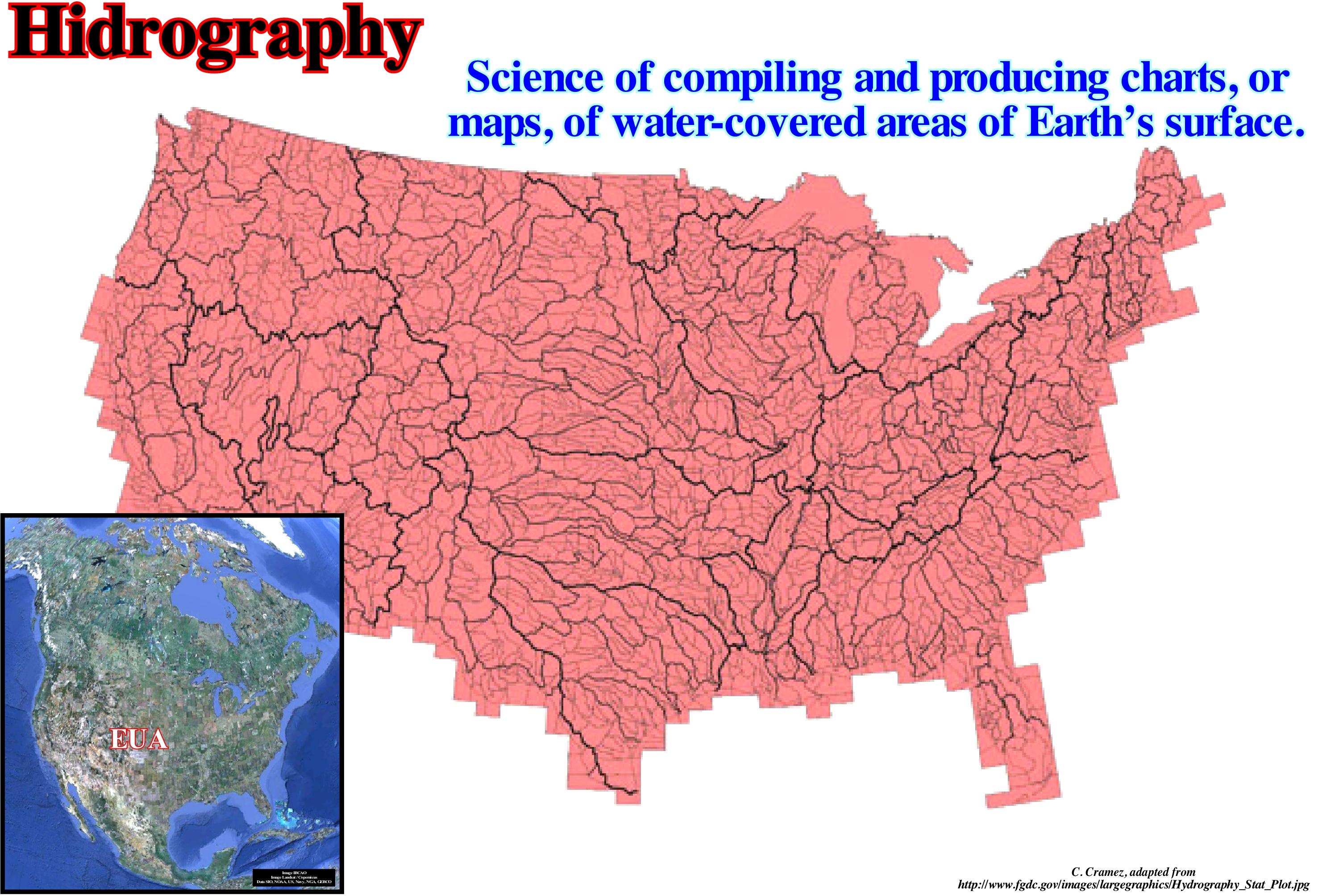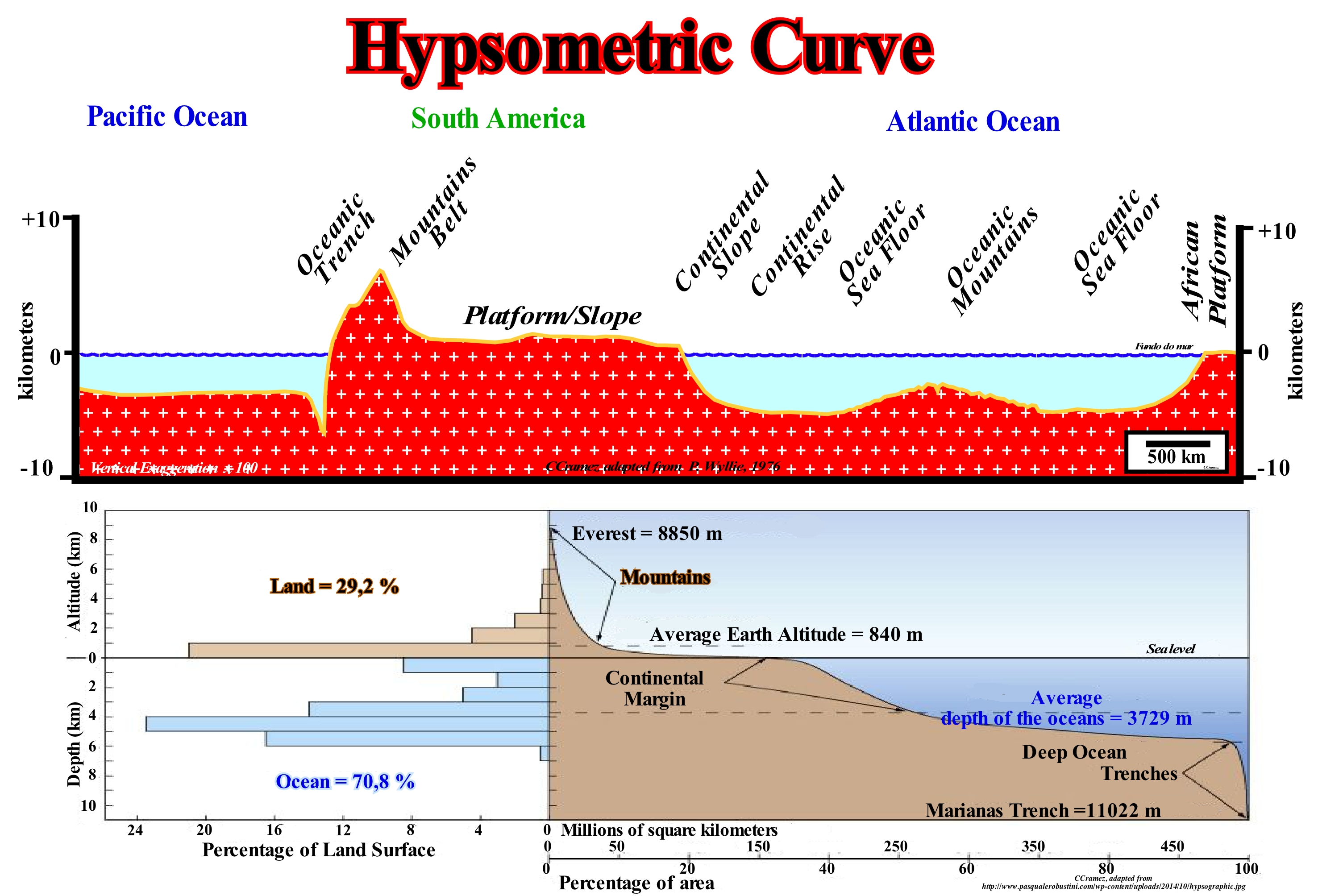 On this hypsometric section, between the Pacific Ocean and the African Platform, the three most important physiographic elements are: (i) The continental platforms (South and West Africa) ; (ii) The floors of the oceanic basins (South Atlantic and Pacific) and (iii) The submarine mountains (ocean ridges). The boundary between the platform and the ocean floor is the continental slope (including the continental rise), which descends abruptly from the continental edge to the ocean floor (slope varies from 3° to 6°). Contrary to popular belief, the most important mountain chain, represented in the hypsometric profile by the oceanic mountains between South America and Africa, is the mid-oceanic ridge (also called the submarine dorsal, dorsal meso-oceanic or middle ocean crest), which is situated on the ocean floor. It is different from the continental chains not only because it is formed, almost exclusively, by basalts, but also by the total absence of compressional deformations (shortenings). The mid-oceanic ridge extends over 65,000 km, with a variable width, whose average is about 1,000 km. This section allows to understand the structure of the divergent and convergent continental margins. In the divergent continental margins, there is oceanic expansion (sea floor spreading) and the formation of submarine volcanic mountains, which creates an oceanic bottom on each side, between the oceanic mountains and the continental rise (borderline of the continental margin, between the abyssal plain and the slope of the continental shelf, with crustal oceanic basement). The divergent continental margins are formed during the oceanic expansion that follows the breakup of the lithosphere of a supercontinent, in this case the small supercontinent Gondwana. In the first phase, the lithosphere of the supercontinent is lengthened by an extensive tectonic regime (σ1 vertical) with formation of half-grabens structures, which are filled by non-marine sediments, forming what the geoscientists call rift-type basins. After the break-up of the lithosphere of the supercontinent, the sedimentary wedges, which form the divergent margins, gradually, deposit on the rift-type basins, which predate the break-up of the lithosphere, as the ocean between the two margins is lengthened. Conversely, on the convergent continental margins, there is a reduction of the ocean floor. The oldest and densest oceanic crust plunges under the continental crust and enters the asthenosphere along a B-type subduction zones, where it is, partially, digested. The subduction zones are underlined in the hypsometric profiles by deep ocean trenches, such as the oceanic trenches that borders, in the west, South America. In the diagram below, it can be seen that: (a) The average height of the Earth is about of 840 meters ; (b) The average depth of the oceans is about 3,729 meters ; (c) The difference in terrestrial relief is about 20 km ; It corresponds to the difference between the Everest peak (more or less 8,850 meters) and the Mariana trench (about -11,022 meters), which is the deepest site of the oceans in the convergent margin between the lithospheric plate of the Pacific and the Philippines; (d) Oceans occupy about 70.8% of the land surface, 24% of which is under a water-depth between 4,000 and 5,000 meters and only 8% under a water depth of less than 1000 meters ; (e) Continents occupy about 29,2% of the terrestrial surface being 22% with an altitude of less than 1,000 meters. The distribution of water on Earth is as follows: (i) Oceans, 1,350 x 1015 m3 (97.3% of the total water) ; (ii) Cryosphere, 29 x 1015 m3 (2.1%) ; (iii) Underground, 8.4 x 1015 m3 (0.6%) ; (iv) Lakes and Rivers, 0.2 x 1015 m3 (0.01%) ; (v) Atmosphere, 0.013 x 1015 m3 (0.001%) and (vi) Biosphere, 0.0006 x 1015 m3 (4 x 10 -5%). In other words, about 97% of the Earth's water is salty. The fresh-water (3% of the total water of the Earth), only 32% is not frozen (groundwater about 30% and surface water about 2%). The Earth is wider around the equator than between the North and South Pole. It is similar to an ellipsoid or spheroid. The Earth's ellipsoid is a rough mathematical figure of Earth's shape, used as a frame of reference for geodetic, astronomical, and Geosciences computations. The geoid is the surface that is complex to describe, mathematically, but which can be easily identified by measuring gravity. The geoid is considered to be roughly equal to the Middle Sea Level*, but in the oceans, the Geoid and the Middle Level of the Absolute Sea are approximately coincident, but in continental areas they may be very different. The terrain (true shape of the Earth) is given by topography and bathymetry.