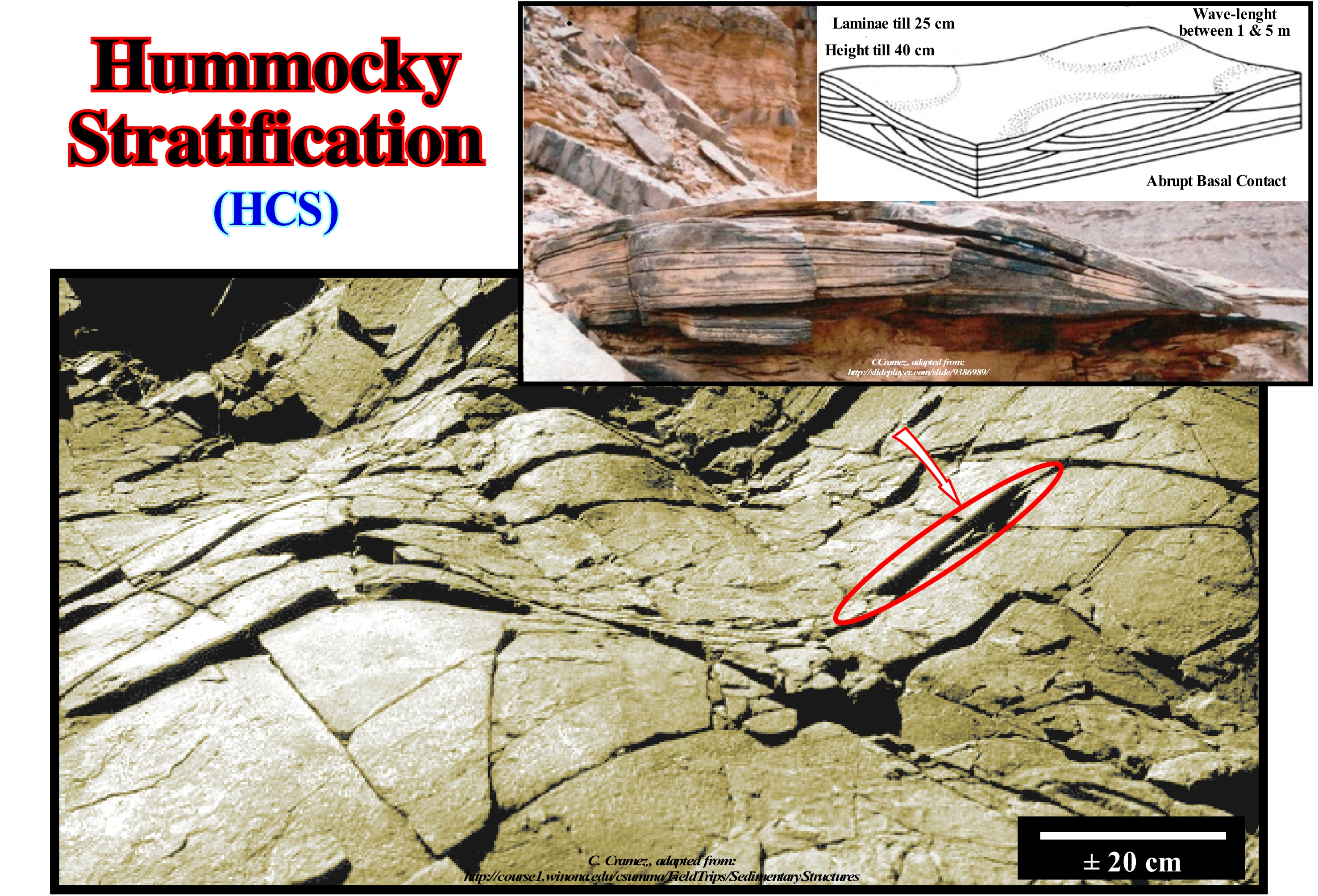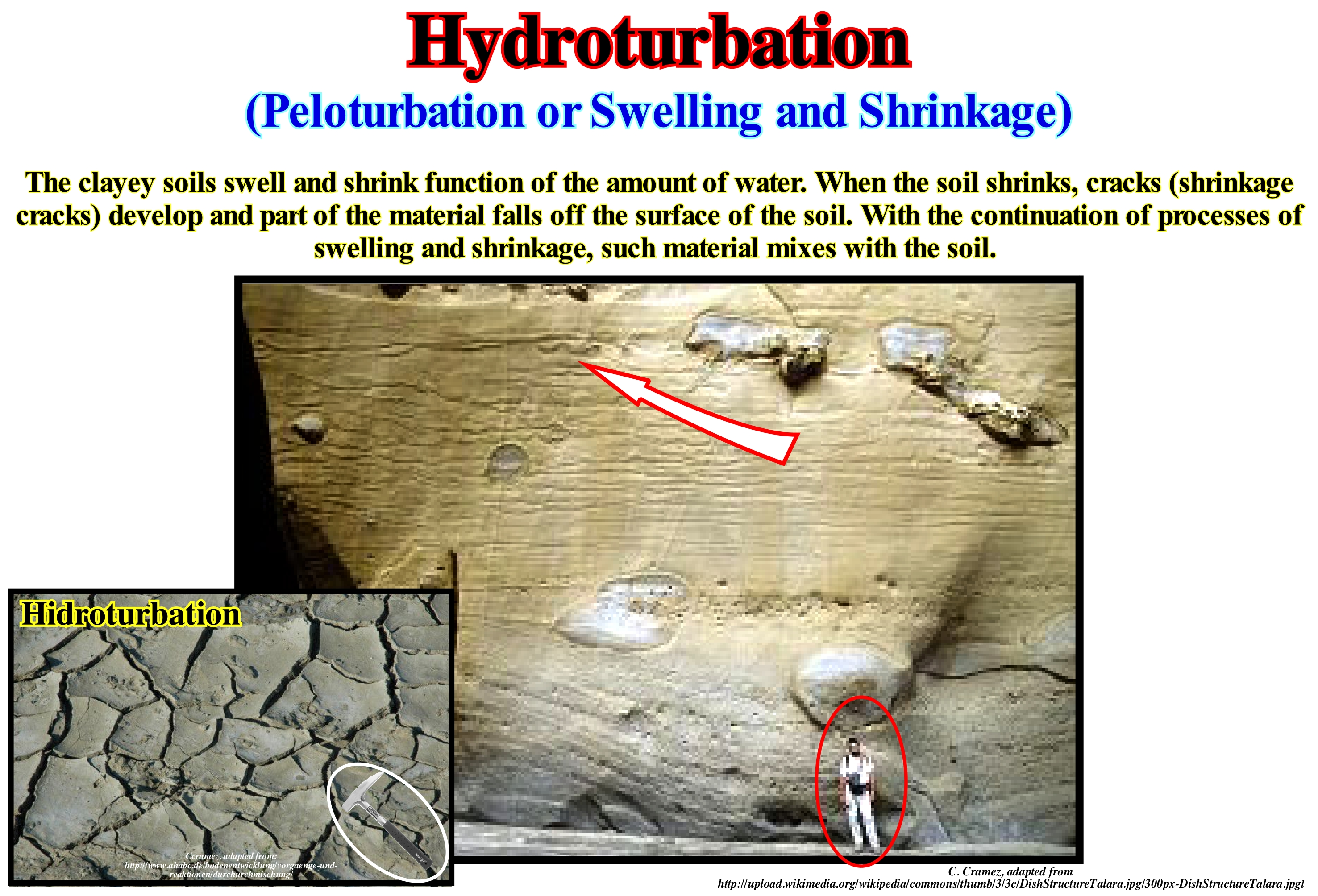 The hydroturbation designates, mainly, the deformation of a soil under the action of hydration and dehydration, as, for instance, the dissecting slits are the result of the hydroturbation. When the water content or the increase of pressure causes hydroturbation or peloturbation, certain geoscientists think it is due to the processes of expansion and contraction of the clay minerals. Soil columns develop where clay minerals are washed away. On the surface a structure of microswellings occurs next to micro-cavity (micro-turbation). Do not confuse hydroturbation with bioturbation. Bioturbation results from the mixing of soils by organisms. This mixture creates an expansion of the soil horizons as well as a lubrication of the transition horizons. Bioturbation produces secondary porosity, which plays a crucial role in water conductivity especially in fine soils. Bioturbation processes promote the formation of complex humus, which stabilize and increase the fertility of soils. Anthropogenic cultivation of soils is part of bioturbation, although, conventionally, it is not taken into account by geoscientists. Also do not confuse hydroturbation with cryoturbation, which is a disturbance, that is, a set of processes of mixing sediments or horizons of a soil, caused by ice and in which the effects of physical decomposition are the same as during an ice fracturing (cryoclastic). This photograph represents an outcrop of a deep turbidite sandy interval (submarine basin floor fans) deposited following a relative sea level fall that puts sea level lower than the basin edge, i.e., that changed the geological conditions from highstand to lowstand geological conditions. In this clayey horizon that underlines the age of the erosion surface (unconformity) induced by the relative sea level fall, it is easy to recognize the deformations of the sediments (convex upwards) induced by a water escape, which filled the porosity of the sands, due to compression (exhaust figures).