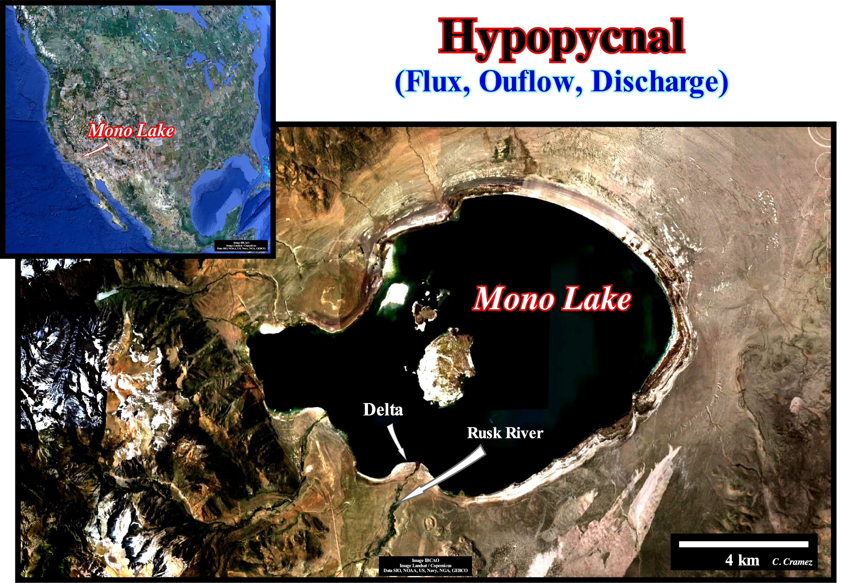 When water from a sedimentary particle-laden water-course enters another water-body (receiving basin), three things can happen: (i) The water density of the water-course may be greater than the density of the receiving water (hyperpycnal flow) ; (ii) The density of the water-course is equal to that of the receiving water (homopycnal flow) and (iii) The density of the river water is smaller than the density of the receiving water (hypopycnal flow). When the flow is hypopycnal, the sediments spread to the surface of the receiving basin and gradually deposit to the bottom forming a hemipelagite* . A hypopycnal runoff is created when a little dense water-courser enters a body of high-density water. Under these conditions, the water-course, when it enters the receiving basin, flows outwards depositing, gradually, the clay fractions which it carries in suspension, eventually, forming a prodelta. The clay particles are no longer suspended by flocculation, i.e., by the agglutination of the particles due to the creation of negatively and positively charged particles by seawater. In homo-pycnal condition, three types of jets can exist in front of a distributary channel: (1) Axial Jet, without friction with the bottom of the body of receiving water ; (2) Planar Jet, flow with great velocity entering a shallow basin, suffering friction with the bottom of the body of receiving water ; (3) Floating plume, the supplied water generates plumes (however, at the beginning, at the entrance to the receiving basin, the flow is governed by gravitational forces, which may suggest a more jets-like behaviour). Note that plumes are flows with buoyancy fed continuously, whereas the jets are flows with the amount of movement, continuously, fed by the source (Crapper, 1977). The amount of movement in the jets remains constant along the central flow lines in any cross section, while in the plumes there is a gradual increase, while maintaining constant buoyancy. Both streams expand laterally through the receiving basin. The difference between a jet and a plume has nothing to do with the turbulence**. In general, Poiseuille's law theoretically indicates the relationship between the flow rate and the viscosity of the fluid, the pressure difference at the ends of a channel, the length and radius of the channel. This ratio is verified, experimentally, in small radius channels and is often used in viscometers because it says, in particular, that the flow is inversely proportional to viscosity (https://fr.wikipedia.org/wiki/Ecoulement_de_Poiseuille). Both can have a turbulent or laminar behaviour. This photograph illustrates the mouth of the River Rusk in Mono Lake which functions as a reception basin. The river current is hypo-pycnal, which means that the water density of Mono Lake is greater than the water density of the Rusk River. Thus, when the river valley is flooded by the rising of the lake level, the fresh water of the river, as it enters the lake, floats on the water of the lake which makes the delta area very productive from the ecological point of view. In this photograph the delta building constructed by the waters of the river Rusk is perfectly visible. Do not confuse deltaic building with delta. The thickness of a delta seldom exceeds 30-6 meters, while the thickness of a deltaic building, which more or less the vertical stacking of many deltas, can reach thousands of meters.