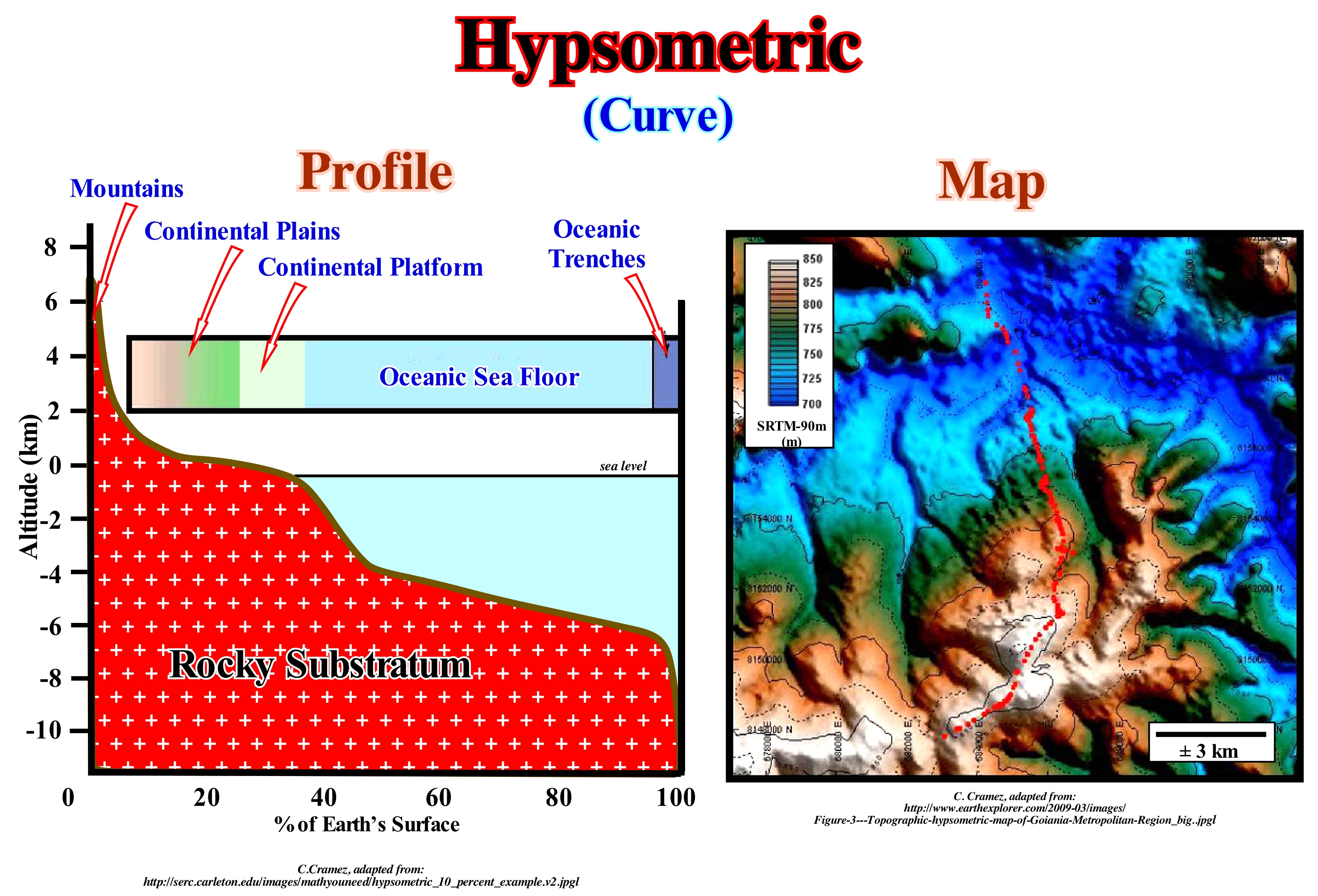 Do not confuse a hypsometric chart, such as the map illustrated on the right of this figure (which is a topographical map) with the hypsometric curve shown on the left. A hypsometric curve is an empirical function of the cumulative distribution of elevations of a region. The differences between the hypsometric curves of certain areas suggest they were shaped by different geomorphological processes. This is, often readily, recognized by the analysis of the drainage system, i.e., by the pattern formed by the water-courses, rivers and lakes of a certain region. The drainage systems (dendritic drainage, parallel, rectangular, radial, etc.) translate rock structures and different geomorphological processes. A hypsometric curve can also be considered as a continuous function and represented graphically as a projection x-y, in which the elevation is on the vertical axis (y-axis) and the area in the horizontal x-axis. A hypsometric curve can also be represented in a nondimensional way or in a standardized form by the maximum elevation and area values, which gives geoscientists a way to assess the similarity of the hydrographic basins. In other terms, a hypsometric curve (or hypsographic curve, as certain geoscientists call it) is a cumulative frequency curve of the height of the Earth's surface. Essentially, it is a graph that shows the proportion of land area that exists at various levels projecting relative area versus relative height. In the hypsometric curve of the total terrestrial surface there are two frequency maxima at 100 and 4,700 meters in height: they correspond to the average level of the continental areas and the sea floor. A hypsometric curve is, usually, used to demonstrate that the Earth has two types of crust: (i) Continental and (ii) Oceanic. The curve, as shown above, shows the percentage of the Earth's surface above any elevation. This is why the horizontal axis is called "% of the Earth's surface", since it indicates the percentage, while the vertical axis underlines elevation above or below sea level.