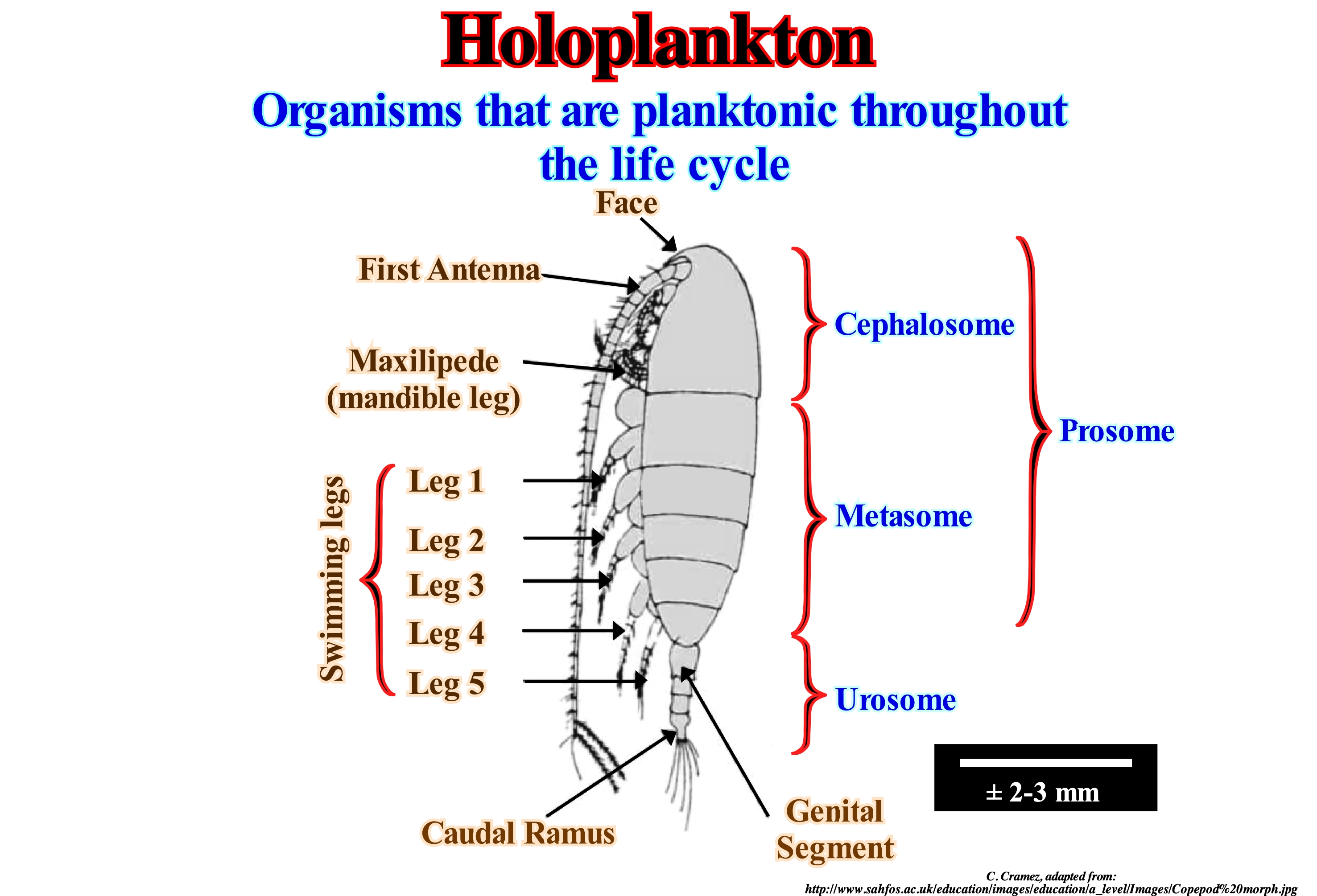 Holo-plankton is a part of animal plankton or zoo-plankton. It is called holoplankton or true plankton to the bodies that remain in the state of plankton throughout its life cycle. It is contrasted with meroplankton or temporary plankton, which is composed of organisms that spend only part of their lives, usually, the larval state, in the form of plankton (jellyfish, crustaceans, larvae, worms, etc.). The holo-plankton consists mainly of micro-algae, unicellular animals and some crustaceans such as copepods, which account for about 70% of zoo-plankton. Copepods, as illustrated in this figure, are free living planktonic organisms (similar to a small cochineal, variety of aphids) ranging from 1 to 10 millimetres in length. They are able to move freely, at small distances, by shaking the articulated members and antennae. This is interpreted as being a mechanism to prevent predators. Their antennae also help prevent them from sinking through the water column. There are thousands of species of copepods that form the holo-plankton. Some live in fresh-water, but most are marine organisms, which have a basic morphology. Copepods are, probably, the most abundant multicellular organisms on Earth. Some authors think that there are about 11,500 species of copepods divided into approximately 200 families and 1,650 genera. Copepods are a diverse group and although some are carnivorous or omnivorous, most are herbivores feeding on phyto-plankton. They feed themselves through a filtration system or using the appendices to manipulate the cell. The emergence of copepods populations throughout the year affects phyto-plankton cycles in the ocean. In the holo-plankton are also cnidarians (aquatic animals known as coelenterates, such as fresh-water hydra, jellyfish, jellyfish, corals, sea anemones and caravels), chaetognatha or bristle-jaws (small marine animals about 15 cm length, elongated and non-segmented body with lateral fins and caudal fins that are extensions of the ectoderm), ostracods (small crustaceans with a limestone shell, composed of two leaflets that are articulated through a structure called a hinge, located in the region dorsal of the animal), etc.