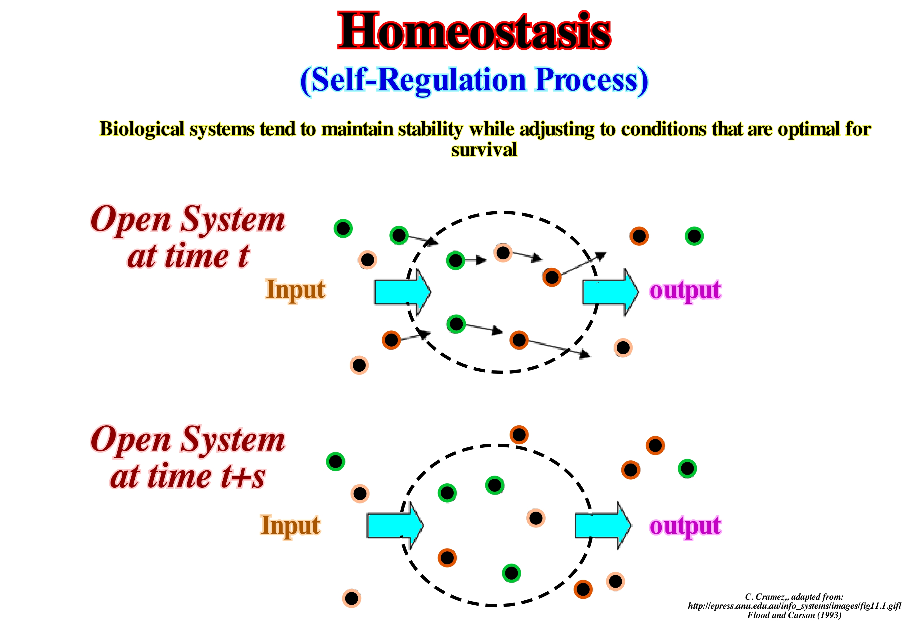 Homeostasis is not just one of the most important properties of any living organism. It is also applicable to human or working organizations treated as open systems. An organization needs to recruit new employees to replace those who retire, but it also needs raw materials, energy and information to use its processes and operations in order to maintain a stable state. An externally static and unchanging organization for external observers is, internally, in a state of dynamic equilibrium flows. Another important aspect of an open system in a dynamic equilibrium state is that it depends on feedback mechanisms to remain in that state. In Boulding's hierarchy, which classifies systems according to their complexity, it is not surprising to discover that properties exhibited by the lower systems of the hierarchy are also found in the higher systems because they are built on the former. A system that is classified as an open system, which has all the qualities that belong to the system at the cybernetic level (self-regulation). The behaviour of open systems is to a large extent determined by the feedback mechanisms present in them. There are two types of feedback that operate on most systems: (i) Negative feedback and (ii) Positive feedback. The first reduces or eliminates the deviation of the system from a given standard. A negative feedback mechanism tends to neutralize the disturbing effect of the environment so that the system can maintain its normal course of operation. On the other hand, it amplifies the positive feedback or accentuates the change, which leads to a continuous divergence from the initial state. Positive feedback contributes to negative feedback in living systems (for instance, organisms and organizations, also, both types of feedback are present during growth, although the result is positive). However, the positive feedback operation alone may, eventually, result in a system of disintegration or collapse. Negative feedback plays a key role in the system's ability to achieve a state of equilibrium or homeostasis.