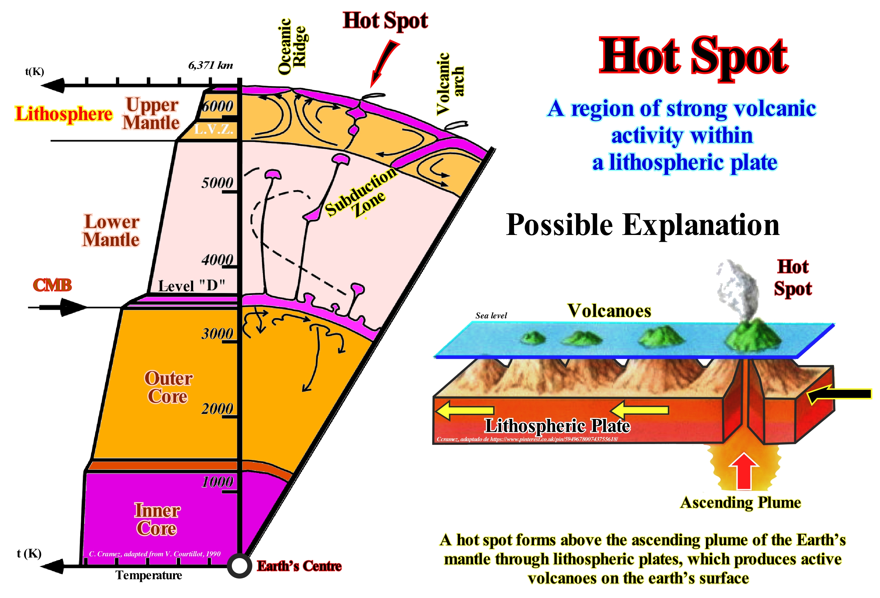 From the point of view of petrography, the internal structure of the Earth can be divided into three concentric envelopes: (i) Continental Crust composed mainly by granite and metamorphic rocks, which are, generally, covered by sedimentary rocks ; (ii) Mantle that is composed, mainly, of anhydrous peridotites and eclogites and (iii) Core, that is, mainly, composed by iron and nickel and that can be sub-divided into a solid outer core and liquid inner core (not crossed by the S waves). The crust thickness varies between 30 and 70 km. The average density of the upper continental crust is 2.5-2.7 g/cm3. The lower continental crust, which is, mainly, composed of gabbros, has an average density of 2.8 g/cm3. The oceanic crust is, mainly, composed of basaltic rocks and gabbros, which are almost always covered by pelagic and hemipelagic sediments. The average density of the oceanic crust is about 2.9 g/cm3 and its thickness varies between 4 and 10 km. The average density of the mantle is 3.3-3.4 g/cm3. The boundary between the crust and the earth's mantle is underscored by Mohorovičić's discontinuity, whose depth varies between 4 and 70 km. The lower mantle boundary is more or less located at 680 km (with a ± 20 km error) and appears to correspond to a phase change. The lower mantle has the same chemical composition as the upper mantle, but is, probably, in a different phase. At the top, the average density of the mantle is about 3.3 g / cm3 and about 5.6 g/cm3 at the deepest part, that is, at 2,900 km depth. The core is composed mainly of iron and nickel. As shown in this diagram, hot spots allow the transfer of material between the lower mantle and the lithosphere. The vast majority of the geoscientists think that hot spots are induced by, relatively, narrow convection currents called plumes that start from the boundary between the core and the Earth's mantle, although others think the main cause is the convection currents of the mantle higher. Recently, certain geoscientists have advanced the hypothesis that at least some of the 40-50 hot spots recorded to date may be induced by the impact of large meteorite. A hot spot may form a, more or less, continuous series of volcanoes on a lithospheric plate that moves over it.