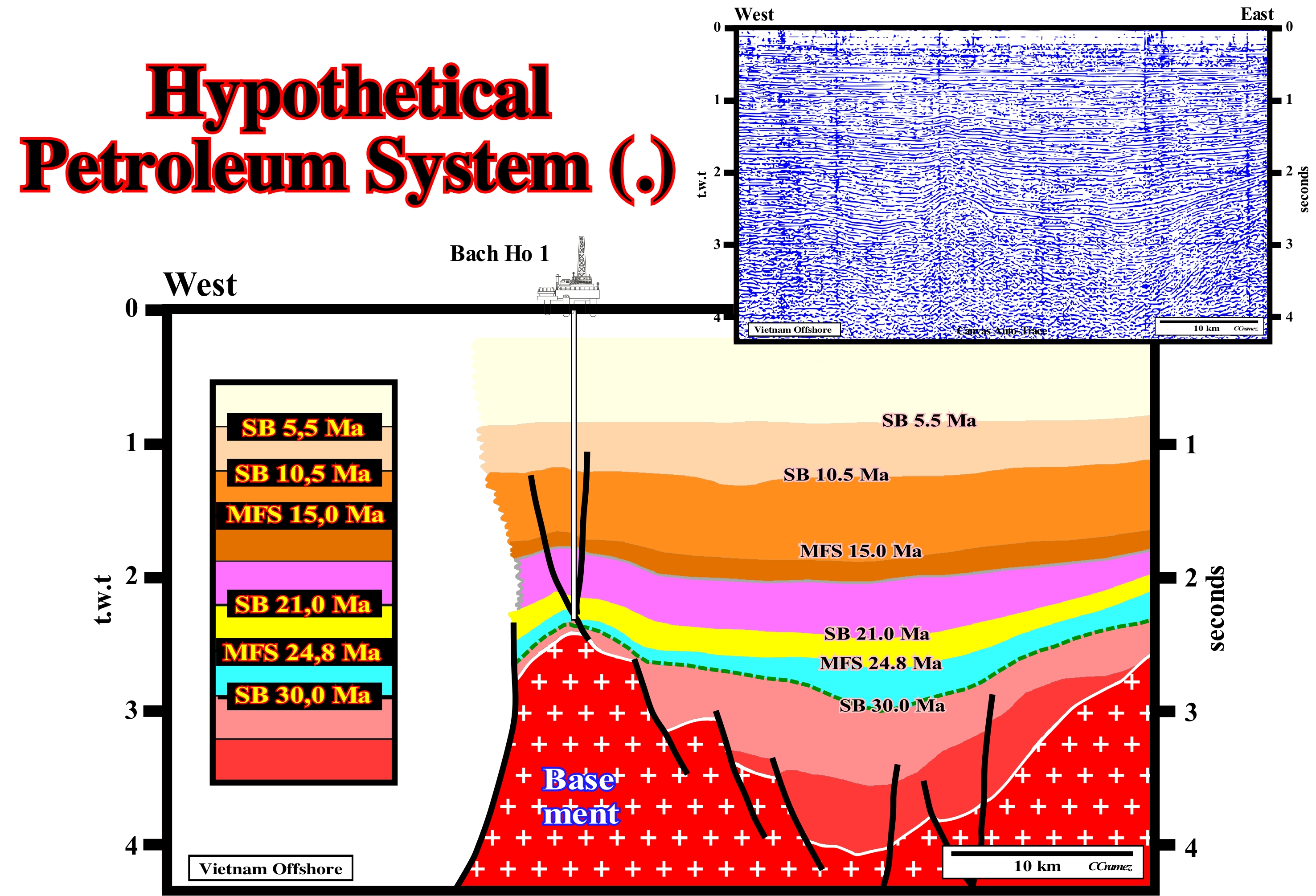 This tentative geological interpretation of a Canvas auto-trace of a Vietnam offshore seismic line illustrates a hypothetical petroleum system (.), since an economic accumulation of oil was found in the Bach Ho ≠ 1 well. On the other hand, lacustrine rocks rich in matter organic matter are known in the half-grabens of the rift phase of the back-arc basin of Vietnam offshore. However, as the proof that these source-rocks generated the hydrocarbons have not yet been made (it is very possible that, at present, it has already been done), the petroleum system should be, provisionally, considered as hypothetical. Do not forget that Magoon, in 1987, considered three types of petroleum systems as a function of the degree of certainty: (1) Known Petroleum System (!) ; (2) Hypothetical Petroleum System (.) and (3) Speculative Petroleum System (?). In a known petroleum system (!), the correlation between the source-rock and hydrocarbons is known, in particular by biomarkers (in the case of petroleum). In a hypothetical petroleum system (.), there is no correlation between source-rock and the found hydrocarbons. A speculative Petroleum System (?), is based, just, on geological or geophysical data, which still have not been tested by the exploration operations. This classification is, also, based on the fact that an petroleum system has three important temporal aspects: (A) Age ; (B) Critical Moment and (C) Preservation Time. The preservation time of a petroleum system begins, immediately after the process of generation-migration-accumulation occurs and extends to today. During the preservation time, re-migration, physical or biological degradation or a complete destruction of the oil may occur. During the preservation time, a re-migration of the oil may accumulate in reservoir-rocks after the petroleum system has formed. If insignificant tectonic activity occurs during the preservation time, the accumulations, generally, remain in their original position. A remigration takes place during the preservation time only if folding, uplift, fracturing or erosion occurs. If all the accumulations are destroyed during the preservation time, the evidence of existence of the petroleum system disappears. An incomplete or just completed petroleum system lacks preservation time.