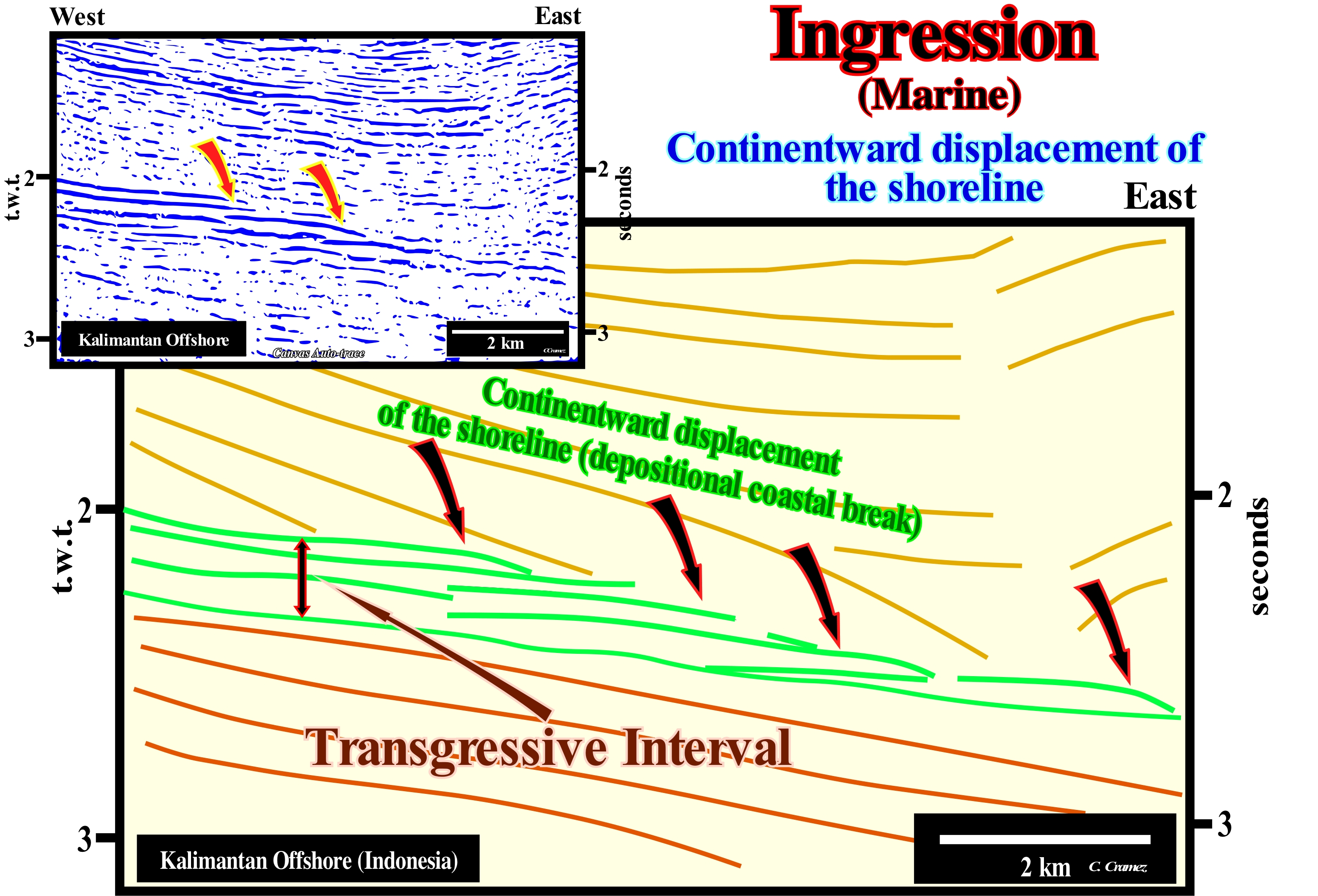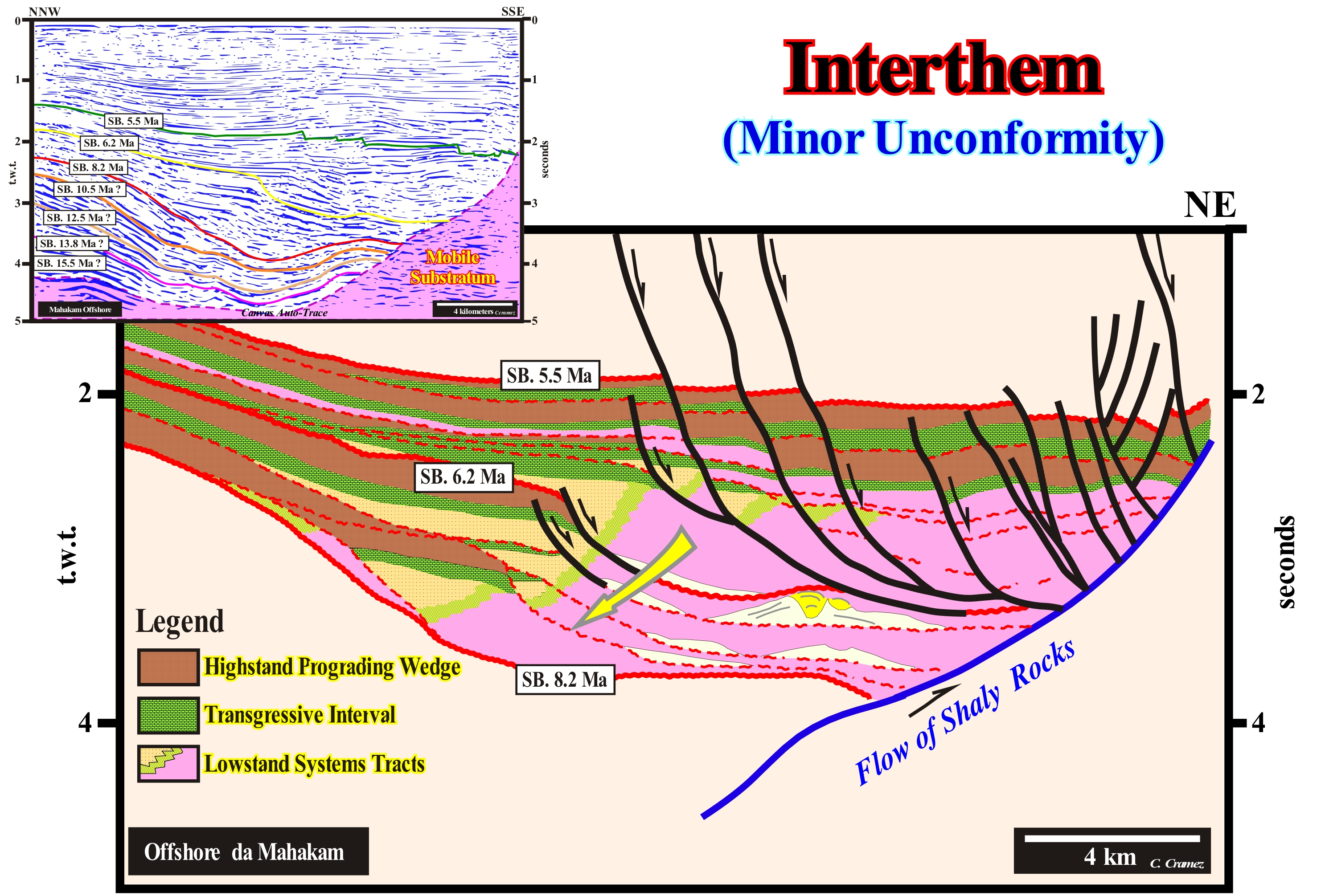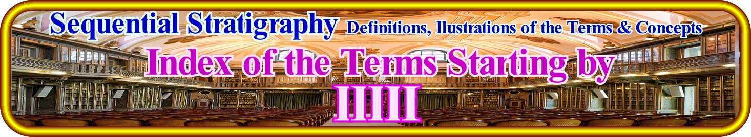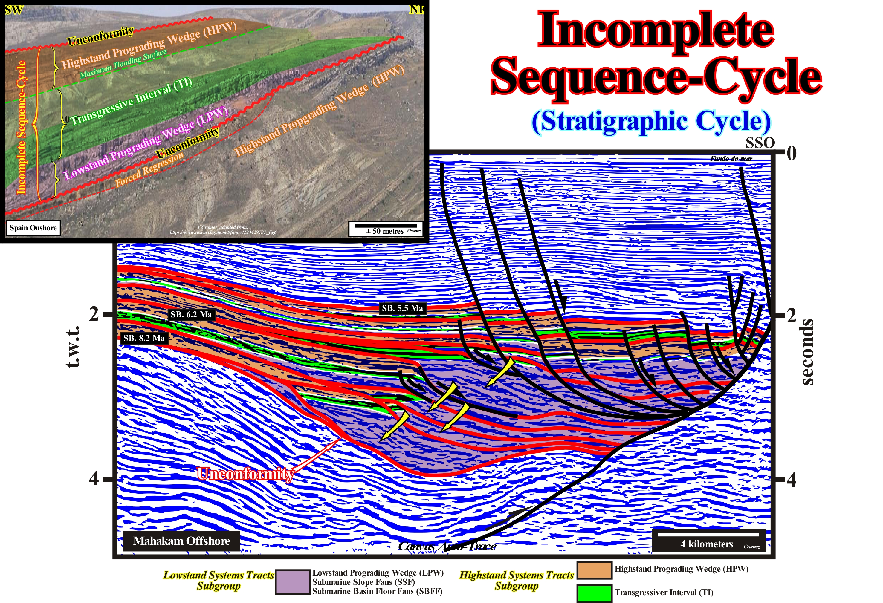 A sequence-cycle, which is induced by a 3rd order eustatic cycle (characterized by a time-duration between 0.5 and 3-5 million years), is limited between two consecutive unconformities (or their correlative water-deep paraconformities), whose age difference does not exceed 3 My (or 5 My for certain geoscientists). When in an tentative geological interpretation, the age difference between two consecutive unconformities, i.e, between two significant relative sea level falls, which put the sea level lower than the basin edge, is greater than 3-5 million of years, the stratigraphic cycle is not a sequence-cycle, but, probably, a continental encroachment sub-cycle. Theoretically, a continental encroachment subcycle is formed by several sequence-cycles, which for various reasons can not be, correctly, identified. When the sedimentation rate is very strong, sometimes, within conventional sequence-cycles (those considered in the sequential chronostratigraphy of J. Hardenbol, 1998) several stratigraphic-cycles of upper hierarchy (high frequency cycles) can be recognized. However, usually, they are incomplete cycles. Certain sedimentary systems tracts sub-groups or even groups are absent. On this tentative interpretation of a Canvas auto-trace of a detail of an offshore seismic line from Kalimantan (Indonesia), it is easy to see that between the unconformities SB. 8.2 Ma and SB. 6.2 Ma, as well as. between the unconformities SB 6.2 Ma and SB. 5.5 Ma (conventional unconformities), which define two sequence-cycles, there are other unconformities that limit stratigraphic cycles of 4th or even 5th order (SB means "Sequence Boundary"). Some of these high frequency stratigraphic cycles are incomplete. They are, fundamentally, formed by the lowstand systems tracts sub-groups, which within a sequence-cyle, from the bottom up are: (i) Submarine Basin Floor (SBFF) ; (ii) Submarine Slope Fans (SSF) and (iii) Lowstand Prograding Wedge (LPW). The micro-paleontological results of the wells drilled along this seismic profile corroborate the hypothesis accepted by the geoscientist in charge of the interpretation that these high-frequency cycles are sometimes incomplete (often formed just by certain lowstand systems tracts sub-groups). When a geoscientist says lowstand, it does not necessarily speaks in deep sediments. In this particular case, the high frequency sequence-cycles are composed, mainly, of lowstand prograding wedges in which the delta depositional systems are preponderant. In this particular case, the high frequency sequence-cycles are composed, mainly, of lowstand prograding wedges, in which the delta depositional systems are preponderant. Lowstand means that relative sea level fall (sea level referenced to a local point of the Earth's surface which may be the sea floor or the base of the sediment and which is the result of the combination of absolute or eustatic sea level and tectonics) and became lower than the basin edge. Under these conditions, the basin no longer has a shelf (continental platform). It has been exhumed and transformed into a coastal plain. In the photograph shown in the upper left corner of this figure, a sequence-cycle, limited by two unconformities (wavy red lines) can be recognized, whose age difference is less than about 2.5 million years. In this area, from the bottom up, it is easy to identify: (i) The lowstand prograding wedge (LPW), coloured in violet, which fossilizes the lower unconformity ; (ii) The transgressive interval (IT), colored green ; (iii) The maximum flooding surface (dashed line of green colour), which is the upper boundary of the transgressive interval (TI) and (iv) The highstand prograding wedge (HPW), coloured in light brown, which is which is limited, superiorly, by the erosion surface (unconformity) which is the upper limit of the sequence-cycle. The retrogradational geometry of the transgressive interval (IT) is not evident, but it is, relatively, easy to see that this interval thickens continentward (NE). Likewise, the progradational geometry of the highstand prograding wedge (HPW) is not very evident, but the thickening seaward (NW) is obvious. On this tentative interpretation, it is interesting to note the lower unconformity of the considered sequence-cycle limits a forced regression deposited above the high-level prism of the preceding cycle-sequence. A forced regression corresponds to a shifting the shoreline and coastal sediments seaward as a response to a small relative sea level fall, i.e., when the shoreline line is forced to progradate, but downward, regardless of the terrigeneous influx. The seaward shifting of the shoreline triggers erosion processes in both non-marine and shallow marine water environments, which means that the river incision is accompanied by the development of coastal deposits. The deposited sedimentary systems tracts emphasizing a forced regression have a typical downward progradational geometry (descendants sedimentary systems tracts of P. Vail).