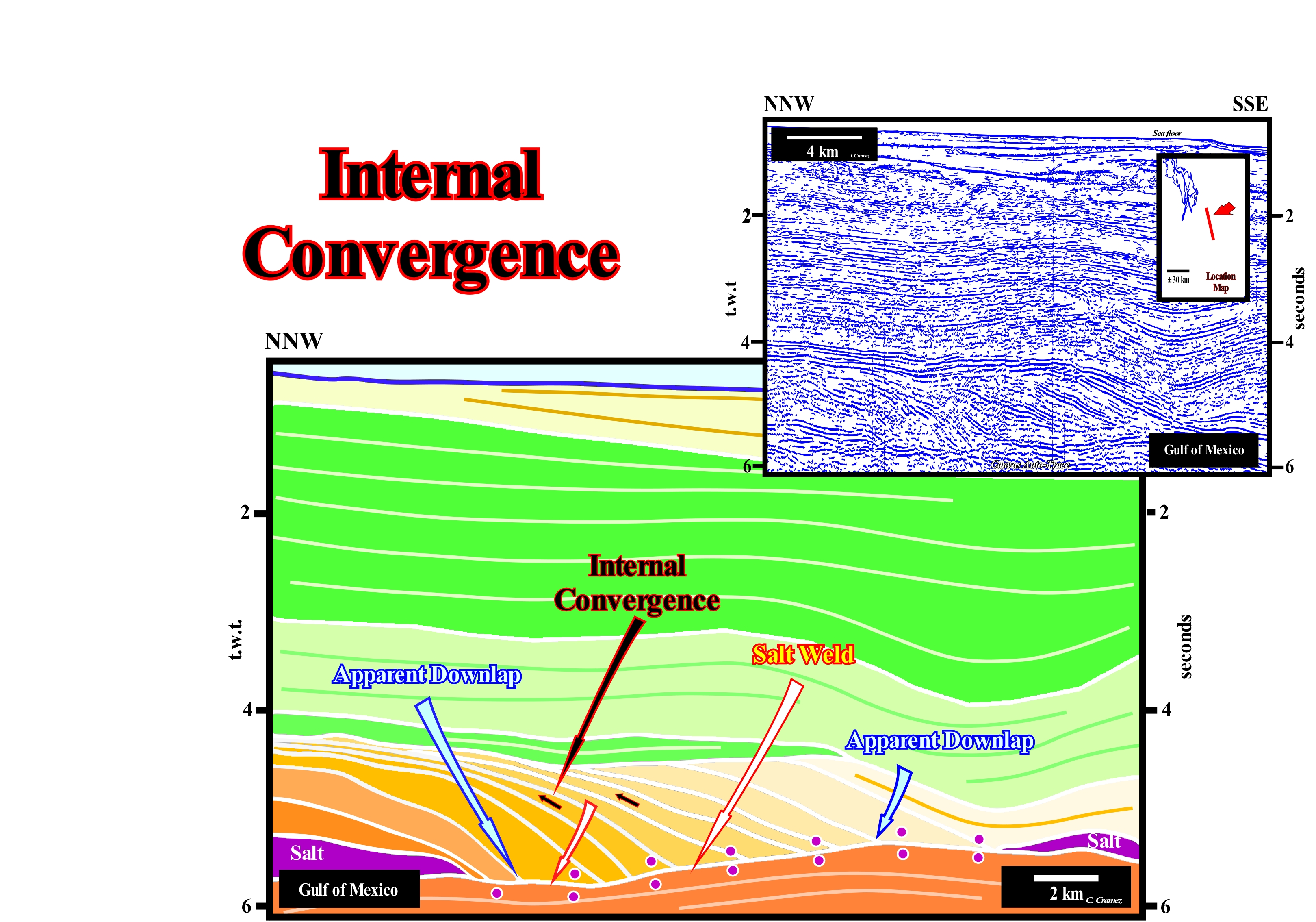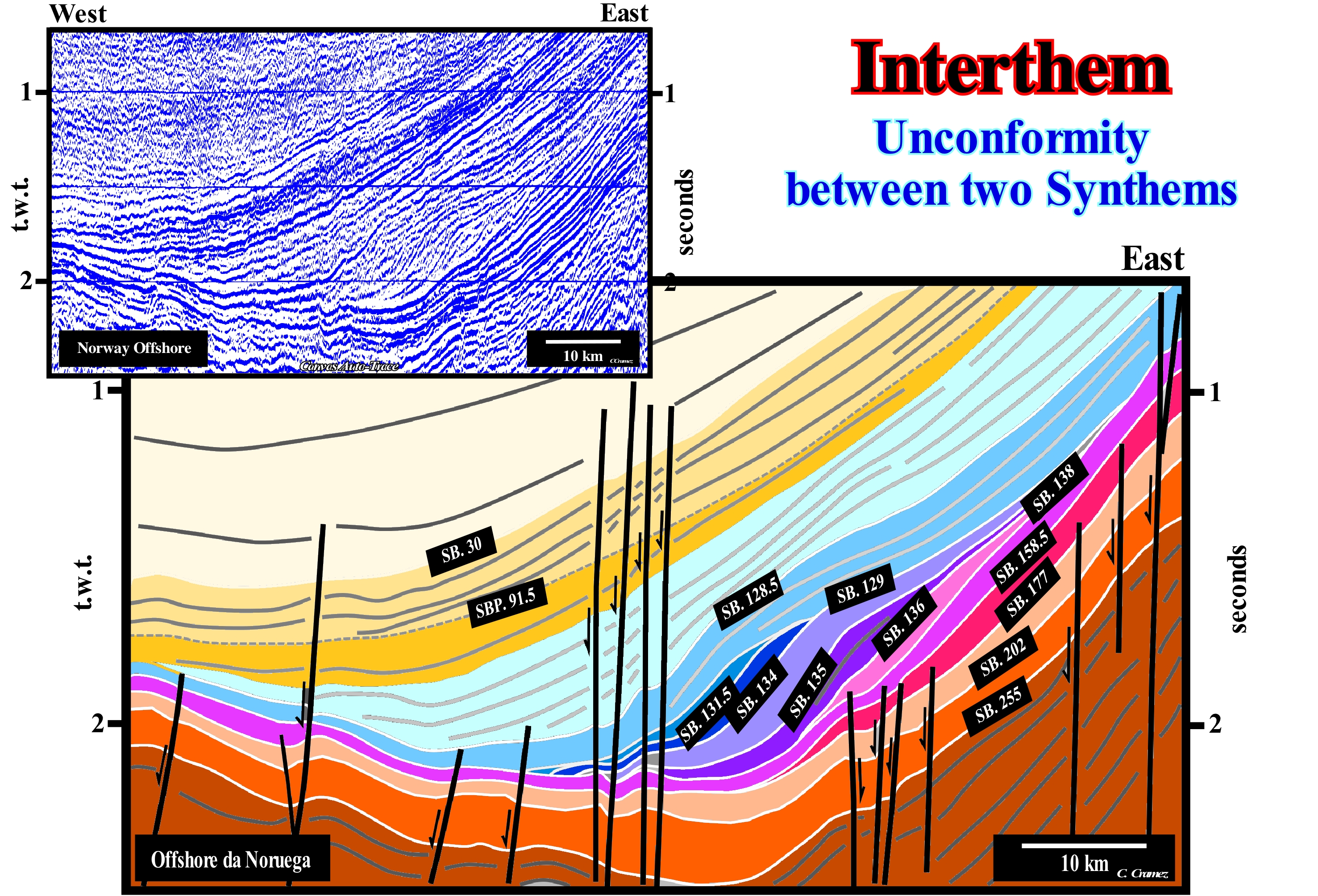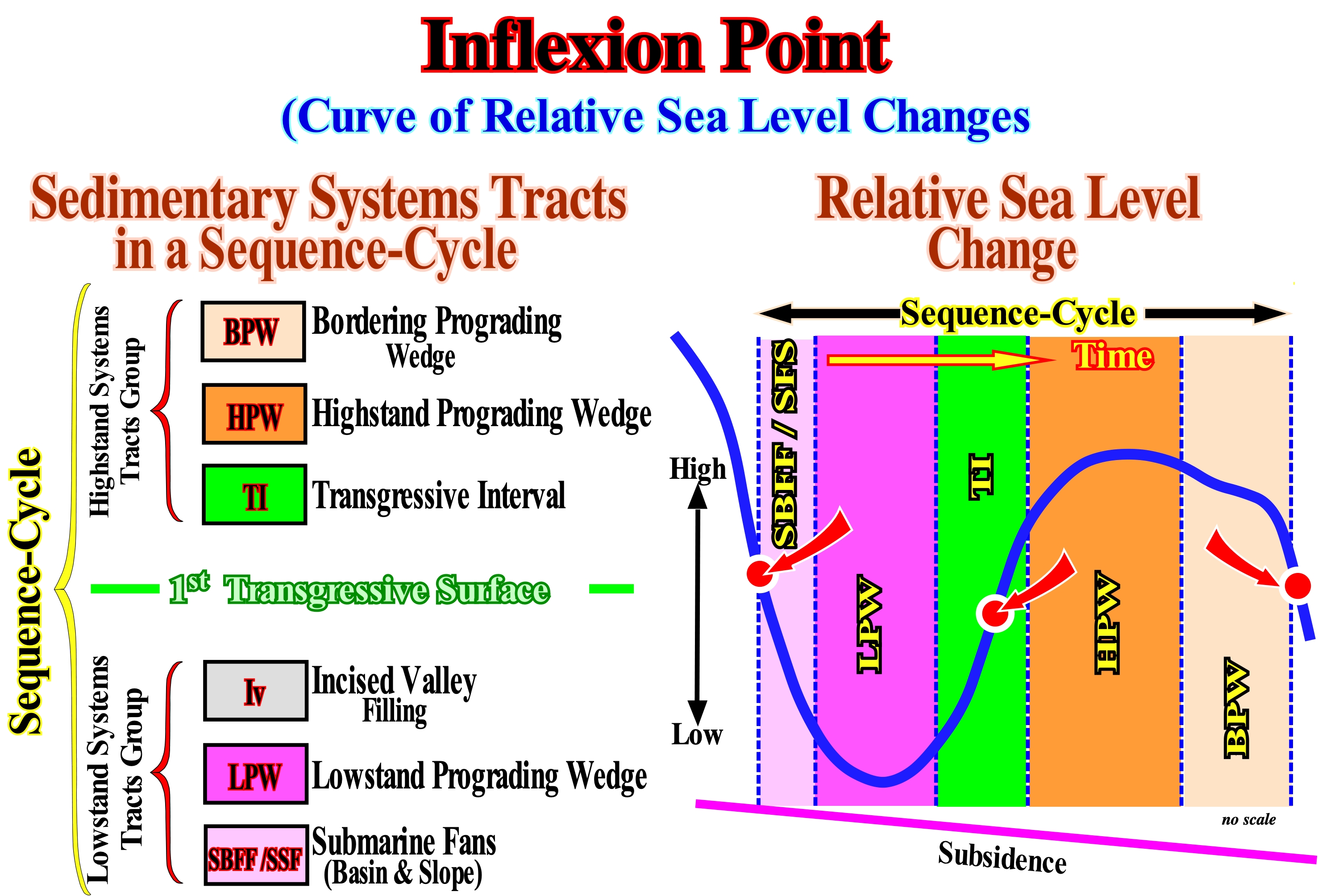 A sequence-cycle, which is induced by a 3rd order eustatic cycle (characterized by a time-duration between 0.5 and 3-5 million years), is limited between two consecutive unconformities (or their correlative water-deep paraconformities), whose age difference does not exceed 3 My (or 5 My for certain geoscientists). When in an tentative geological interpretation, the age difference between two consecutive unconformities, i.e, between two significant relative sea level falls, which put the sea level lower than the basin edge, is greater than 3-5 million of years, the stratigraphic cycle is not a sequence-cycle, but, probably, a continental encroachment sub-cycle. Theoretically, a continental encroachment subcycle is formed by several sequence-cycles, which for various reasons can not be, correctly, identified. When the sedimentation rate is very strong, sometimes, within conventional sequence-cycles (those considered in the sequential chronostratigraphy of J. Hardenbol, 1998) several stratigraphic-cycles of upper hierarchy (high frequency cycles) can be recognized. However, usually, they are incomplete cycles. Certain sedimentary systems tracts sub-groups or even groups are absent. On this tentative interpretation of a Canvas auto-trace of a detail of an offshore seismic line from Kalimantan (Indonesia), it is easy to see that between the unconformities SB. 8.2 Ma and SB. 6.2 Ma, as well as. between the unconformities SB 6.2 Ma and SB. 5.5 Ma (conventional unconformities), which define two sequence-cycles, there are other unconformities that limit stratigraphic cycles of 4th or even 5th order (SB means "Sequence Boundary"). Some of these high frequency stratigraphic cycles are incomplete. They are, fundamentally, formed by the lowstand systems tracts sub-groups, which within a sequence-cyle, from the bottom up are: (i) Submarine Basin Floor (SBFF) ; (ii) Submarine Slope Fans (SSF) and (iii) Lowstand Prograding Wedge (LPW). The micro-paleontological results of the wells drilled along this seismic profile corroborate the hypothesis accepted by the geoscientist in charge of the interpretation that these high-frequency cycles are sometimes incomplete (often formed just by certain lowstand systems tracts sub-groups). When a geoscientist says lowstand, it does not necessarily speaks in deep sediments. In this particular case, the high frequency sequence-cycles are composed, mainly, of lowstand prograding wedges in which the delta depositional systems are preponderant. In this particular case, the high frequency sequence-cycles are composed, mainly, of lowstand prograding wedges, in which the delta depositional systems are preponderant. Lowstand means that relative sea level fall (sea level referenced to a local point of the Earth's surface which may be the sea floor or the base of the sediment and which is the result of the combination of absolute or eustatic sea level and tectonics) and became lower than the basin edge. Under these conditions, the basin no longer has a shelf (continental platform). It has been exhumed and transformed into a coastal plain. In the photograph shown in the upper left corner of this figure, a sequence-cycle, limited by two unconformities (wavy red lines) can be recognized, whose age difference is less than about 2.5 million years. In this area, from the bottom up, it is easy to identify: (i) The lowstand prograding wedge (LPW), coloured in violet, which fossilizes the lower unconformity ; (ii) The transgressive interval (IT), colored green ; (iii) The maximum flooding surface (dashed line of green colour), which is the upper boundary of the transgressive interval (TI) and (iv) The highstand prograding wedge (HPW), coloured in light brown, which is which is limited, superiorly, by the erosion surface (unconformity) which is the upper limit of the sequence-cycle. The retrogradational geometry of the transgressive interval (IT) is not evident, but it is, relatively, easy to see that this interval thickens continentward (NE). Likewise, the progradational geometry of the highstand prograding wedge (HPW) is not very evident, but the thickening seaward (NW) is obvious. On this tentative interpretation, it is interesting to note the lower unconformity of the considered sequence-cycle limits a forced regression deposited above the high-level prism of the preceding cycle-sequence. A forced regression corresponds to a shifting the shoreline and coastal sediments seaward as a response to a small relative sea level fall, i.e., when the shoreline line is forced to progradate, but downward, regardless of the terrigeneous influx. The seaward shifting of the shoreline triggers erosion processes in both non-marine and shallow marine water environments, which means that the river incision is accompanied by the development of coastal deposits. The deposited sedimentary systems tracts emphasizing a forced regression have a typical downward progradational geometry (descendants sedimentary systems tracts of P. Vail).