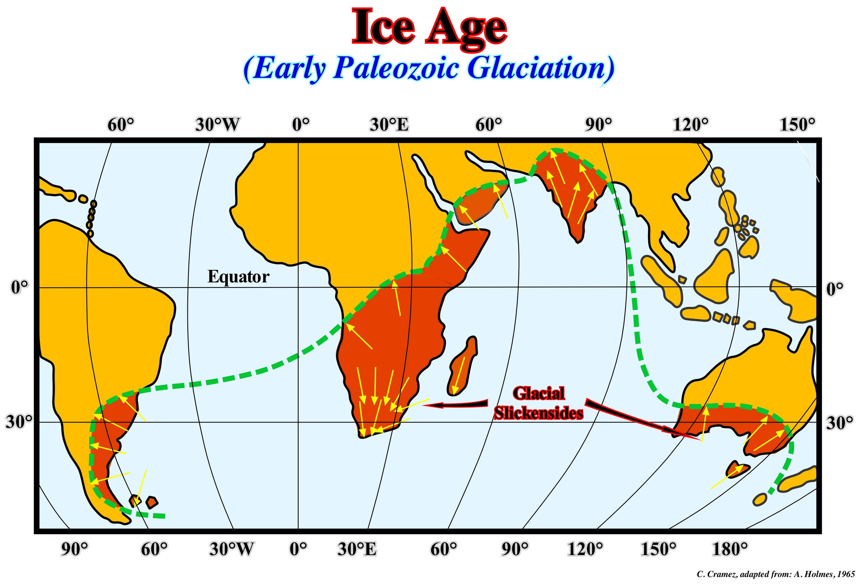 This figure shows the extent of glaciation that occurred during the Early Paleozoic and the mapping of glacial slickensides. These suggest: (a) A drift of the continents and (b) The probable position of the south pole (in relation to the continents). In order to explain the glacial ages, it was necessary to find a mechanism capable of reducing the solar energy received by the Earth's surface, although there is no logical reason to think that the Sun always radiated a constant energy during geological time (the most modern astronomical hypotheses assume that all the stars, like the Sun, increased the luminosity with the time). The brightness of the Sun appears to have increased by 30 to 60% over the last 5 Ga. The study of the Sun's surface shows the existence of cyclical disturbances that appear on average every 12 years and that, in the short term, have an important influence on the Earth's climate. The glacial ages of the Proterozoic may have been induced by the consumption of methane and ammonia from the atmosphere and by the end of a greenhouse effect that seems to have dominated the Early Proterozoic. The formation of the supercontinents can explain the glacial epochs of Precambrian and Late Paleozoic. The other epochs may be partially explained by the shortening and rising of the continents, but the factors most frequently advanced by geoscientists are: (i) Solar storms (solar cycles) ; (ii) Amount of gases in the atmosphere ; (iii) Volcanic activity ; (iv) Quantity of continental crust ; (v) Supernova explosions ; (vi) Revolutions of galaxies and (vii) Cycles of Milankovitch. Note, it takes about 50-100 ky to create a glacial age, but only about 10 ky to destroy it. Fusion of ice does not require an increase in the temperature of all oceanic mass, but only the surface. A deglaciation is faster than a glaciation. The earliest glacial epoch seems to be the Huronian. It, probably, lasted from 2.4 Ga to 2.1 Ga. In the Late Proterozoic, the glaciations of the Cryogenian have frozen the entire planet. However, there seem to have been two main glacial periods, each lasting about 20 My: (i) Sturtian around 700 Ma and (ii) Marinoan there are about 650 Ma. During the Phanerozoic there were three major glaciations: a) Andine/Saharan Glaciation ; b) Karoo Glaciation, which persisted for most of the time of the supercontinent Gondwana and c) Cenozoic Glaciation. The latter may be summarized as follows: (1) In the Early Oligocene, glaciers began to form in the Antarctica, but global temperatures remained, relatively, stable until the Early Miocene and Antarctic glaciation declined during this period ; (2) About 15 Ma ago, the subduction between Central and South America connected the connection between North and South America, preventing the flow of water between the Pacific and Atlantic Oceans, which certainly restricted the transfer of heat from the tropics to the poles, can explain the rejuvenation of Antarctic glaciation ; (3) The expansion of Antarctic glaciation has increased the Earth's albedo, which has promoted an additional cooling cycle ; (4) In the Pliocene (5 Ma) ice sheets began to grow in North America and northern Europe ; (5) The most intense part of the Oligocene/Holocenic glaciation (present glaciation), which is likely to continue in the future, was during the last millions of years ; (6) The Pleistocene was characterized by significant temperature variations (about 10° C) in periods ranging from 40 to 100 thousand years, corresponding to the expansion and contraction of the glacial caps, which have been explained by small changes in Earth's orbital parameters (Milankovitch cycles).