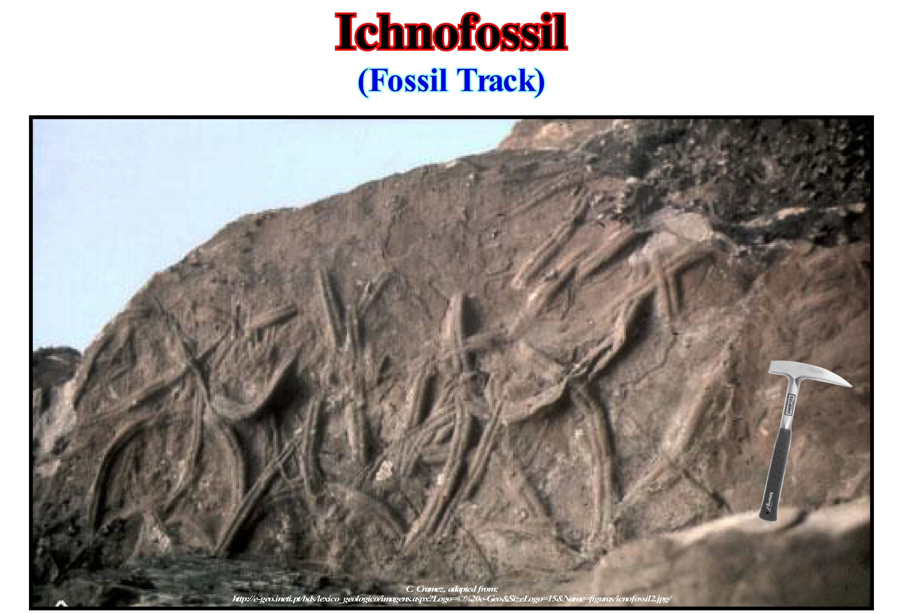 Ichnofossils are vestiges of vital activity (biological activity) of organisms of the past. As an example of ichnofossil we can mention fossils of footprints, tracks of displacement, marks of teeth, excrement, eggs, tunnels, galleries of habitation, etc. Several biological activities may produce ichnofossils: (i) Displacement, footprints, tracks, rails, etc. ; (ii) Food, toothed marks, gastroliths or a stomach stone (rock held inside a gastrointestinal tract), coproliths (fossilised dung), etc. ; (iii) Housing, galleries, dens, tunnels, etc. and (iv) Reproduction, eggs, postures, nests, etc. The fossil features suggest the earliest evidence of animal life on Earth. The earliest traits of arthropods, for instance, are from Cambrian/Ordovician and the tracks in the Ordovician sand allow to determine the behaviour of these organisms. The ichnofossils can give diverse types of information, however, as identical fossils can be created by a series of different organisms, the fossil traces can only inform to us, in a safe way on two thing: (a) The consistency of the sediments at the moment of its deposition and (b) The energy level of the depositional environment. Fossil features are, often, difficult to correlate with a specific horizon. Conventional taxonomy is not applicable, and therefore another type of taxonomy has been proposed. At the highest level of classification, five modes of behaviour are recognized: (1) Domichnia, housing structures that reflect the position of the organism that created it ; (2) Fodinichnia, three-dimensional structures left by animals eating through sediments, such as, for example, lithophages ; (3) Pascichnia, are tracks left by herbivores on the surface of a soft sediment or mineral substrate ; (4) Cubichnia, vestiges of traces, in the form of an impression left by an organism in a soft sediment ; (5) Repichnia, vestiges of traces on the surface of sediments. Many of these fossils are classified into genera, some of which are further subdivided into one species. The classification is based on the implicit form and mode of behaviour. Among the most common genera of ichnofossis are: Asteriacites, Chondrites, Climactichnites, Cruzianas, Entobia, Gastrochaenolites, Petroxestes, Protichnites, etc.