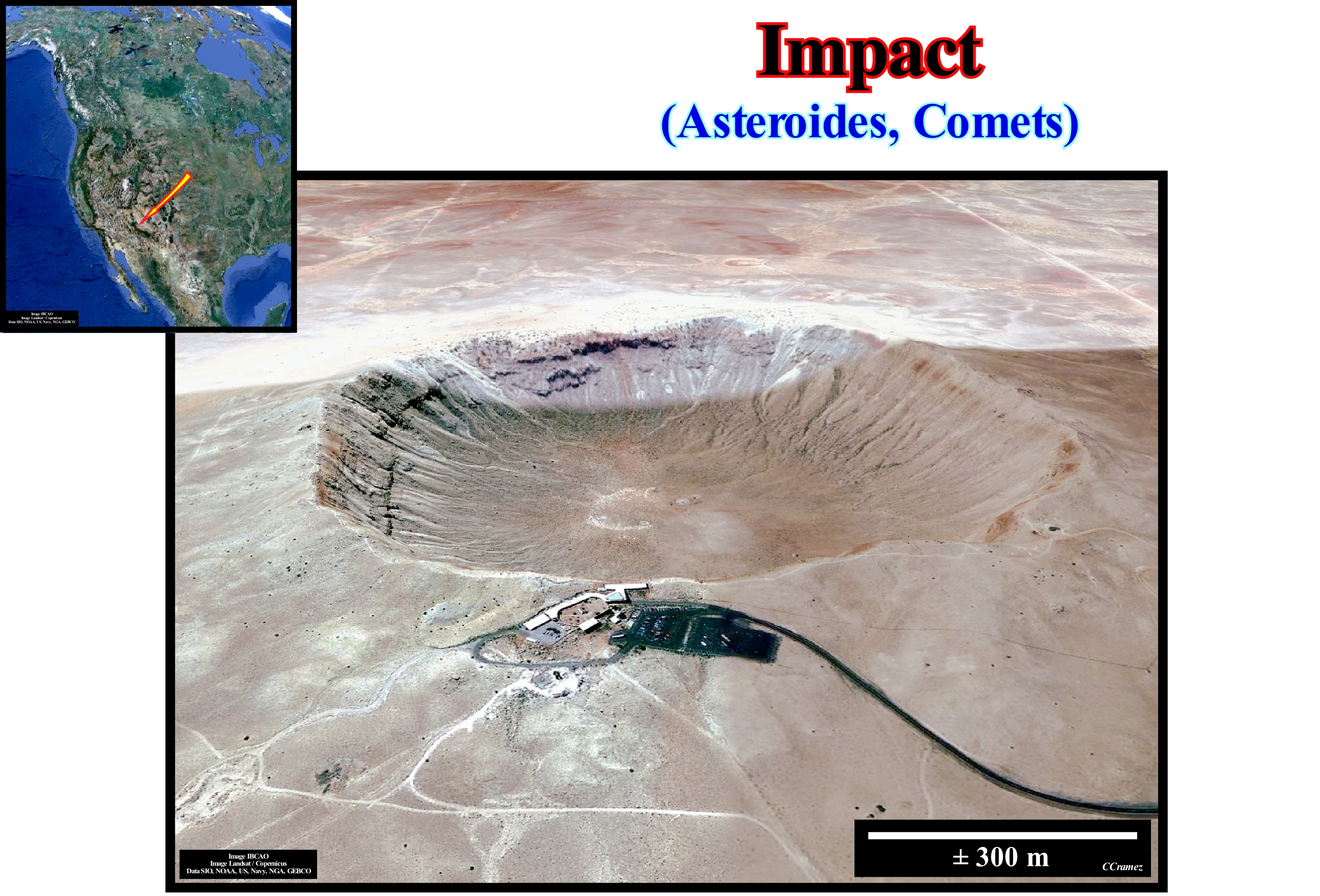 Structure formed on the Earth's surface by the fall of an asteroid or a comet. The impacts of asteroids and comets occurred, relatively, frequently during the Quaternary. One such impact created an important crater in Arizona, about 1,200 meters in diameter and 180 meters in depth.