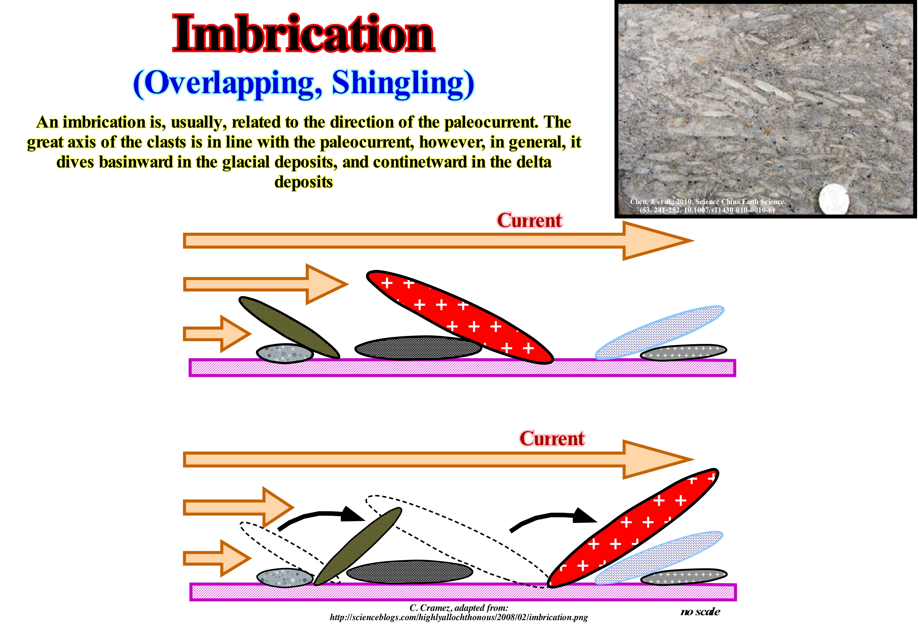 In sedimentology, as suggested in this figure, imbrication refers to a primary deposition pattern constituted by a preferential orientation of the clasts so that they overlap one another in a manner, more or less, consistently, somewhat like a series of overturned dominoes. This type of clast orientation allows geoscientists to determine the direction of the original currents. The imbrication of clasts is, mainly, observed in conglomerates and, in certain cases, vulcano-clastic deposits. It can also be observed in certain aeolian deposits. As in conglomerates the shape of many clasts is, approximately, that of an ellipsoid. Three main axes can be seen: (i) The main axis, also called the major axis or A axis ; (ii) Intermediate axis or B axis and (iii) Small axis or C axis. Many geoscientists consider two main types of imbrication: (A) Imbrication along A axis, in which the main (longer) axes of the clasts are oriented parallel to the direction of current flow ; (B) Imbrication according to the plane AB, in which the major axes of the clasts are oriented perpendicular to the direction of flow and (C) Imbrication supported in plane AB, with the intermediate axes of the clasts in the direction of flow of the current. The imbrication along A axis is characteristic of clasts transported in suspension and, therefore, it is just preserved in the case of a fast flow in which the clasts are deposited without any significant bearing. This pattern is typical of conglomerates of the basin floor fan (layer A), but is also, occasionally, observed in alluvial fan reworked by floods. The imbrication according to the AB plane is characteristic of entrainment clasts. This imbrication is formed, for example, when the clasts roll at the base of a channel. As shown in the diagram below, the flattened clasts roll over the downstream clasts and deposit against them with their downstream end resting against the lower clasp, which may be used to diagnose the original flow directions.