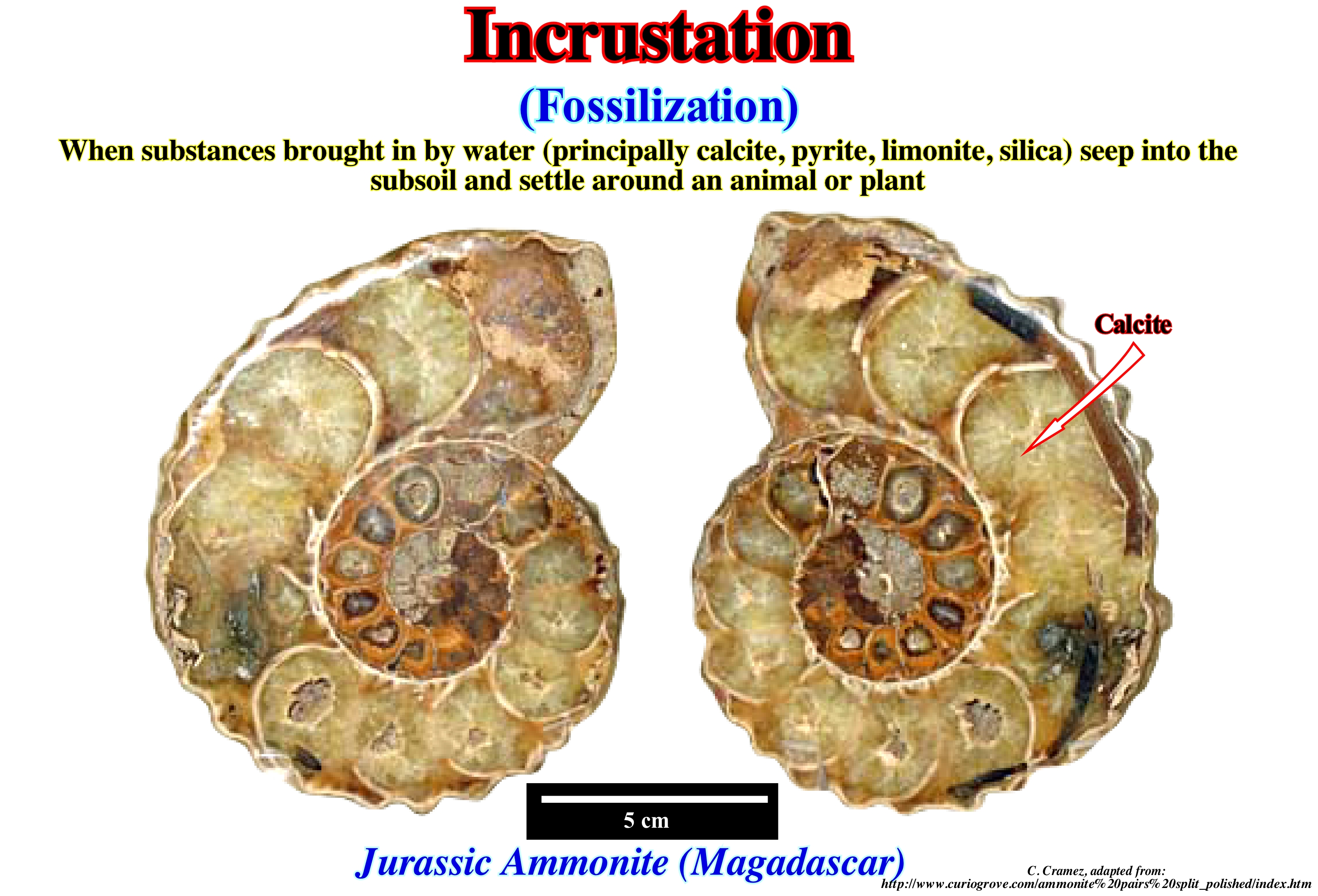 As shown in this figure the incrustation is the process of fossilization, which, usually, occurs in sedimentary deposits. relatively, recent tin contact with a limestone source. When a mineral-laden water flows over an organism, the mineral substances can be deposited by incrustation and form a fossil by negative impression. There are other cases of fossilization in fine-grained limestone which have such a rapid consolidation that preserves the more delicate parts of organisms such as the famous fossiliferous deposits of Solnhofen, in Germany, or the famous layers of carbonated shales of Burgess, in Canada. The deposits of Solnhofen (Jurassic) preserved one of the richest fossil faunas in the world. Burguess carbonate shales have conserved organisms from the Middle Cambrian that have made it possible to better understand the evolution of Earth's life. During the burial of fossiliferous rocks, often, the initial elements of the organism remains can be replaced by other elements. It is what the geoscientists call epigenization, i.e., the transformation of a pre-existing mineral into a rock (or a rocky element) into another mineral with the same composition as the chemical composition, by a rearrangement of the crystalline structure, creating a form more stable. Basically, according to the nature of fossilization, three large families of fossils can be distinguished: (i) Fossils by Compression ; (ii) Fossils by Petrification and (iii) Fossils by Incrustation. The former are perhaps the most common and form as a result of organisms or their parts in the sediments, than with burial become flattened due to the geostatic pressure (weight of the sediments). The second are the fossils that hold both the external form and internal structure by a process of mineralization that preserves the vast majority of the cells of the tissues. In fossils by incrustation, the outer form of the organism is preserved as a mold, but the internal structure is destroyed, since deposition occurs in the form of a hard coating around the organism.
