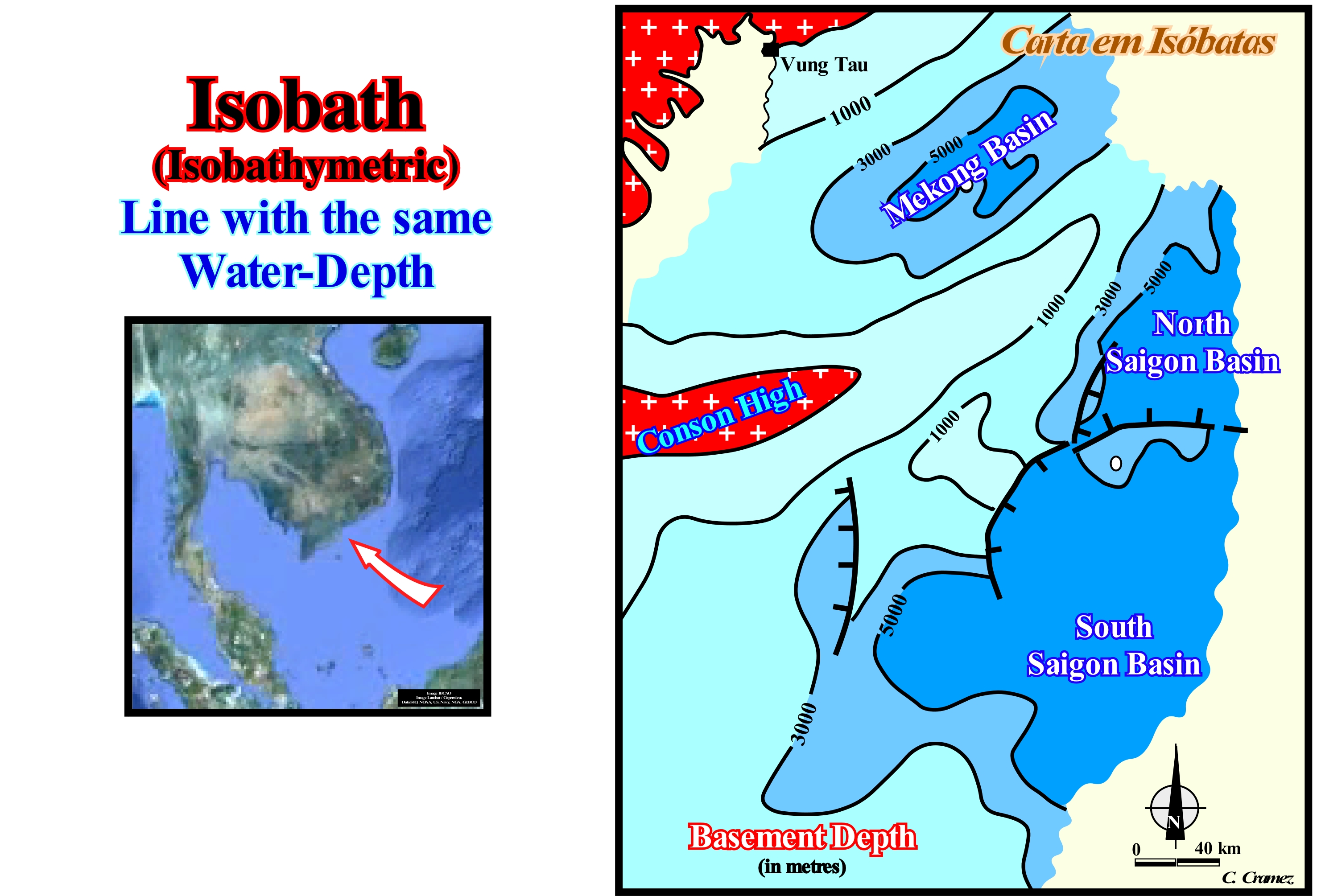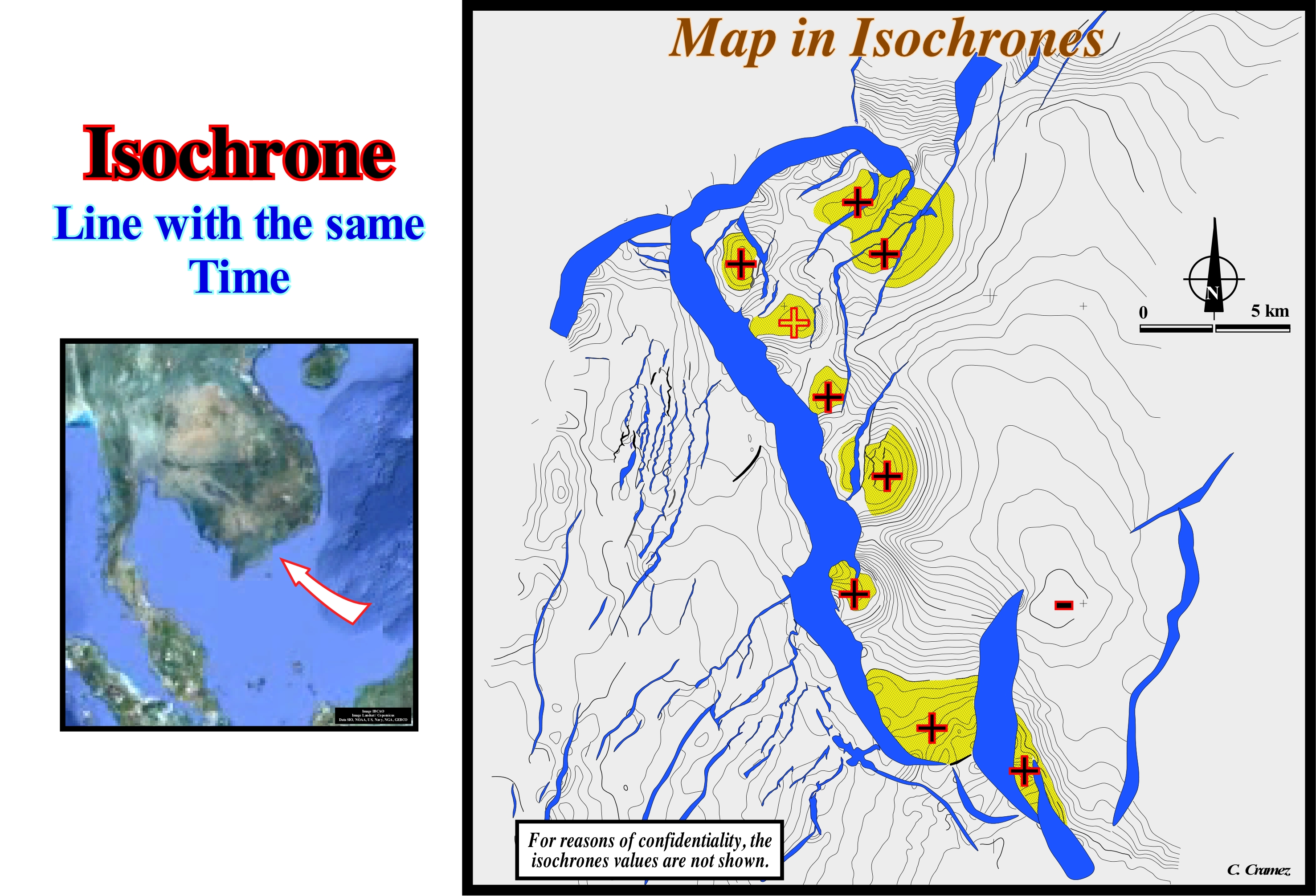 This maps illustrates a double-time structural map of a seismic horizon in Vietnam offshore, in which the Isochrone values were omitted for reasons of confidentiality. The isochrones allow, easily, to identify zones with smaller values, that is, less deep (underlined by +). These areas underline bell-shaped antiforms (as an anticline), but are induced by an extensional and not by compressional tectonic regime, as it is the case of an anticline (in this offshore, anticline structures occur, locally, in association with a reactivation of old normal faults in reverse faults). A geoscientist can use different contour maps: (i) Total Drilled Thickness Map Map, which shows the vertical thickness of a stratigraphic unit traversed by a vertical exploration well ; (ii) Stratigraphic Thickness Map, which shows the thickness of a stratigraphic unit measured perpendicular to the surfaces that limit it (the stratigraphic thickness is equal to the drilled thickness multiplied by the cosine of the dip of the drilled stratigraphic unit) ; (iii) Isopach Map, which shows the variations of stratigraphic thickness of a formation or geological interval using the isopachs (imaginary lines connecting points with the same stratigraphic thickness) drawn through the points where the formation has the same thickness ; (iv) Drilled Thickness Map, showing the drilled thickness variations, regardless of the true stratigraphic thickness ; (v) Isolith Map*, which is a map constructed from the imaginary lines, which connect the points with similar lithology and that separate the rocks of different nature (colours, textures, etc.) ; (vi) Facies Map, which shows the lithological variations within a stratigraphic unit ; (vii) Sub-crop Map, showing paleogeography under an unconformity, generally, tectonically enhanced (angular unconformity) ; (viii) Isochronous Map, showing the changes in depth (double time) of a given horizon (an isochrone is an imaginary line connecting points with the same reflection time).