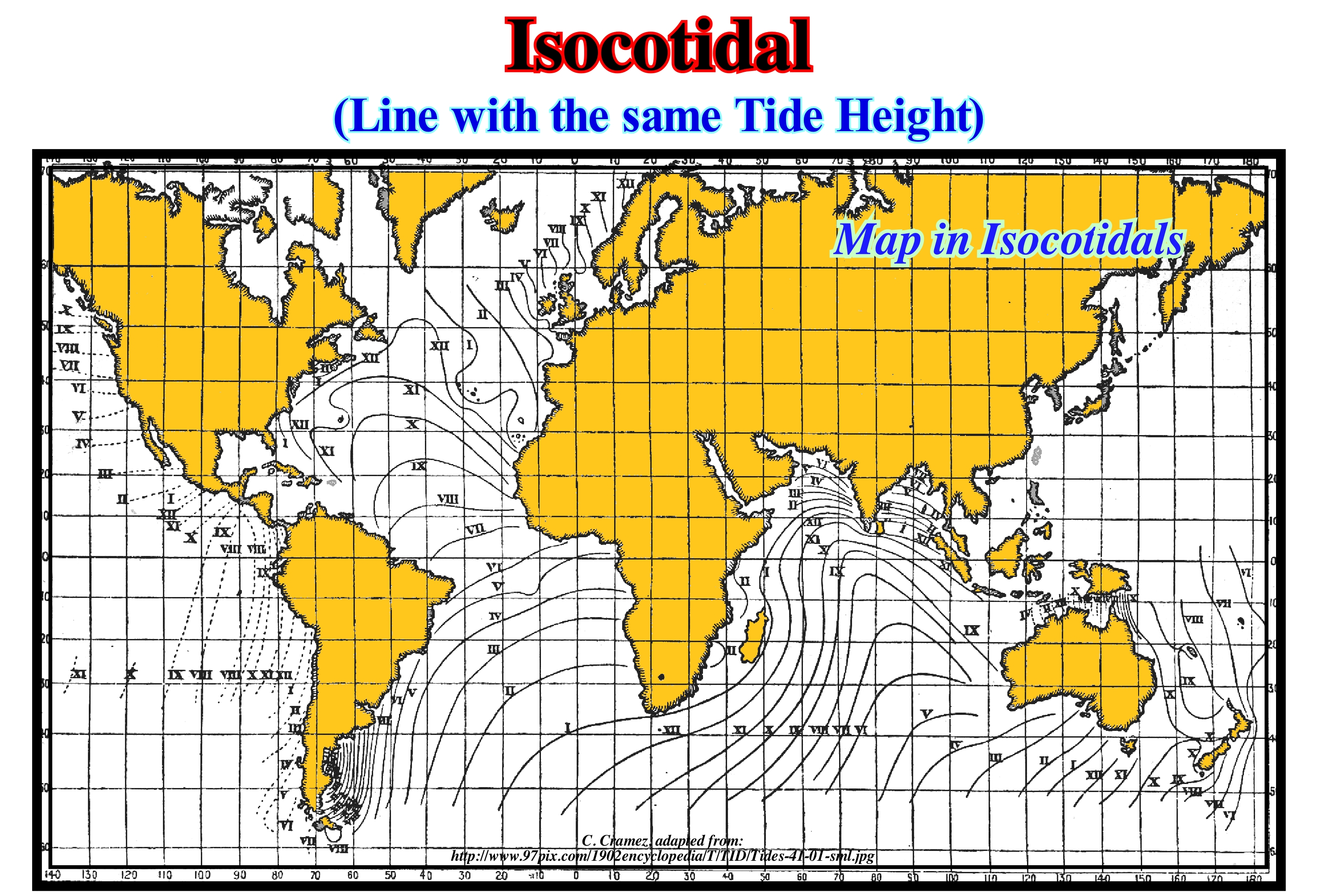 (*) For several geoscientist a cotidal line, is a line on a map passing through places having high tides at same time.