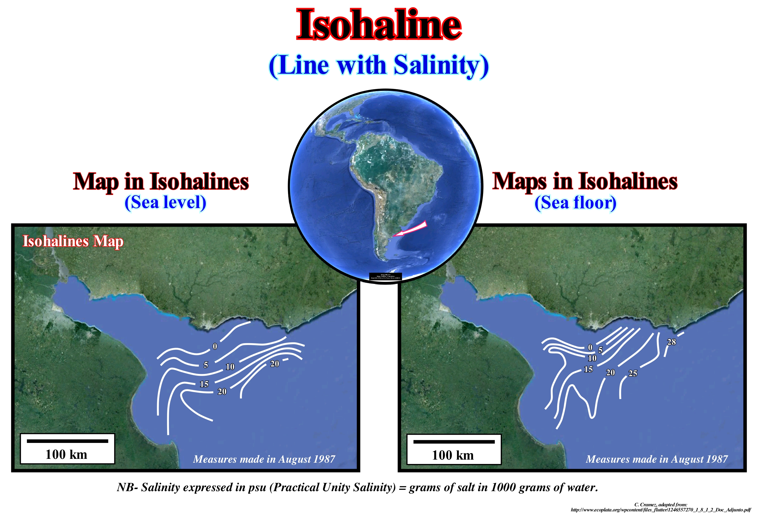 These two isohialine maps made in August 1987 at the mouth of the Rio de La Plata (Argentina), clearly, show that salinity at sea level is smaller than at the bottom of the sea. Isohaline lines, expressed in "pus" ("Practical Unity Salinity"), that is, in grams of salt per 100 grams of water, are more distal in the sea floor than at sea level. This situation suggests that the flow of the Rio de La Plata is a hypopycnal flow, that is to say, the water flow of the river is less dense than that water-body into which it enters (South Atlantic Ocean). The water of the river, whose flow is that of an axial jet, entering the ocean, the sediments which it transports, disperse at the sea surface. Later, little by little, the sediments deposit in the bottom of the sea forming hemi-pelagites (deep-water deposit in which more than 25% of the particle fraction has a size greater than 5 micrometers). Under these conditions, highstand turbidite deposits are unlikely to be deposited on the sea floor near the river mouth (Mutti model). If a relative sea level fall puts the shoreline lower than the basin edge, i.e., if current highstand conditions change to lowstand geological conditions, the continental shelf will be exhumed and the provisional equilibrium profile of the Rio de la Plata will be broken. Therefore, the river mouth will be made at the top of the continental slope and the sedimentary particles carried by the river will be transported downstream by turbidity currents. As long as these currents reach the lower break of the continental slope (limit between the continental slope and the abyssal plain), the velocity of the currents will decrease, as well as, its carrying capacity. Such a decrease in the velocity of the currents induces the deposition of the transported sedimentary particles in the form of submarine slope and basin floor fans. The submarine slope fans will have a, more or less, wavy geometry (overbank deposits, natural marginal dikes, i.e., levees, and late fills of the depressions and turbiditic "channels"), while the submarine basin floor fans have a, more or less, horizontal geometry.
