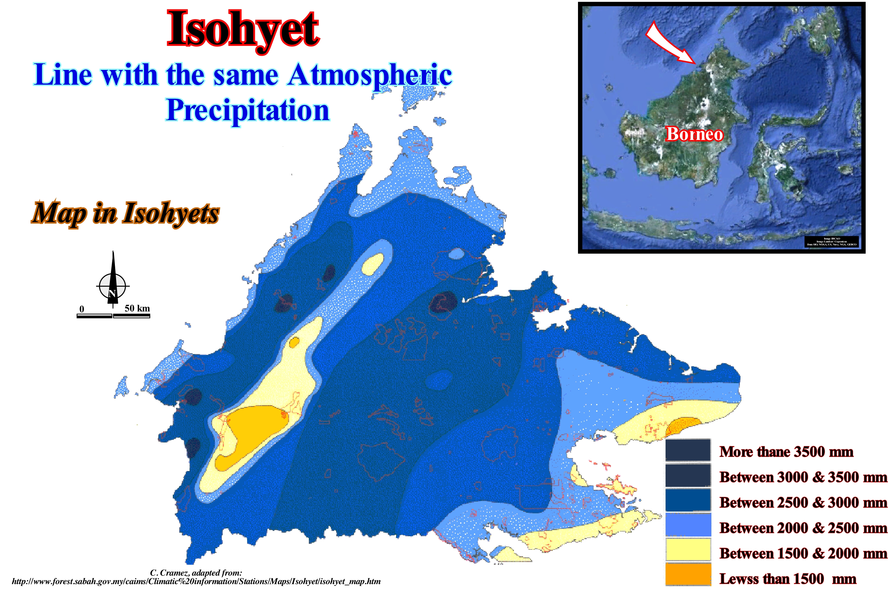 This map in isohyets (millimeters of rain per year) from northern Borneo (Sabah) indicates the region's rainfall. it is interesting to note that the areas of lower rainfall are the coastal zones and the zones of higher altitude. This type of maps is important for locating areas of heavy rainfall and areas where river floods are most likely, what allows to predict the most likely occurrence of highstand turbidic deposits. There are two types of deep-water turbidite deposits. The first type (P. Vail model) occurs under lowstand geological conditions (sea level lower than the basin edge that may or may not to coincide with the continental edge), after a significant relative sea level fall. A significant relative sea level fall exhumes the continental shelf, as the river mouths move to the upper part of the continental slope, which causes a rupture of the provisional equilibrium profiles of the water-courses and, mainly, of great rivers. Such a rupture will force the rivers to incise their beds, to re-establish a new provisional equilibrium profile (the theoretical equilibrium profile is never reached), which, significantly, increases the terrigeneous influx, which is discharged at the mouth, i.e., on the continental slope. With the sedimentary particles carried to the water-courses mouth can not be deposited on the slope, they are transported toward the deep parts of the basin, by turbidity currents, where they are deposited either in the form of submarine basin floor fans or submarine slope fans. The second type of turbidite deposits (E. Mutti model) occurs in highstand geological conditions, i.e., with the sea level higher than the basin edge, which happens when the basin has a significant shelf. In these conditions, in areas with heavy rainfall, which can be suggested by isohyets maps, and with an appropriate topography (important mountainous and a little extensive alluvial plain, that is, with bayline near the coastline), floods and very frequent carries too much sediment to the coastline, which are transported by turbide currents to the deeper parts of the basin where they will be deposited as turbidite fans.