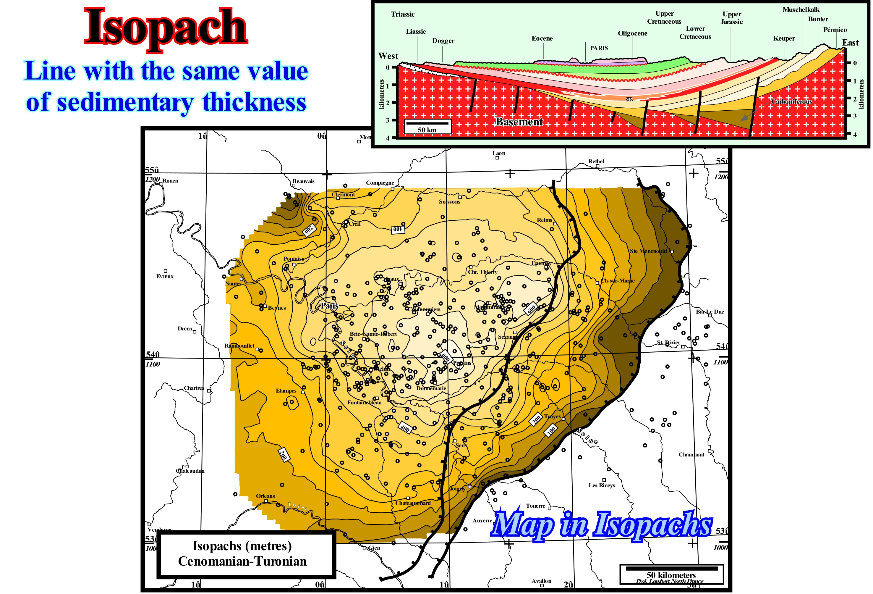 The isopach map (meters) shown in this figure represents the Cenomanian-Turonian chalk thickness of the ParisGeographic Basin made from the well results drilled in this basin (each well is underlined by a small circle). As can be seen, the thickness of this formation is greater in the central part than in the edges, which is normal in almost all the sedimentary basins, since the subsidence increases towards the central part of the basin. However, the case here is somewhat different. The term "Paris Basin" is, for many geoscientists, an abuse of language. Indeed, many geoscientists consider that the so-called "Paris basin" does not correspond to a depocenter, i.e., a sedimentary basin, but rather to a vertical succession of platform deposits that later were lifted to the East and West, which gives to the whole a, more or less, circular geometry similar to that of a basin. In this geological section, practically, no interval thickens, in a significant way, to the zone of greater burial. Indeed, this map in isopachs does not translate to the subsidence responsible for the creation of most of the available space for sediments (accommodation), but more likely it underlines the erosion that the sedimentary interval has undergone. In continuity of sedimentation, i.e., in the absence of significant relative sea level falls, which create important unconformities (erosional surfaces), an isopach map, in meters, of a given sedimentary interval, emphasizes the depositional environments, where the thickest part, generally, corresponds to the continental slope and to the development of the basin edge (boundary between the continental slope and the platform or the alluvial plain, when the basin has a platform). When a map is in time, it is important to make a depth conversion before advancing any kind of conjecture or geological hypothesis.