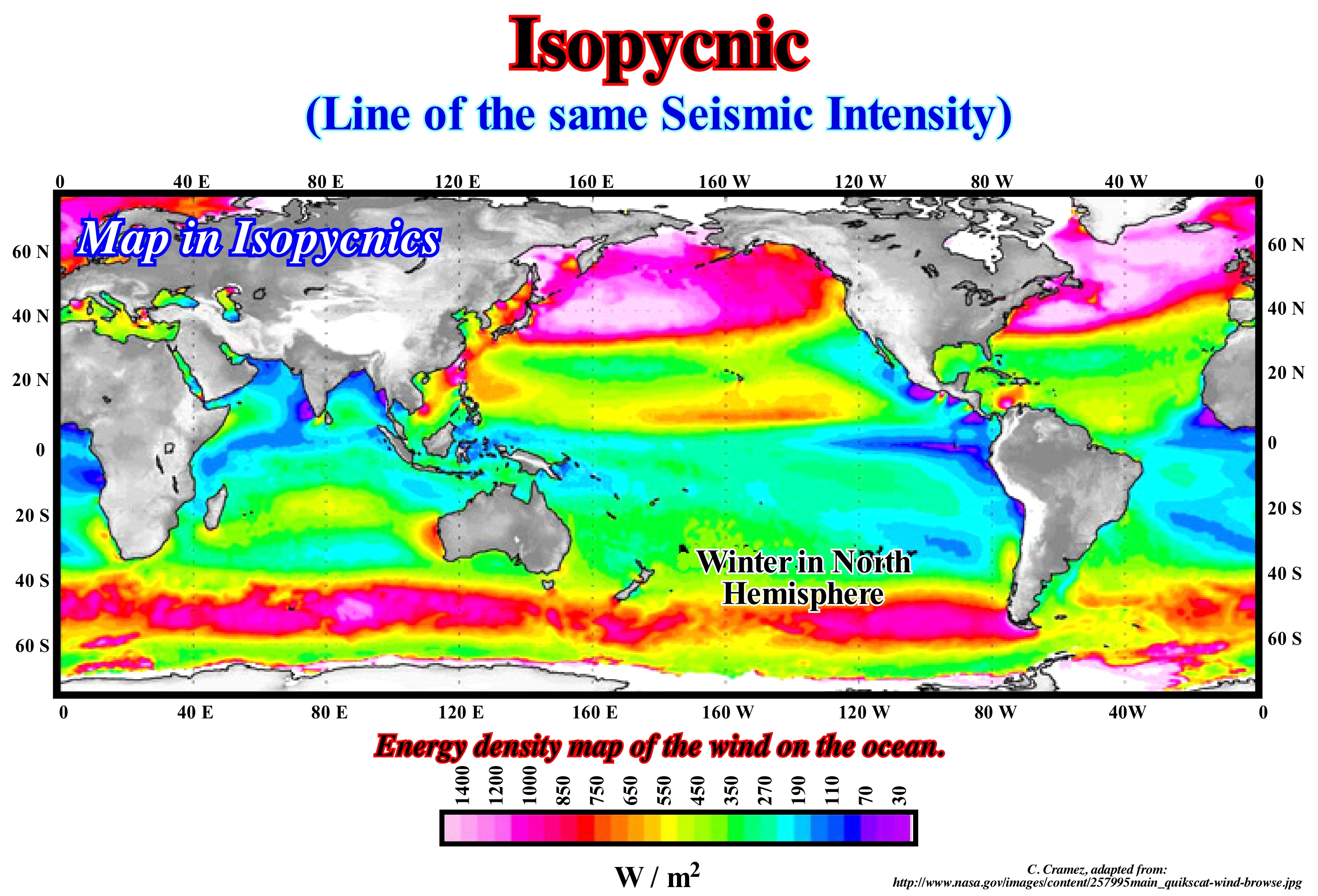 This map in isopycnics of wind energy over the ocean suggests that the strong densities are located at high latitudes and near the equator, which underlines the Hadley, Ferrel cells as well as the polar cells. An Hadley cell is a closed-circulation model of the terrestrial atmosphere prevalent in equatorial and tropical latitudes. This circulation is, intimately, related to the trade winds, the humid tropics, subtropical deserts and jet streams. Hadley's circulation is caused by the transport of heat from the equatorial zones to the middle latitudes, where the amount of incident solar radiation is usually much smaller. The Hadley cells extend from the Equator to latitudes of approximately 30° in both hemispheres, which is, indirectly, quite visible in this isopycnal map. This heat is transported in a cellular motion, with the air ascending, by convection, in the equatorial regions and moving to the upper latitudes, by the higher atmospheric layers. The rise of hot air in equator is accompanied by the frequent formation of convective storms in the so-called Intertropical Convergence Zone. Ferrel's cells are circulation cells that are created at the Earth's mean latitudes or any other rotating planet to balance the transport performed by the Hadley and polar cells. The movement of air in a Ferrel's cell is opposite to the Earth’s rotation. The Ferrel and Hadley cells are found in the subtropical latitudes between 30° and 35° degrees north and south, a region which is under a high pressure ridge called the high sub-tropical (horse latitudes), which is characterized by a weak rainfall and variable winds mixed with periods of calm. Polar cells are atmospheric circulations that form in the region of the poles. The dense cold air descends from the poles, which creates a high pressure. This subsidence of the air in the vicinity of the poles produces a surface current towards the equator, which is diverted, forming the eastern polar winds, in both hemispheres. Cold air moves along the surface to lower latitudes. Around 60° degrees north and south, the air was heated and rises up, creating a low pressure zone.