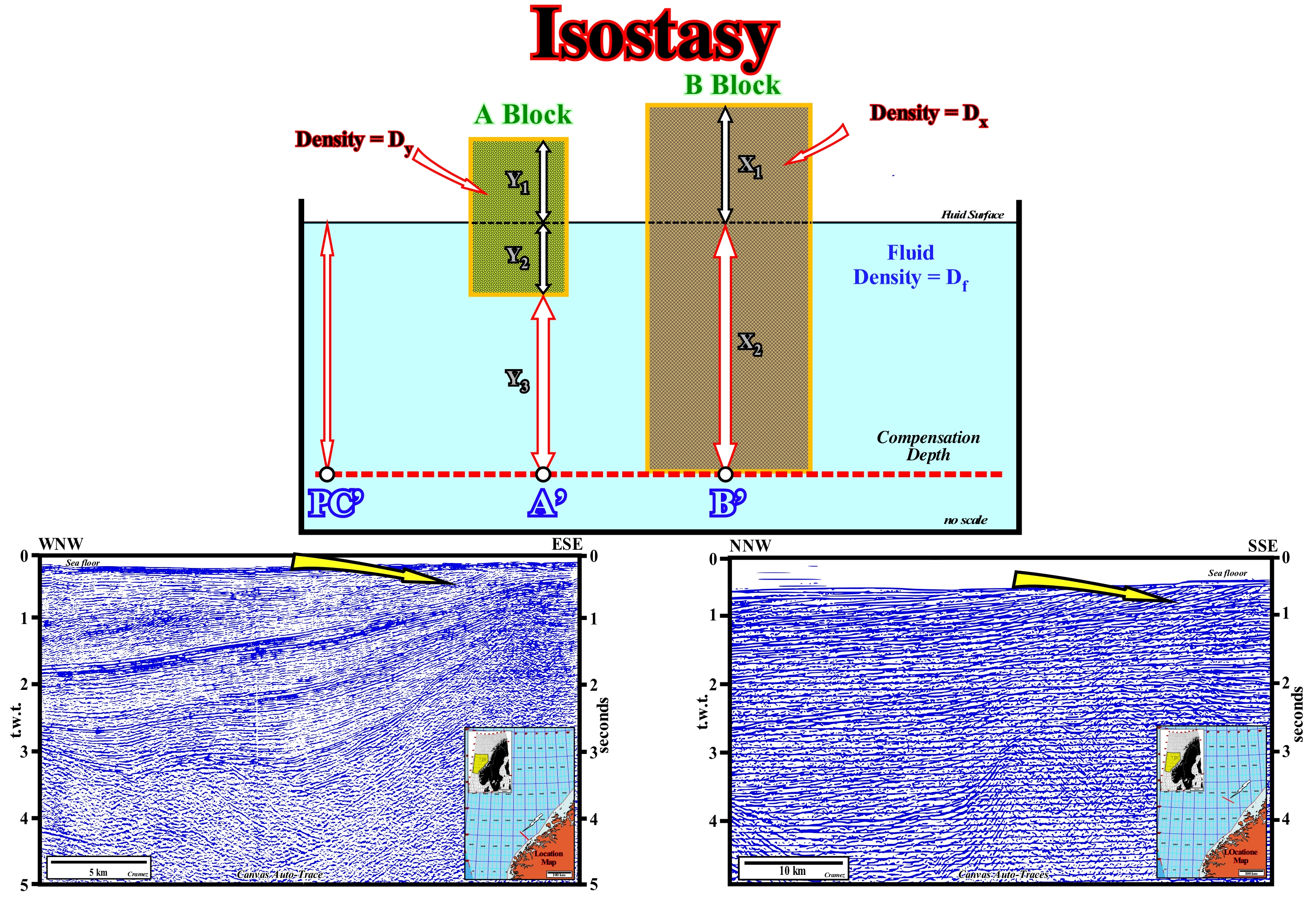 The principles of isostasy are illustrated in this figure: (i) Two blocks A and B, of density Dy and Dx, float in a liquid of density Df ; (ii) The pressure at points A', B' and PC' must be the same (pressure at the compensation depth); (iii) Thus: X2 x Df = (Y2 + Y1) x Dy + Y3 x Df = (X1 + X2) x Dx ; (iv) Knowing the density of the fluid (Df) and the values of X1 and X2 or of Y2 + Y, the density of the blocks can be determined. Since the charge decreases, one of the consequences of isostasy is the isostatic rebound or isostatic uplift (also known as a crustal rebound). In areas that have been covered by Quaternary ice caps, such as northern Europe and Canada, the cliffs of beaches and dunes are, currently, about 300 meters above sea level. For an ice thickness of 2,000 meters, similar to the one that exists today in Greenland, the terrain sinks about 700 m. The ice density is about one third of the density of the mantle. The 14C dating of the sea shells and plant remains indicate that the isostatic uplift postdate the glaciations (less than 14,000 years), which means that the cliffs and dunes formed at sea level and that despite the sea level rise (glacio-eustasy), they were further raised by isostasy. In the areas where the uplift was well dated by 14C, it was done with an exponential decreasing rate. Half the recovery time is several thousand years. Thus, northern Europe and Canada continue to regain their original position, albeit much more slowly than initially, that is, at the beginning of deglaciation. In these areas, the old port facilities (hundreds of years ago), such as those of the Vikings and Greeks are today several kilometers landward of the coastline above sea level. The isostatic uplift, provoked by the melting of the ice sheets, is very visible in the seismic lines of the North Sea, as illustrated by the Canvas auto-traces in this figure. In fact, a few kilometers from the coastline, the sediments deposited, initially, more or less, sub-horizontally, as the submarine basin floor fans were raised (lengthened and tilted) once the continent has suffered and still suffers an isostatic rebound. The uplift of the sediments increases toward the mainland. The same is true for the continental slope sediments which, following the isostatic uplift, exhibit a seaward dip far higher that the dip permitted by the critical angle of stability. This isostatic uplift is well known in Norway's topographic and tax services, as the area of coastal farms increases regularly (the first measures date back to the fifteenth century), once the shoreline moves seaward (relative sea level fall). In conclusion, isostasy is the geological translation of the hydrostatic impulses described by Archimedes principle: "A body totally or partially submerged in a resting fluid receives a pulse from the bottom up. which equals the volume equal to the weight of the fluid it moves. " This force called Archimedes' impulse or hydraulic impulses, is measured in Newtons, and is calculated by the following formula: E = Pe V = ρf g V or when determined to compare it with the weight of the object: E = Pe V = ρf g V, where "E" is the pressure [N], "Pe" is the specific gravity of the fluid of [N / m3]2, "Rf" is the density of the fluid, "V" is the volume of fluid displaced by a body immersed partially or completely therein, "g" acceleration of mass mass m. Thus the impulse depends on the density of the fluid, volume of the body and gravity therein. The impulse (in the simplest described conditions) acts vertically upward and is applied in the centre of gravity. This point is called the impulse centre. In order to get equilibrium in a lithospheric plate, if there is an increase in weight (existence of topographic elevations or the presence of sediments or masses of ice or water), it implies a corresponding sinking of the plate, and vice versa. However, this process takes place on a geological time scale and is subject to the homoeostasis* resulting from the complexity of the geological system. The lateral flows necessary to adjust for variations are very slowly occurring: Scandinavia continues to rise slowly (about 9 mm/yr) by isostatic adjustment as a result of the disappearance of the ice of the last glaciation, and will continue for many hundreds of thousands of years.