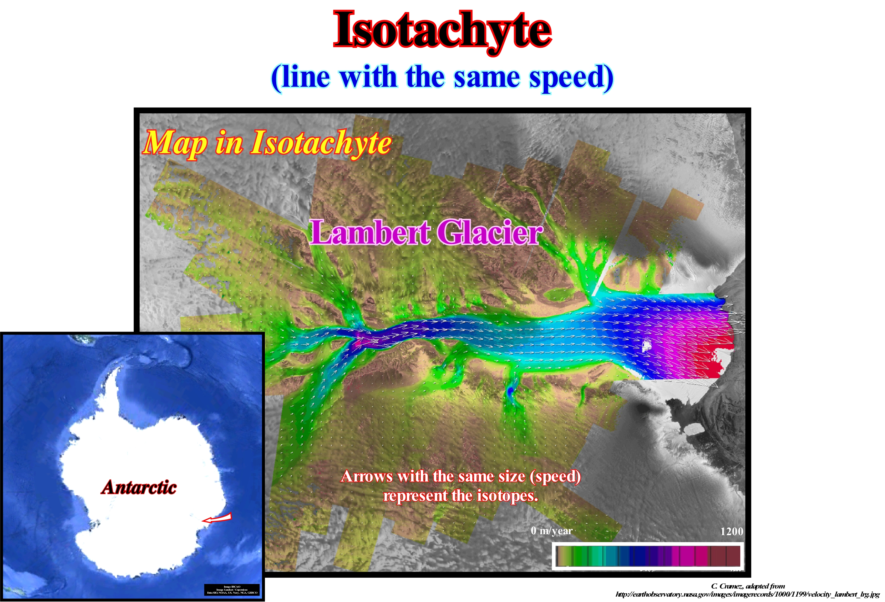 The speed of flow of a glacier is best understood by the glacier isotachyte maps. The flow of glaciers is an important process in the cold mountains and polar regions. The glaciers move downhill, showing various velocity patterns within the flow system and shape the terrain. The flow is influenced by the gravitational force, tectonic conditions, climate and climatic changes, weathering, water cycle, etc. Therefore, the surface of a glacier, like all other elements that make up it, change in space and time. The quantification and visualization of the movements of the surface of a glacier is important for the understanding and modeling of the dynamic processes involved in the ice flow, as well as to estimate the system response to the environmental conditions he changes. In isotachyte maps, in most cases, the results of the displacement measures are visualized by static vectors, which represents the amount of displacement (and speed, respectively) for each chosen point. The vectors have their starting point in place of the object located in a first picture and point in the direction of the corresponding object in a second picture taken later. The length of the vector is proportional to the calculated speed. In its simplest form, the velocity field is visualized with these vectors only, without any symbolization or complementary information. For better orientation, this view is often combined with terrain information, such as contour lines, relief shading, and/or ortho-images (image, which when displayed in digital form, represents the projected features orthogonally with a constant corrected scale of the displacement due to the relief and inclination of the chamber being thus geometrically equivalent to a map). In this way, similar measures can be taken to those that are made on a map. In addition to the vector field, the isotopes can be overlapped to support the overview of flow conditions. Visions only of isotachytes (without vectors) can be used to provide an overview of the velocity conditions on the surface of the glacier, but information on the directions of flow must be deduced. Either way, a glacier flows downhill which means that since a glacier does not flow downstream it no longer exists. The term retreat from a glacier is, in our view, a language error. A glacier can not flow updip. We prefer to say that a glacier slims and not that a glacier retreats.