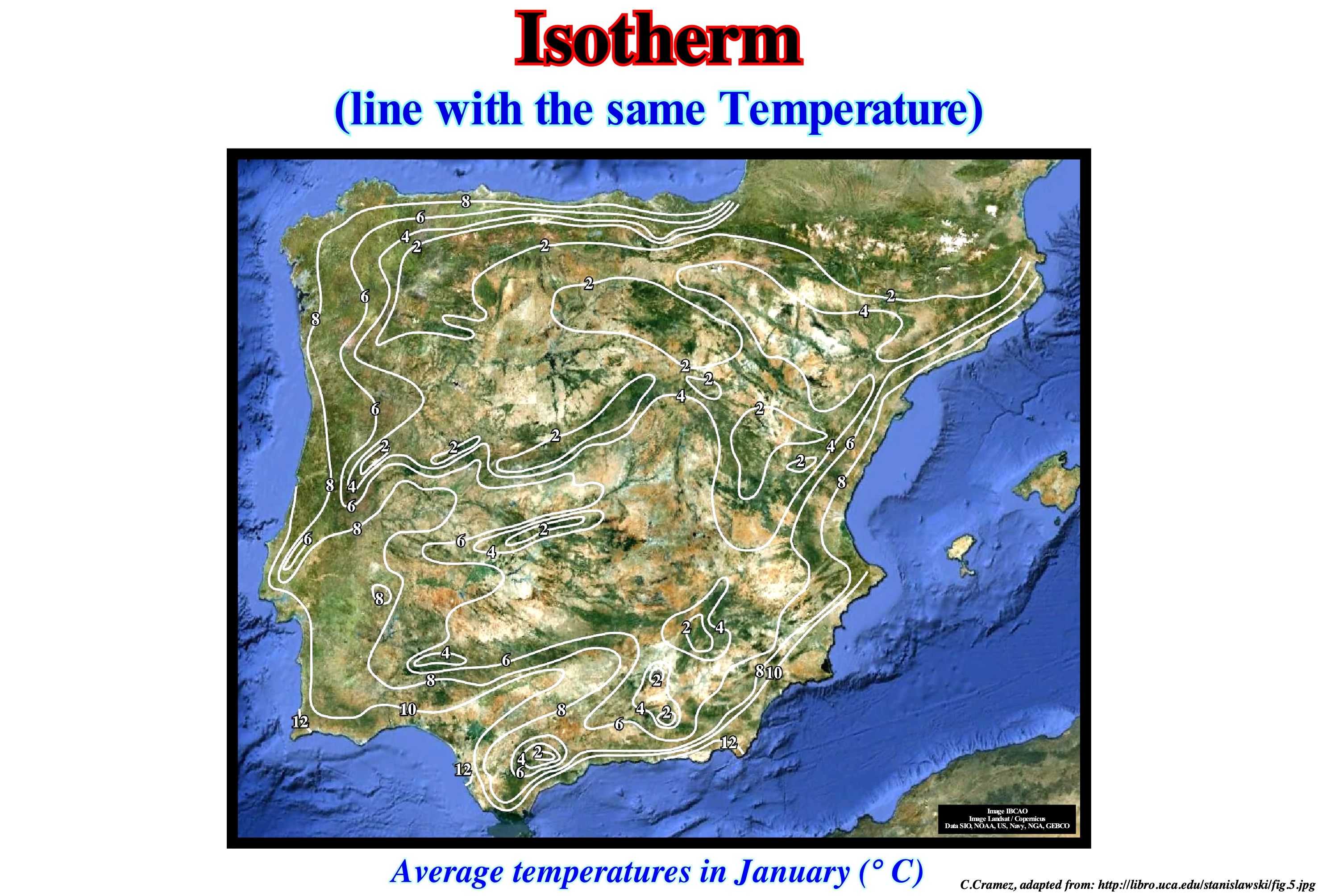 The map shown in this figure represents the average temperatures measured in the Iberian Peninsula in a month January. The year of these determinations does not matter to us much, since we have no intention to say if, at the moment, the climate is hotter or colder than before and especially if these variations are of anthropogenic origin (increase of the content of CO2 in the atmosphere induced by the combustion of fossil energies) or not. What is interesting to note is the amplitude of the variations between the coastline temperatures, that is, plus or minus 12° C and the temperature of the high points which is plus or minus 2° Celsius, which means that the average temperature in the Iberian Peninsula ranged from 10° C. This variation is very small when compared to the variations of other regions, not to mention the daytime and night-time temperatures (in the same month and day) in Hassi Messaoud (Sahara desert). The main reason why these differences interest us is that certain geoscientists, who are an integral part of the environmental political movements (the famous watermelons, that is to say, greens outside and reds inside), tell us, after correcting (but in what way?) the average temperature differences that we are headed for a catastrophe because their models (mathematical or not) suggest a temperature rise of about 3° C (2 to 6) in the next 100 years. When I tried to explain this to my friends from Vila Real (Trás-os-Montes, Portugal), who fortunately still had not lost the common sense of their ancestors, one of them told me: "But this is a marvel, so my grandchildren will not need go to the Algarve in the winter, as I do, that's good." The determination of the average temperature of the Earth is extremely difficult to determine, even with the corrections made by specialists, since the average temperature range at the poles and the equator sometimes exceeds 70 ° C. An interesting example is the summer of 2010. Indeed, those living in Europe consider that the winter of 2009 was very cold and that the summer of 2010 was a bit warmer. However, the Portuguese media said yesterday (29 September 2010): "this summer has been the hottest summer since 50 years" taking evidently as a reference the temperatures of Australia*.