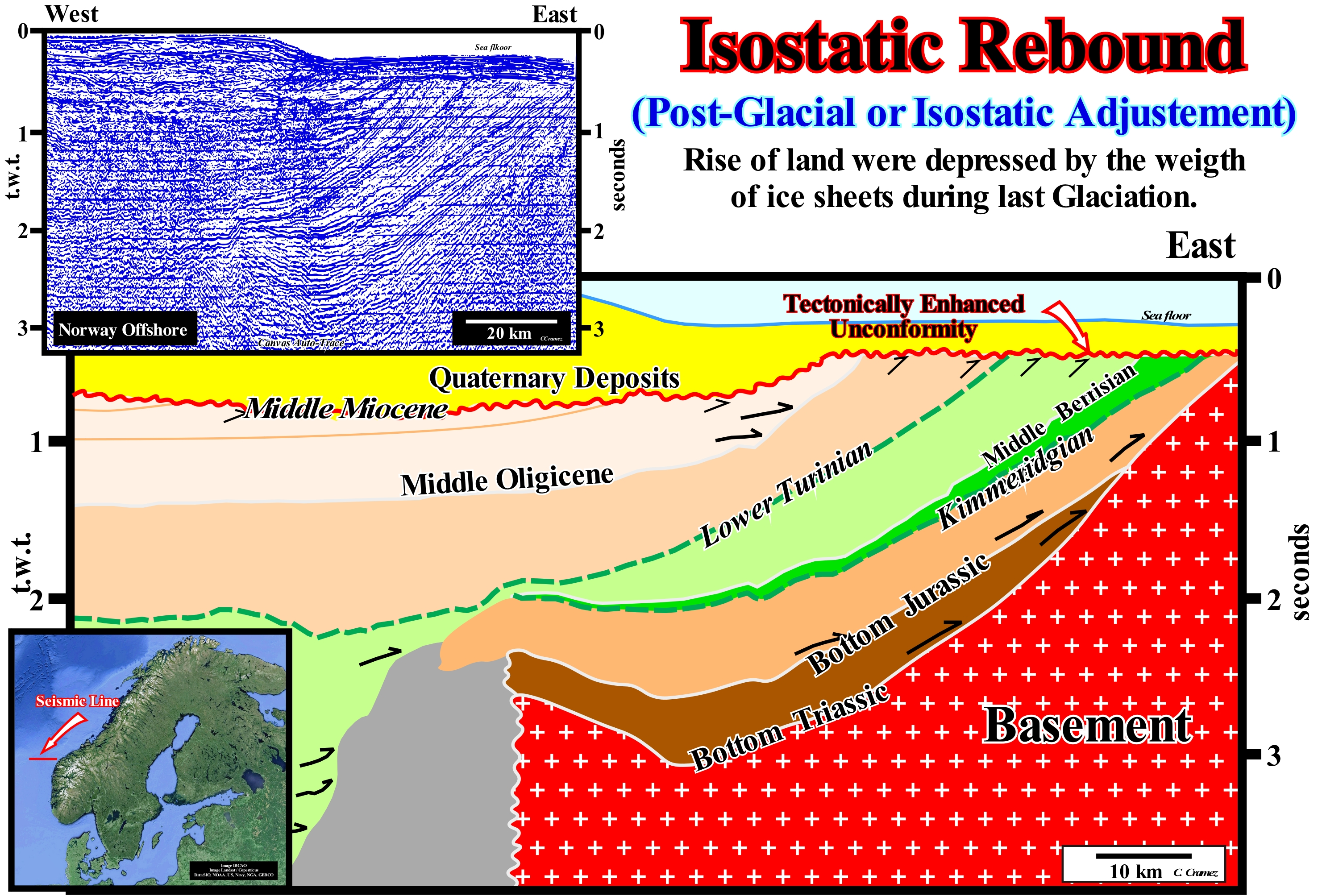 On this tentative geological interpretation of a Canvas auto-trace of a seismic line from the West Norway offshore , the isostatic uplift (rebound or readjustment) induced by the discharge (melting) of the glacial ice, that covered the North Europe and, particularly, Norway during the beginning of the Quaternary, is perfectly visible. At the top of this tentative interpretation, reflector terminations underline a tectonically enhanced unconformity (angular unconformity), which emphasizes the relative sea level fall* that occurred during the Middle Miocene. As can be seen, the eastern part of this unconformity was raised several hundred meters. This local uplift, which is confirmed by the thickness variation of the Quaternary sediments after the melting of the ice, was induced by the isostatic rebound, which accompanied the melting of the ice of the Quaternary glaciations. In fact, during the last glacial period, most of northern Europe, Asia, North America, Greenland and Antarctica were covered with ice sheets and ice caps**, as well as by ice seas. The thickness of the ice reached about 3,000 meters at the Last Glacial Maximum ***(LGM), about 21,000 years ago (calibrated age) or 19,000 B.C. The enormous weight of this layer of ice forced the crust to deform in an inverted bell shape (sinform, extensional structure, the rocks are lengthened), which forced the material of the terrestrial mantle to flow away from the overloaded area. Since the temperature had increased and the ice began to melt, the removal of the overload from the sunken region caused an uplift of the area and a return of the material from the Earth's mantle to its original position, that is, to that which it had before glaciation. Taking into account, the viscosity of the mantle material, it will probably take several thousand years for the Earth's surface to reach an isostatic equilibrium. For an ice thickness of about 2,000 m (as there is today in Greenland), the terrain sank about 700 meters (the ice density is about 1/3 of the density of the mantle). All this has a very great influence on the variations of the absolute (eustatic sea level), which, during the glaciations, fall and later rise during thawing. The Norway isostatic uplift is well known from the cadastral survey. In fact, since these services exist in Norway, they have found that the area of farms near the coast, regularly, increase due to the isostatic uplift. The importance of the glacio-isostatic movements associated with the last glaciation in the modelling of the coastline of Europe and North America is immense. In the European coast, the fjords of Norway, the Baltic Sea and North Sea, as well as the separation of Britain and Ireland from the continent, are the result of glacio-isostasy. Central Scandinavia continues to rise at the rate of 9 mm/year. in the American side, the Great Lakes, Hudson Bay and morphology of Canada's Arctic coast are the direct result of the sinking and uplift of the crust in that vast region. On the other hand, old coast lines and raised beaches are quit well visible. This phenomenon, which theoretically corresponds to an absolute sea level fall, is observed in several parts of the world, as in New Zealand, where the old coastlines and raised beaches are well known of the geoscientists. Another indirect relation that contributes to the complexity of the absolute sea level is the thermal expansion of sea water when the average Earth's temperature increases, which is in addition to the variations induced by the vertical movements of the crust, changes in the rate of Earth's rotation, large-scale changes in continental margins and changes in the sea floor spreading rate. Absolute sea level rise from tide gauge records and satellite altimetry, presently advanced by IPCC, that several geoscientists contest, are around +3 mm / y (2007 data, IPCC).
