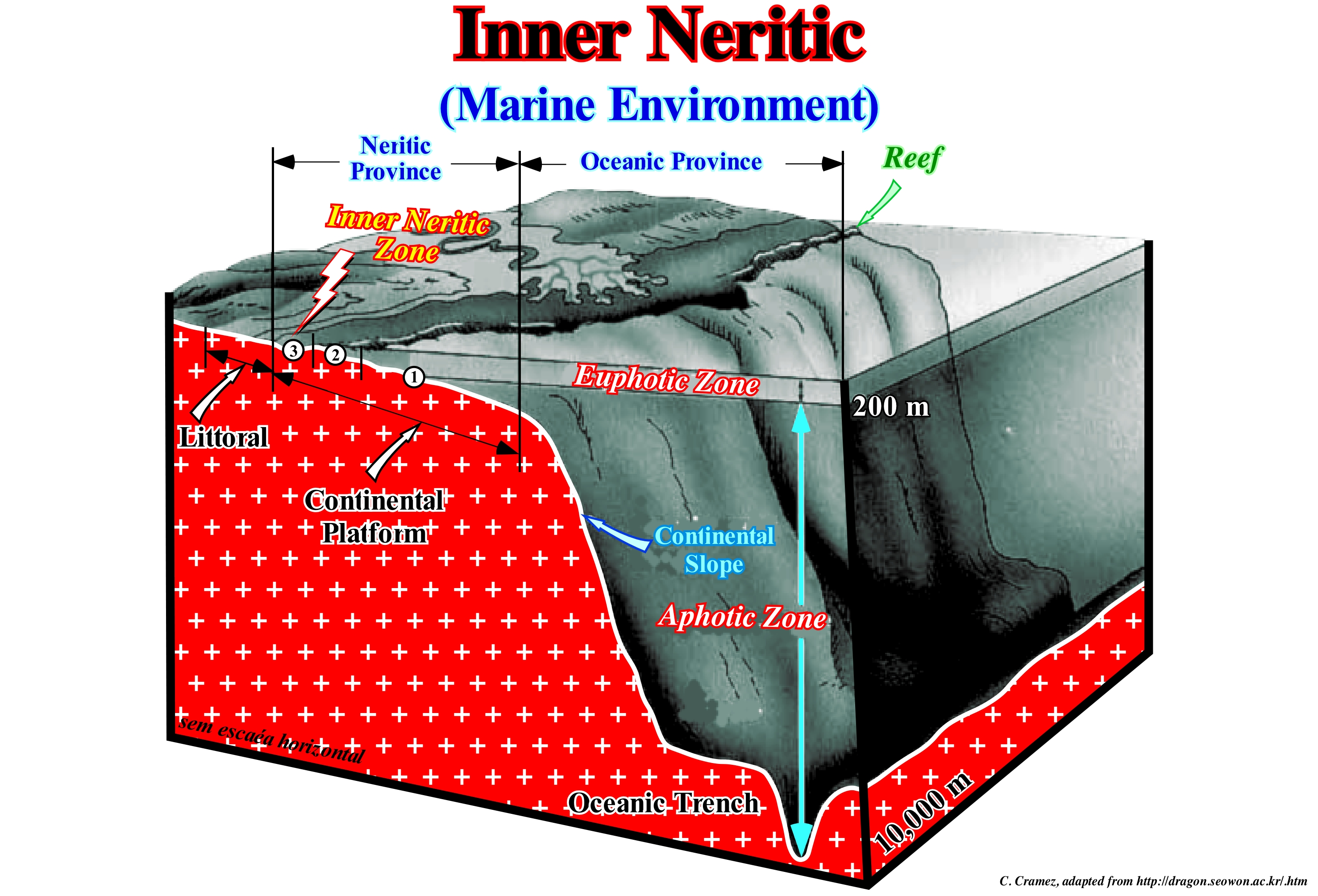 When a geoscientist talks about a platform, in general, he is referring to the continental shelf, which is the sloping surface of the sea-floor, bounded by a water-depth from 0 to 200 m, which is, sometimes, not the case of a carbonate platform. Thus, to avoid misunderstandings, it is important to know if the term platform is being applied to a sedimentary context where the clastics are predominant or to a carbonated context. Theoretically, under normal geological conditions, the depth-water of a limestone platform can not exceed the depth of the photic zone. Without sunlight energy can not have in situ formation of carbonate. Photosynthesis is a physical-chemistry process, at the cellular level, performed by living beings with chlorophyll, using carbon dioxide and water, to obtain glucose through the energy of the Sun, according to the following equation: Sunlight + 12H2O (water) + 6CO2 (carbon dioxide) → 6O2 (oxygen) + 6H2O (water + C6H12O6 (glucose) Some geoscientists consider five large families of carbonate platforms: (i) Rimmed Platforms ; (ii) Carbonated Ramp Platforms ; (iii) Epeirial (or epíric) Platforms ; (iv) Isolated Platforms ; (v) Dead or Drowned Platforms. Rimmed platforms are characterized by the presence of calcareous reefs or sandstones (carbonated sandbanks covered by shallow sea water) at the edge of the platform and clay sands in the lagoon or open platform. This type of platform forms in calm waters and its range varies between 10 and 100 km. In carbonated ramp platforms, the carbonated sands of the shoreline pass at the base of the ramp to clay sands and deep water muds. In this type of platform the reefs are rare and the width of the ramp can reach 100 km. Epeirial (or epíric) platforms are characterized by the presence of tidal surfaces and protected lagoons. The width of an epeiric platform can reach 10,000 km. Isolated platforms, in which the facies (lithologies) are very controlled by the orientation of the dominant winds. These platforms have reefs and sandy bodies, such as the rimmed platform, in the windward margin (facing the side where the wind blows), but in the leeward margin (in the direction where the wind blows), the sediments are more muddy. An isolated platform can reach 100 km wide. Dead or Drowned Platforms are below the photic zone (where there is not enough light for photosynthesis, i.e., use of carbon dioxide, CO2, and water to obtain glucose through the energy of sunlight). The most well known carbonate platform geometry is associated with tropical manufacturing processes, where carbonate platforms can be sub-divided into three main sedimentary environments: A) Reef, which is the part of the carbonate platform created in situ by sessile organisms ; B) Internal Lagoon, i.e., part of the platform behind the reef, which is characterized by shallow and calm waters with sediments composed of reef fragments and hard parts of organisms or terrigeneous sedimentary particles when the reef is epicontinental and C) Slope or Reef Slope, which connects the reef to the basin and acts as a sink for the excess carbonate sediment, although most of the sediment produced in the lagoon and reef is transported by various processes and accumulated on the slope. The example shown here corresponds to an isolated platform. On the tentative geological interpretation of a Canvas auto-trace of a detail of a seismic line, the reefs are better developed in the windward margin, which in this case corresponds to the margin facing the sea. Reefs on the proximal (continental) side are not only less developed but also more muddy. The upper part of the isolated platform corresponds to a dead platform, following a significant relative sea level rise that placed it below the photic zone, where the processes of carbonate formation are, practically, impossible. Some geoscientists subdivide the carbonate platforms connected to the continent in: (A) Flat-Topped Platform and (B) Ramp-Type Platforms. On flat-topped platforms (A) there are o two subtypes: (A.1) Rimmed and (A.2) Nonrimmed. In ramp-type platforms (B) two sub-types can be considered: (B.1) Distally Steepened and (B.2) Homoclinal. The ramp-type platforms which are frequent in cold climates, the flat-topped platforms form preferably in tropical climates.