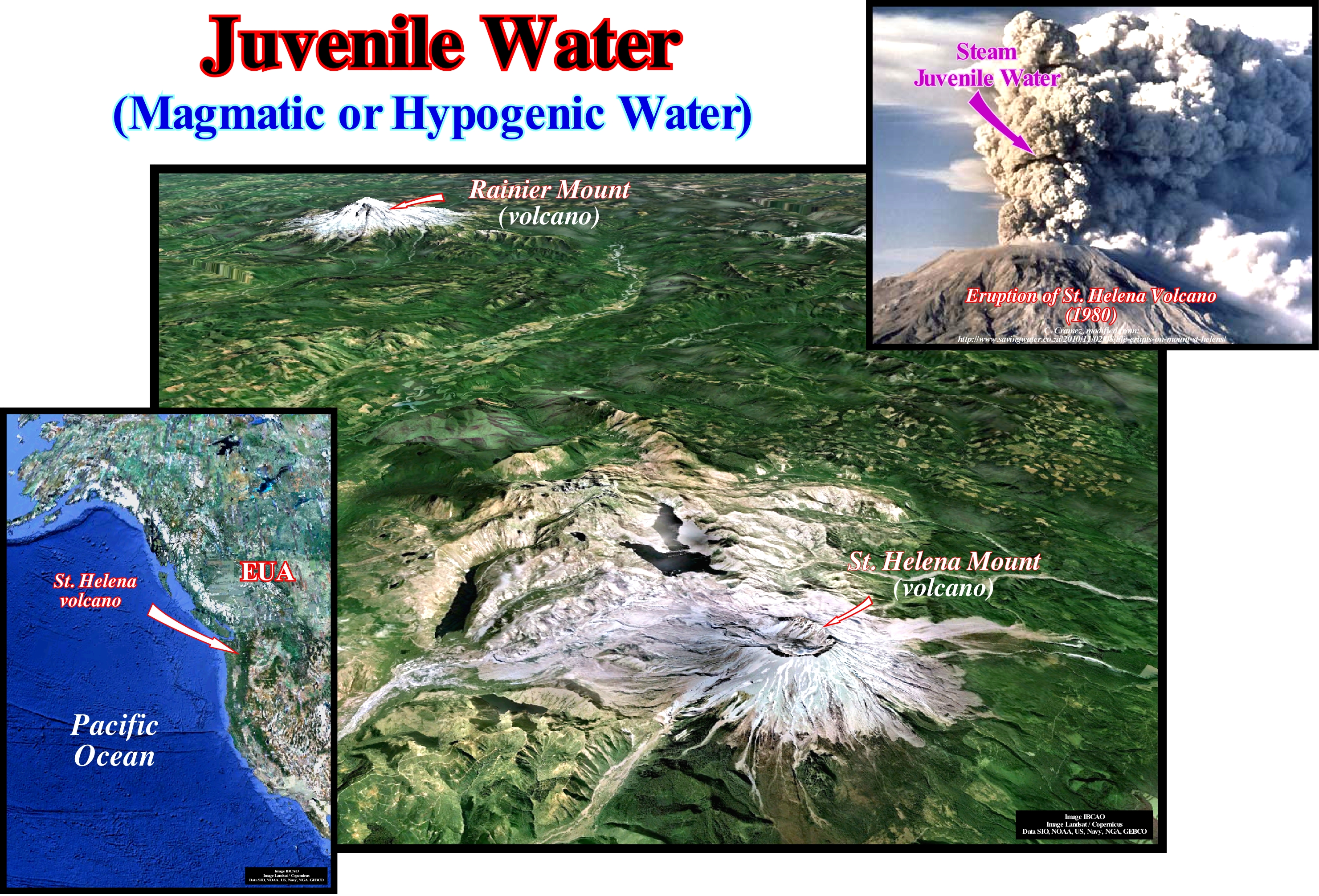 Water and especially water vapour from a phreatic eruption**, during which water vapour, water, ashes, blocks and bombs are expelled from a volcano is, sometimes, erroneously, regarded as juvenile water. In fact, it is, in most cases, underground water, which has been, sufficiently, heated by the magma and thus transformed into vapour before being expelled. The term "phreatic" refers to groundwater (below the water table, or under the aeration zone) that exists near the surface and can be used by production wells. Taking into account the comments made for the hypogenic water, it is important not to forget the quantity of water in all its forms is admitted, by the great majority of geoscientists, to be constant since the beginning of the Earth's, i.e., around 4.5 Ga (billion years). If this conjecture is not true, sequential stratigraphy would be meaningless, since it assumes, as a base hypothesis, that the cyclicity observed in the sedimentary deposits (field, seismic data and electrical logs) is controlled and induced not only by the eustatic changes, but above the relative sea level changes (combined action of eustasy and tectonics). When the volume of ocean basins increases or decreases, function of plate tectonics movements, it can just be said that the global (eustatic) sea level (global sea level measured in relation to Earth’s centre) falls or rises if the amount of water is considered constant since beginning of Earth's formation. In the same way, during a glaciation, the absolute (eustatic) sea level falls just if the quantity of water in all its forms is considered constant. Sea level variations induced by volume changes in ocean basins control first and second order eustatic cycles, which induce continental encroachment stratigraphic cycles and continental encroachment sub-cycles. Sea-level changes induced by changes in tectonic subsidence and ice volume (glacio-eustasy) control the 3rd, 4th and 5th order eustatic cycles and thus the stratigraphic sequence-cycles and sequence-paracycles. We recall that sea level can be absolute (eustatic) or relative (local). The latter is the result of the combination of the former with the effects of tectonics (uplift or subsidence of the sea floor). The absolute sea level, which is the supposed to be global, is referenced to the Earth's centre (presently, NOAA, i.e., the National Oceanic and Atmospheric Administration, uses satellite altimetry that must be calibrated by corrected tide-gauge results, i.e. taking into account the subsiding and uplifting site areas). The absolute (eustatic) sea level is the result of the combination of: i) Tectono-Eustasy that is controlled by the volume variation of the ocean basins in association with oceanic expansion following the break-up of the supercontinents ; (ii) Glacio-Eustasy, which is controlled by the variation of water volume of the oceans as a function of the amount of ice (assuming that the amount of water in all its forms is constant since the Earth formation around 4.5 Ga) ; (iii) Geoidal-Eustasy which is controlled by the distribution of ocean water caused by variations in the terrestrial gravity field and (iv) Steric rise in sea level or thermal expansion of the oceans, which is controlled by rising ocean temperatures.