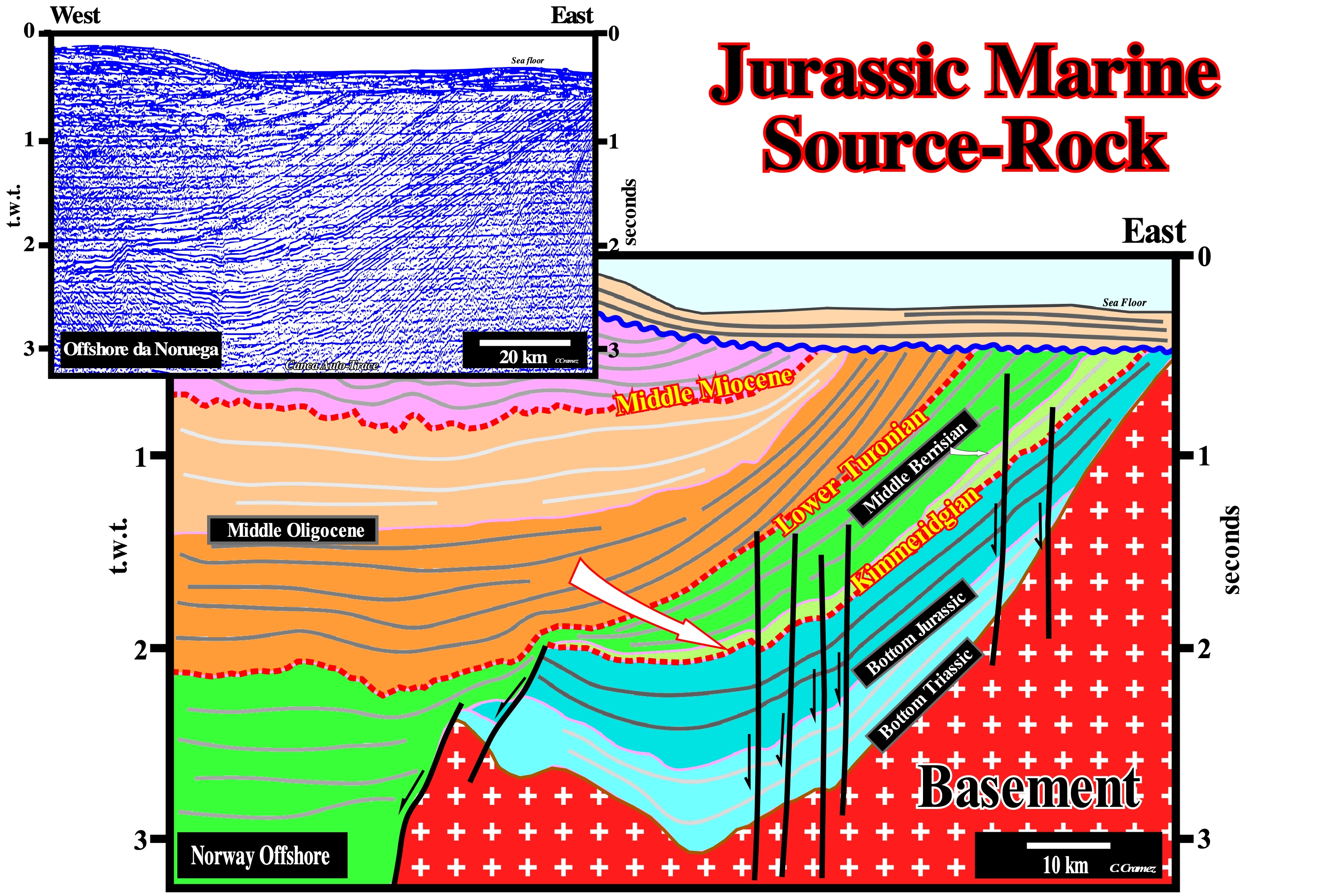 On this tentative geological interpretation of a Canvas auto-trace of a regional seismic line of Norway offshore, are shown the main Jurassic marine source-rocks, principally, those of Kimmeridgian (between 150,7 and 154,1 Ma), which fed all the hydrocarbon accumulations not only from this offshore but also from the North Sea. About 55-60% of the hydrocarbon reserves were generated from the source-rocks deposited during the transgressive phase of the post-Pangea continental encroachment stratigraphic cycle. About 30% of the Cretaceous source-rocks (Cenomanian-Turonian) and about 25% of the Jurassic source-rocks (Oxfordian-Kimmeridgian). These two types of marine source-rocks correspond to eustatic highs that favour the deposition of sediments rich in organic matter. As illustrated on this tentative interpretation, just the Jurassic sediments seem to be buried, sufficiently, so that organic matter could produce hydrocarbons (oil window). Three downlap surfaces (Middle Miocene, Lower Turonian and Kimmeridgian) that emphasize sedimentary horizons rich in organic matter, i.e., potential source-rocks are, easily, recognized (underlined in red dashed lines). Only the lower Kimmeridgian downlap surface has been, sufficiently, buried, to the maturation of the organic matter reach the oil window. The organic matter of the Middle Turonian and Middle Miocene sediments is immature, i.e., it did not reach the oil window (take into account the recent isostatic uplift of the eastern part of this line, i.e., from Norway, induced by the discharge of ice caps). In this tentative interpretation, the progradations between the Kimmeridgian and the Middle Berrisian (Lower Cretaceous), as well as, those of the Senonian (Upper Cretaceous) are very well marked. In contrast, Serravalian and Tortonian are not evident. The shallow water and continental slope deposits were eroded.