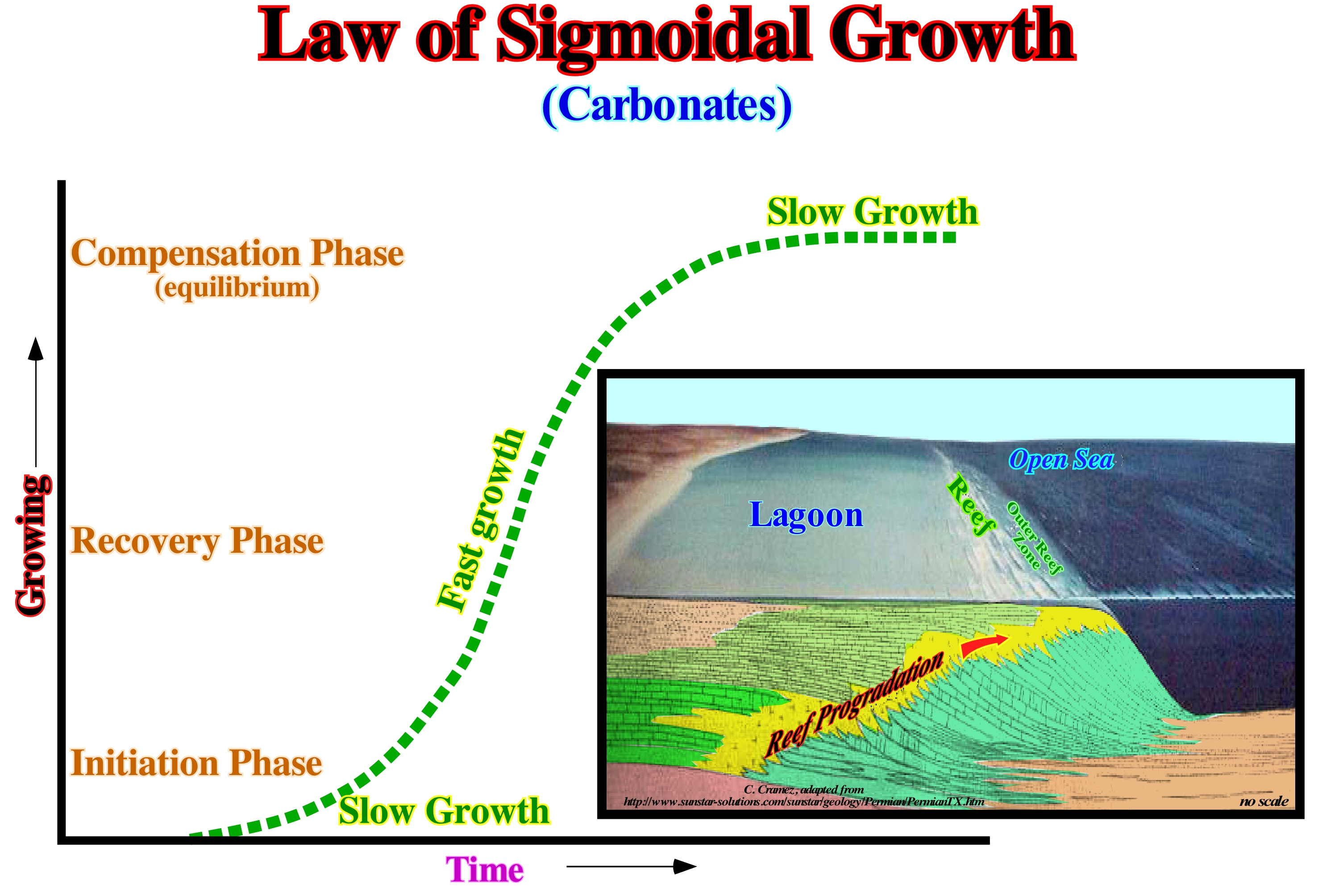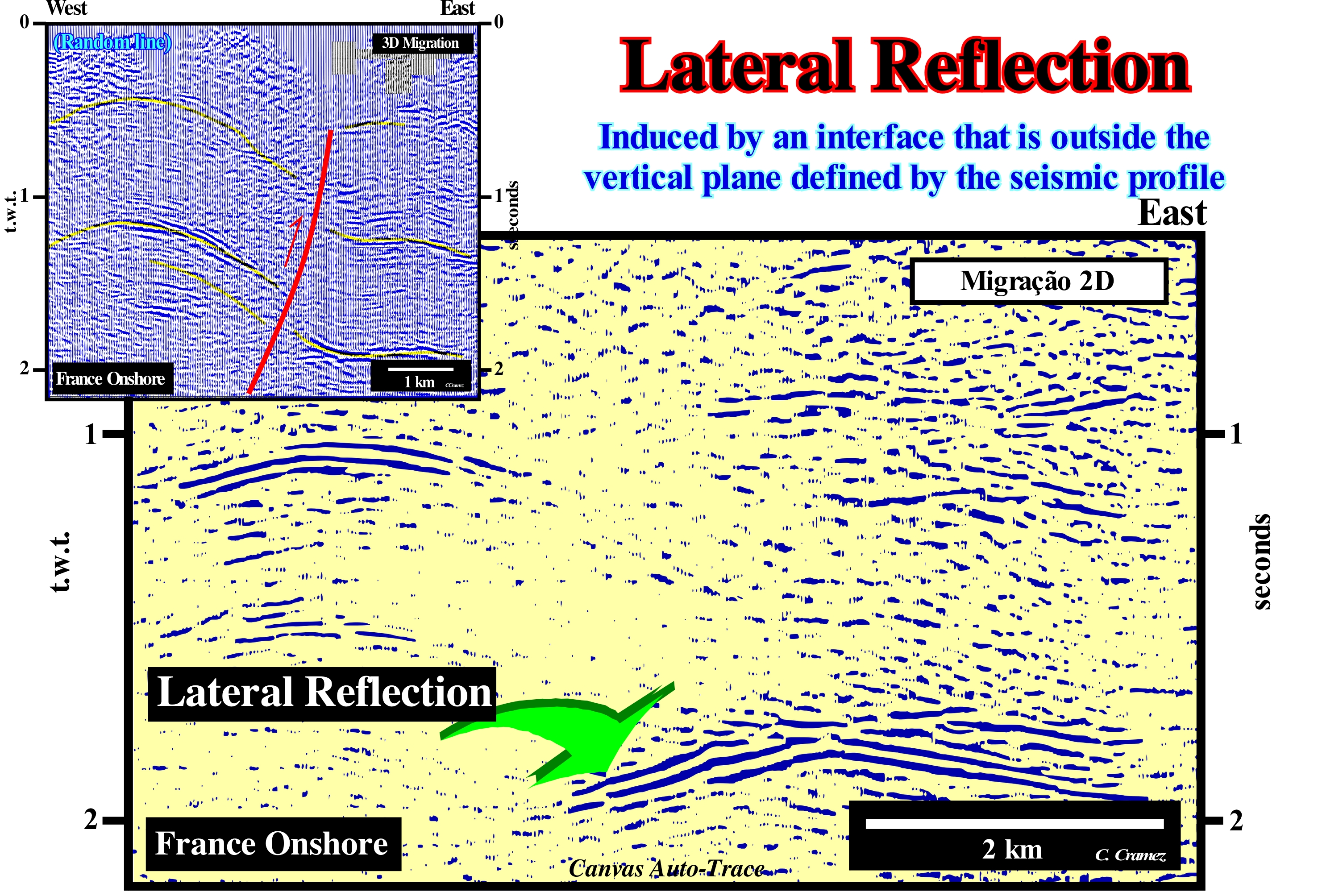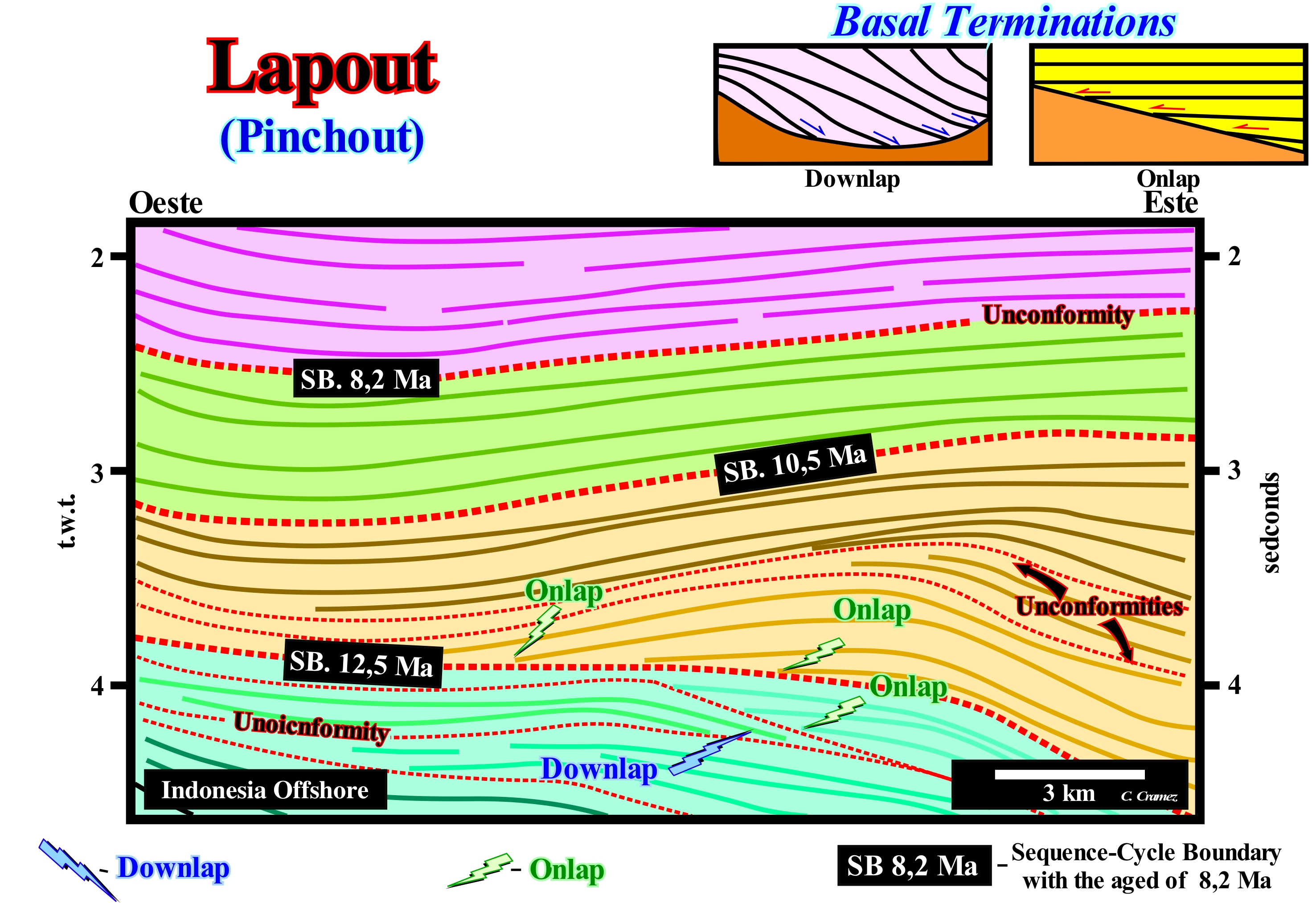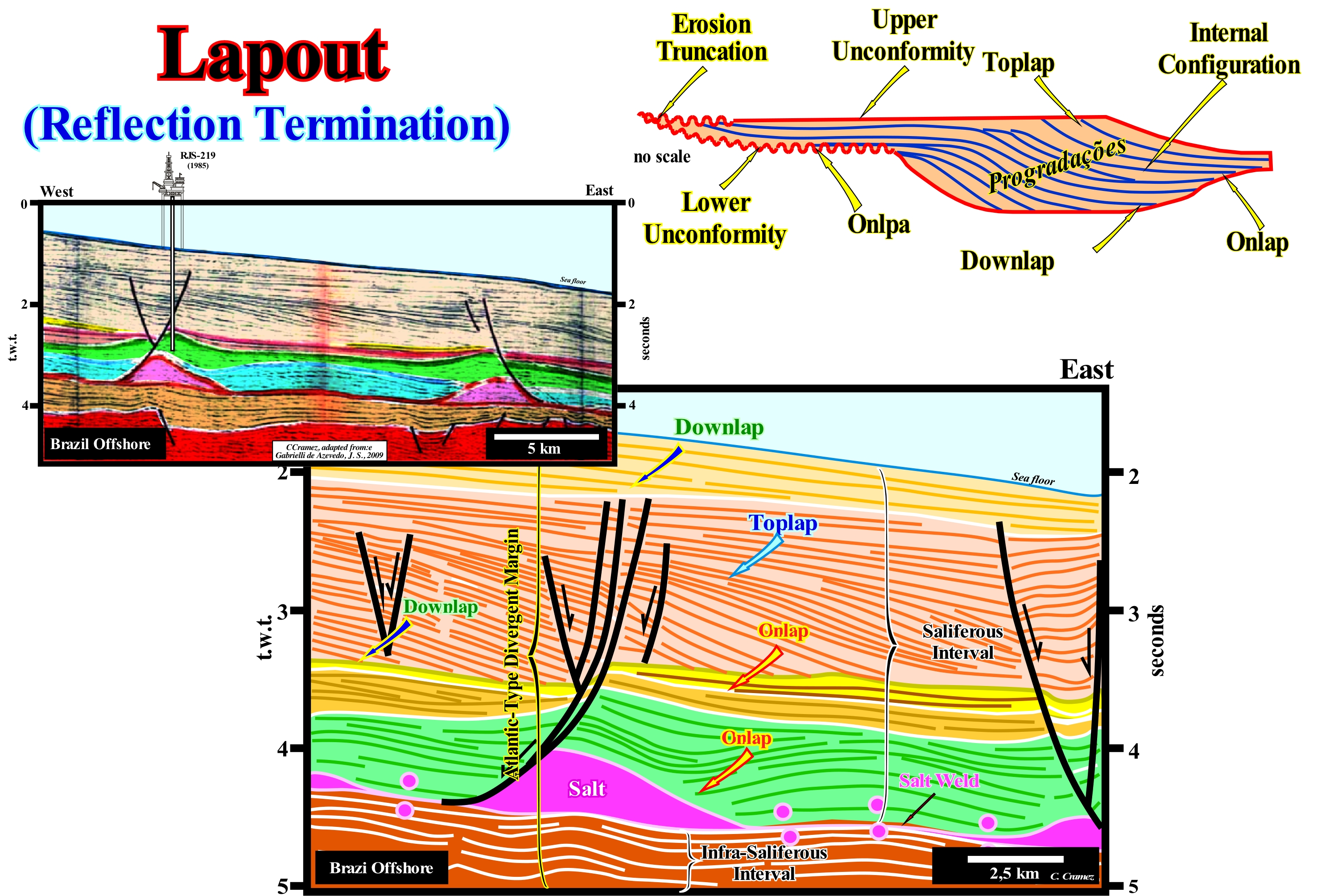 East Brazil offshore corresponds to the stacking of three types of sedimentary basins of Bally and Snelson (1980) basins classification. From bottom to top, they are: (i) Basement or Paleozoic flattened mountain belt ; (ii) Late Jurassic/Early Cretaceous rift-type basins ; (iii) Mesozoic/Cenozoic Atantic-type Divergent Margin. The rift-type basins were formed during the lengthening of the Gondwana small supercontinent, before the break-up of the lithosphere. On this tentative geological interpretation of a Canvas auto-trace of a detail of a seismic line Campos offshore (Brazil), several types of lapout are visible. Within a sequence-cycle, deposited during a 3rd order eustatic cycle, whose time-duration varies between 0.5 My and 3-5 My, relatively to the lower sequence boundary, the basal geometrical relationships can be onlap or downlap. Relatively to the upper sequence-boundary, the reflection or strata reflections, i.e., the toplaps can be: (a) By truncation (when there is erosion) or (b) By non-deposition when it is difficult or impossible to decide whether there was erosion or not. On this tentative geological interpretation, all types of reflector terminations are clearly visible, as well as, the associated seismic surfaces*: (i) Onlaps ; (ii) Downlaps; (iii) Toplaps by truncation ; (iv) Toplaps by non-deposition ; (v) Onlapping Surface ; (vi) Downlapping Surface ; (vii) Toplapping Surface, etc. This tentative geological interpretation is very different from the geological interpretation made in the 1980s (Petrobras interpretation), is, often, used to illustrate the importance of serendipity in petroleum exploration. In fact, the target of the first exploration well (located on the seismic line of this tentative interpretation) was the turtle-back antiform structure (within the green interval), created by the flowage of the salt interval, which is still visible in the lower right part above the salt-weld (salty suture). However, as everyone knows, when an exploration well is drilled in a sedimentary basin little affected by tectonics, to reach the Cretaceous sediments (the age of the sediments forming the turtle-back antiform, and not turtle-back anticline), it is necessary to cross the Cenozoic overlying sediments, if these have deposited and were not eroded, which is the case here illustrated. In mid-January 1985, the Petrobras exploration well (RJS219A) reached the interval underlying the continental slope progradations, i.e., it reached the yellow colored interval (which had not even been interpreted), which is characterized parallel and sub-horizontal internal configuration (presently interpreted as a submarine basin floor fans). "Bingo", the well found, hundreds of meters before the target, a thick sand interval with oil found (Marlin Petrobras discovered, whose original recoverable reserves were close to the 4 Gb), which was not even taken into account in the well prognosis. It was for this reason that my mourned friend and colleague Celso Ponte told me: " Carlos do not forget, God is Brazilian". Examples of this type were also very frequent in the oil exploration in North Sea, as well as in the Angola deep offshore. The Girassol discovery (Elf), as well as, the Kuito discovery (Chevron, Total) are, like Marlin discovery, magnificent examples of serendipity** (certain geoscientists will certainly say the opposite, forgetting that, at that time, I was working in one of the exploration team). It is interesting to note that in this tentative interpretation, just the divergent margin is represented, which, in stratigraphic terms, can be divided into two intervals separated by the evaporitic interval or by the associated tectonic disharmony: (i) Suprasalt interval and (ii) Infrasalt interval. However, the boundary between these two intervals does not correspond to any unconformity, i.e., to any erosional surface.