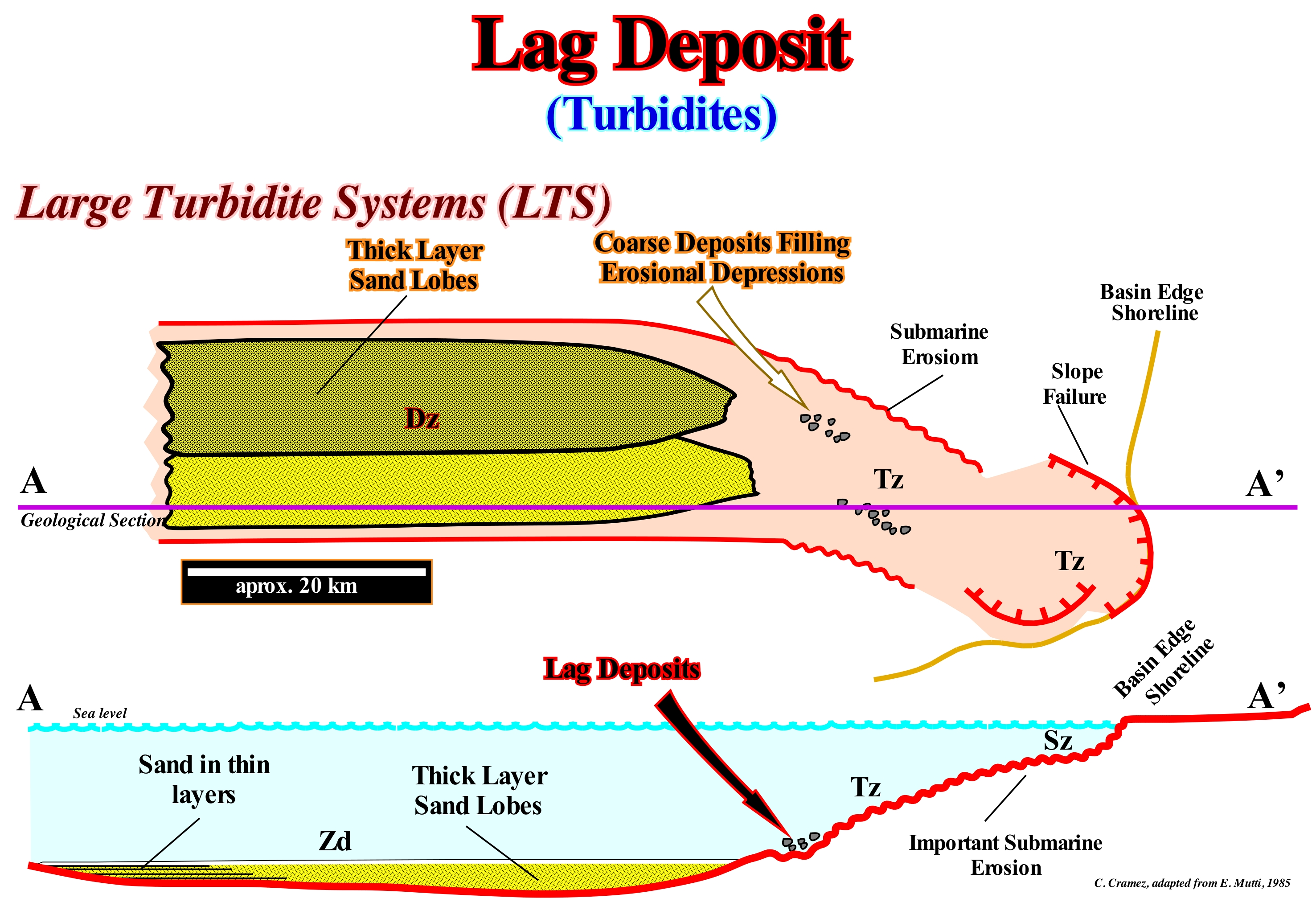 The upper sketch represents a geological map of a Large Turbidite System (LTS), that E. Mutti called Type I. The lower sketch represents the geological profile A'A of the system represented in the upper sketch (the profile is indicated by the horizontal line AA'). The main characteristics of a large turbidite system (LTS)*, in which lag deposits are frequent, upstream of the thick-layered sand lobes, are as follows: (i) It develops under highstand geological conditions (sea level above the basin edge), but, preferably, when the basin edge coincides with the depositional coastal break, i.e., when the basin has no shelf ; (ii) Turbidite currents are, normally, induced by instabilities of the basin edge that coincides with the coastal plain edge (continental edge) producing sliding failures, on the upper continental slope or by a significant submarine erosion ; (iii) Turbidite currents are very important and carry a large amount of sedimentary particles toward the deep parts of the basin ; (iv) Along the continental slope not only any significant deposition occur, but, on the contrary, locally, the turbidite currents erode the continental slope ; (v) Along the continental slope three sectors can be recognized (from the bottom to top): 1) Source Zone (SZ) with production of sedimentary particles ; 2) Transport Zone (Tz) and 3) Deposition Zone (Dz). Under these conditions, when turbidite currents reach the break of the lower continental slope, they have such a transport competence that the sedimentary particles are, sometime, transported during several tens of kilometers in the abyssal plain. Often, the thick-layered sand lobes can become disconnected from the immediately overlying sediments, i.e., they are, directly, fossilized by the deep sediments of the lowstand prograding wedge (LPW) of the sequence-cycle. The transport zone (Tz) allows the coarser sedimentary particles to settle in small negative anomalies of the substrate created, probably, by the erosion of the currents and form the so-called lag deposits, which are, more or less, distant from the main turbidite lobe. The transport zone (Tz) is downstream of the source zone (Sz) of the sedimentary particles, and upstream of the deposition zone (Dz). In this geological model proposed by E. Mutti, the geological conditions are of lowstand. The sea level is at the same level as the basin edge or slightly lower. Under these conditions, the rivers discharge the sediments on the continental slope creating currents of gravity. From the geological sketches illustrated in this figure we can say: (i) The unconformity (red wavy line) and its correlative deep-water paraconformity (red solid line) emphasize the lower boundary of the sequence-cycle where, in the distal area, submarine fans were deposited ; (ii) The unconformity (erosional surface and its correlative paraconformity were induced by a significant relative sea level fall that put the sea level lower than the basin edge ; (iii) Turbidity currents produce along the continental slope a submarine erosion that, locally, may be quite important ; (iv) The shoreline corresponds, more or less, to the continental edge (the basin has no shelf) ; it is underlined by failure scars that mark the beginning of the source zone (Sz) ; (v) Failures in the upper continental slope are also possible ; (vi) At the bottom of the continental slope, locally, erosional depressions form, which are, later, filled by coarse sediments, forming what geoscientists call lag deposits ; (vii) Downstream of the lower break of the continental slope, the turbidity currents decelerate depositing turbidite lobes which, generally, correspond to thick lobes of sand ; (viii) In the distal sectors of the turbidite lobes, the thickness of the sand layers decreases considerably ; (ix) Mutti's thick layered lobes correspond, roughly, to the submarine basin floor fans (SBFF) of P. Vail, which means that E. Mutti follows the Vail's model when there is a significant sea level fall, but he also admits the possibility of deposition of turbidite systems under highstand geological conditions, which is not the case of P. Vail.