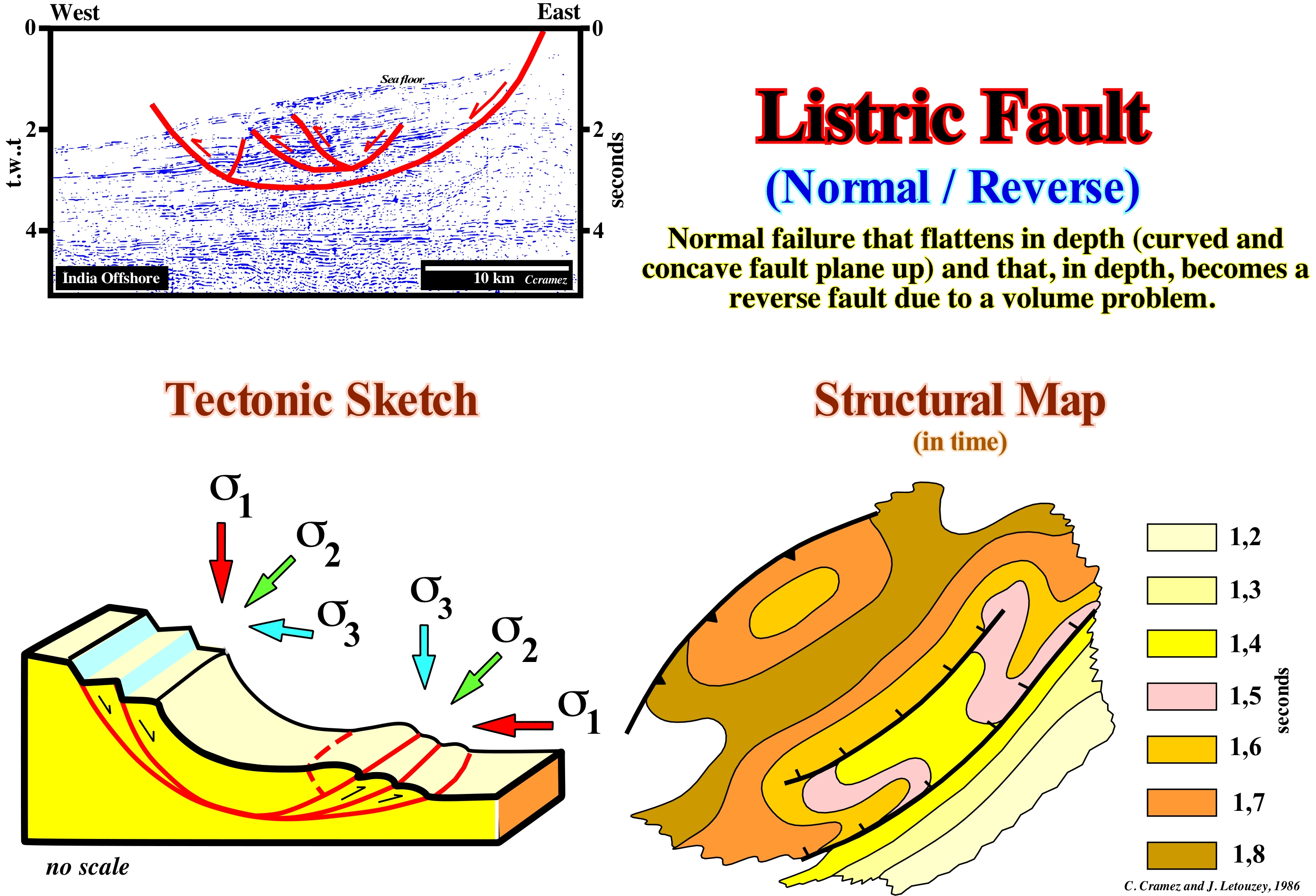 These sketches illustrate the characteristics of a listric fault. The upper part corresponds to a normal fault. The σ1 (the main axis of the effective stresses ellipsoid) is vertical and the σ2 is horizontal and oriented N-S. The σ1, σ2 and σ3 axes are the main axes of the effective stresses ellipsoid, which result from the combined action of the lithostatic pressure (sedimentary column weight), hydrostatic pressure (water column weight) and tectonic vector. In this example, the sediments are lengthened by normal faults that have an N-S oriented fault plane (fault planes of both normal and inverse faults are always parallel to σ2). The lengthening of the sediments in the upper part induces, at the lower part, a local compressional tectonic regime (σ1 horizontal) that shortens the sediments by inverse faults. The lengthening of the upper part is compensated by the shortening of the lower part. This type of fault is characteristic of surface landslides, since it requires relatively small confining pressure. Under a certain sedimentary column, the listric fault are absent. On the contrary, they are very frequent in the upper levels of the continental slope, where the σ3 is, in general, vertical. The fault plane of a listric fault is curved and continuous. Sometimes geoscientists in charge of the tentative geological interpretations of seismic lines tend to consider two faults, a normal fault above and a reverse fault below, which is, totally, wrong, since the plane a fault is continuous. Although the apparent movement of the faulted blocks is different in the upper and lower part. The same is, often, true in reactivated faults, that is, when, for instance, a normal fault formed during the Cretaceous is later, in the Miocene, it is reactivated as reverse fault. If the inversion is not complete, the fault is reverse (from Miocene), but it has a normal fault geometry at the bottom and a reverse fault geometry at the top.