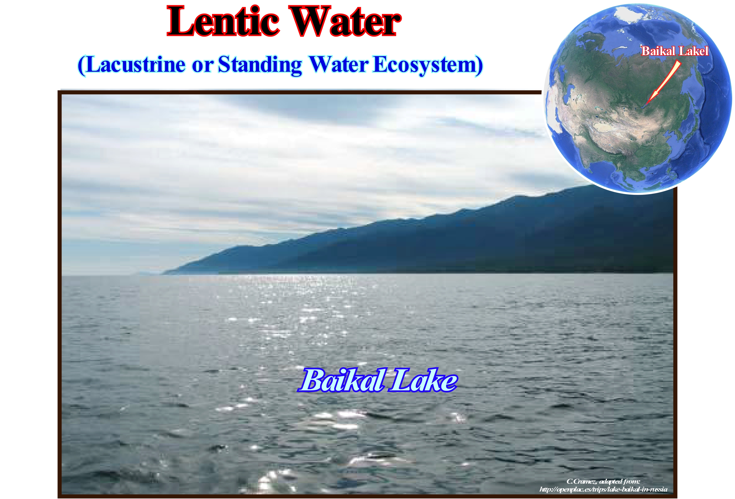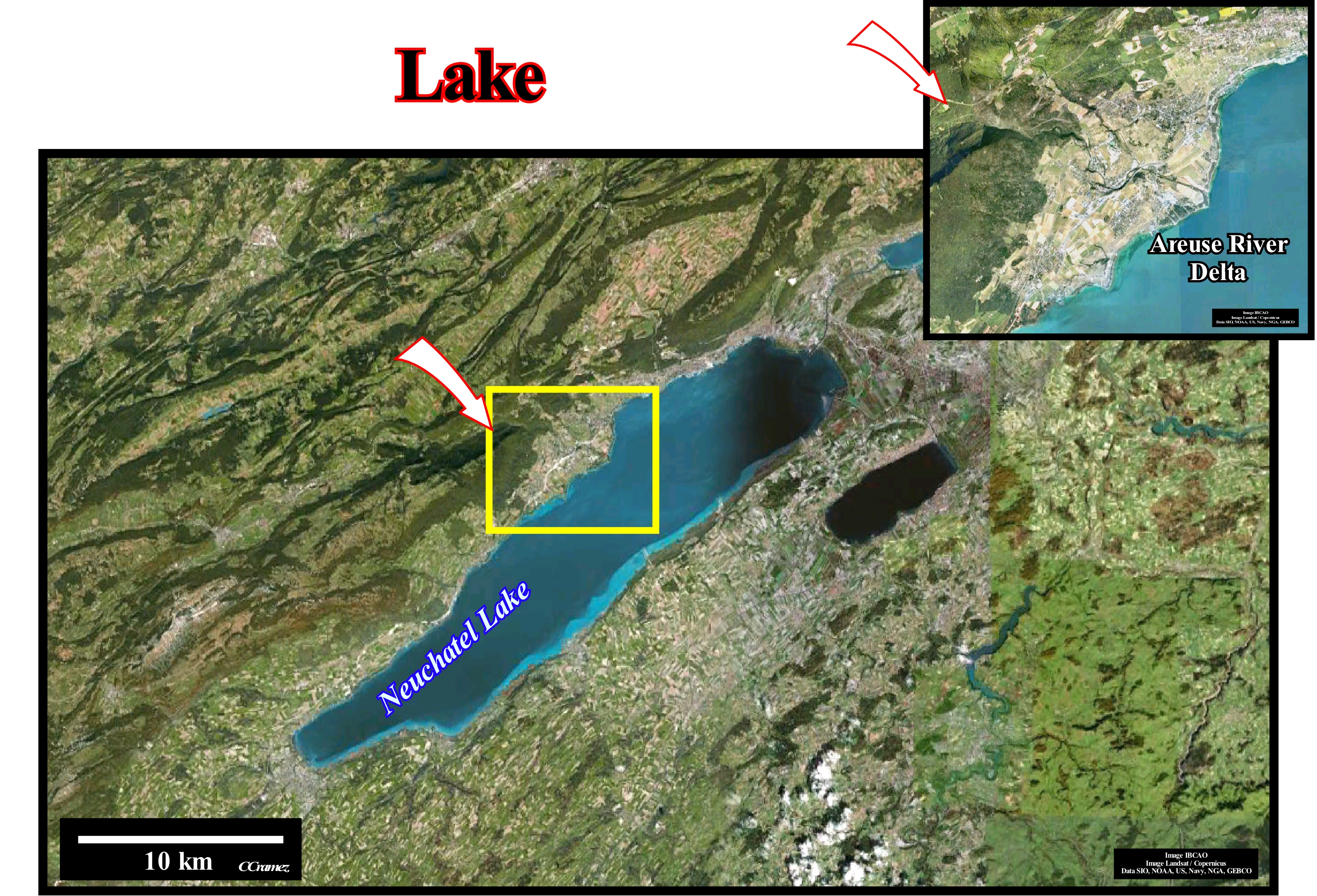 There are different types of lakes: (i) Peri-glacial lake, when a glacier, ice wall, or ice cap forms part of the lake's margins, that is to say, when ice obstructs natural drainage ; (ii) Sub-glacial lake, when the lake is permanently covered with ice ; (iii) Glacial lake, when the lake result from the melting of a glacier, such as those illustrated in this photograph of the Neuchâtel region (the eastern limit of the Swiss Jura) ; on the margins of this type of lake deltas developed under the wave influence can be formed (the Areuse delta is, fully, illustrated in the lower right corner of the figure) ; (iv) Artificial lake, when the lake is created by a flood behind a dam, human excavation, etc. ; (v) Terminal lake, when the lake associated to a river or underground diffusion has no outlet ; (vi) Meromictic* lake, when the different layers of water that constitute it do not mix (in general, the deeper layers do not contain any dissolved oxygen) ; (vii) Aeolian, i.e., a lake that forms in a depression created by the wind (water filling of a deflation basin) ; (viii) Ox-bow lake, when the lake is formed form in an old meander that was abandoned due to a meander net cutoff ; (ix) Reduced lake, when its dimensions decrease with time ; (x) Underground lake, when the lake is formed beneath the Earth's surface, in association with grottos, caves, aquifers, springs, etc. ; (xi) Crater lake, when it forms in the volcanic caldera, as long as a volcano is no longer active ; (xii) Lava lake, formed by molten lava contained in a volcanic crater or any other depression ; (xiii) Pre-existent lake, which no longer exist (many of these lakes disappeared by evaporation or human intervention) ; (xiv) Station lake, i.e., that exists as a water-body just during part of the year ; (xv) Rift-lake, when it is formed in an area of strong subsidence associated with the break-up of the lithosphere ; (xvi) Fjord lake, when it is formed in a glacial valley that has been eroded lower than sea level level, etc. The Baikal lake, located in southern Siberia is the world's deepest and oldest lake in continuous existence. It corresponds to a huge graben that started to fill with water about 25 Ma. Presently, its is 365 km long and 16-80 km wide. Its surface is about 312079, 857 km2. Its depth reaches 1,600 meters. The Bailkal lake holds, more or less, 20% of the all the world's liquid fresh water, that is to say, it holds as much water as all the Great Lakes hold together