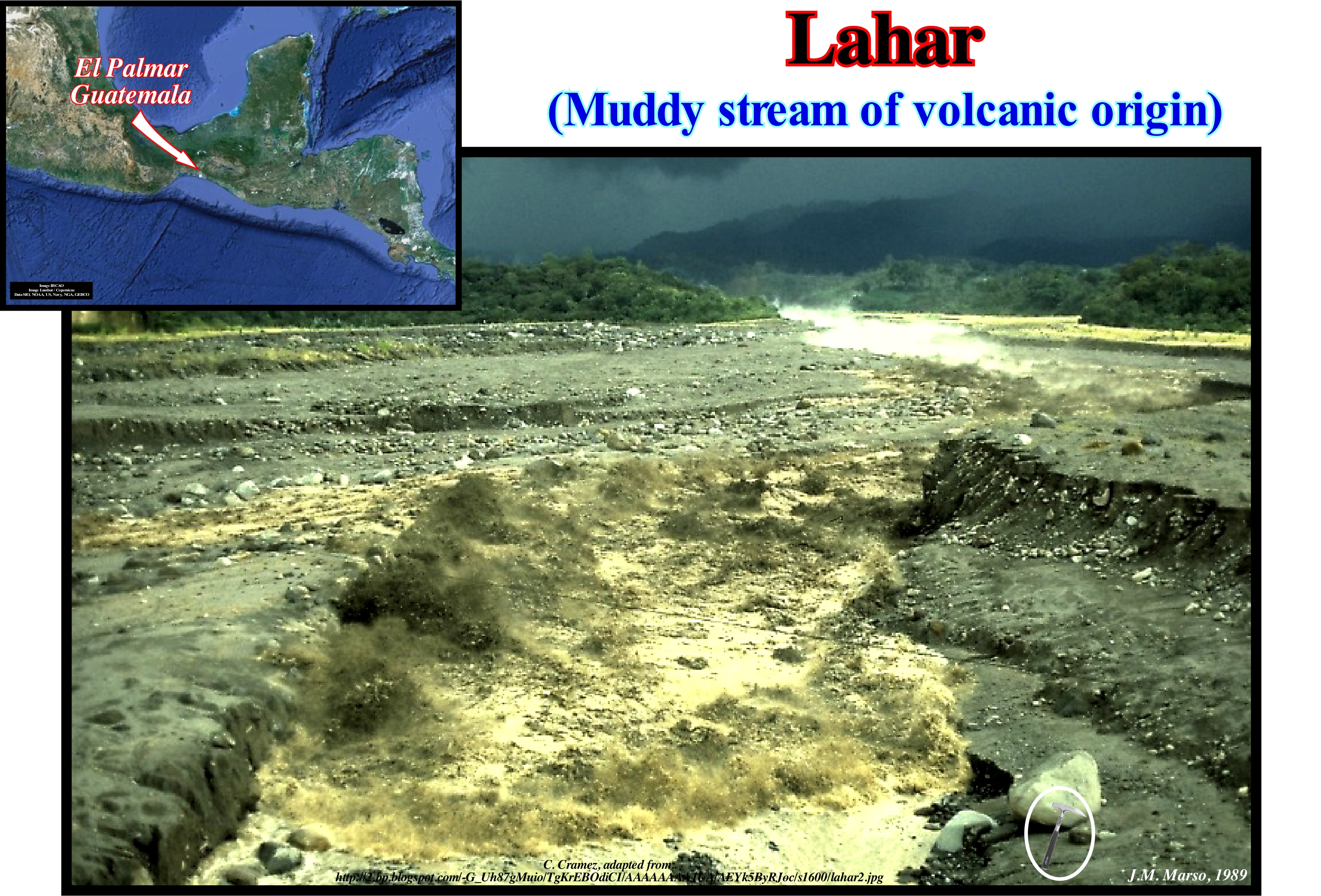 Basically, a lahar is a conglomerate associated with volcanic muds, which form after the eruption of a volcano. Mud formation is a frequent phenomenon on the volcanic slopes. The eruptions are, often, accompanied by heavy rains and the volcano itself emits water-vapour in large quantities, which condenses on the slopes. The retention lake, whether it be located behind the ashes or, even in the volcano crater, can, abruptly, empty itself, following a violent shaking and form enormous streams of mud, i.e., a lahar. Lahars move downhill, as any runoff, and submerge almost everything in their passage. The flow that occurred in the year 79 following the eruption of Mount Vesuvius, fossilized a large part of the Herculaneum Roman city, but leaving the ceilings of the houses intact. This did not happen in Pompeii city, where volcanic material falling from the sky left the walls of houses intact, but caused the house roofs to collapse. This figure shows the lahar, produced by rain-water, along the Nima II River, near El Palmar city (Guatemala), which formed on the slopes of the Santiaguito volcano, where conditions for the lahar's formation are ideal, since the eruptions destroy the vegetation at the same time, that deposit layers of inconsistent volcanic rocks. During the rainy season, when the rivers overflow, they erode those deposits and form lahars that are, extremely, dangerous. When there is no formation of lahars, erosion favours the deposition of sediments in the river bed, which of course favours flooding. The lahars contain a high concentration of debris from the flanks of the volcanoes and have a huge destructive power. If the sediment concentration is greater than 20% of the total flow volume, it is considered to be hyper-concentrated. If this proportion of debris is greater than 60%, the flow is called, by certain geoscientists, debris-flow, which can travel great distances, with a flow front moving at a speed that can reach 85 km/h. A typical example of debris-flow was caused by the Cotopaxi eruption in Ecuador, in 1877, which travelled more than 320 km at an average speed of 27 km/h. Lahars can also be considered mud-flows if the proportion of clay is high. The Pinatubo eruption on Luzon island (Philippines) that began in April 1991 and lasted more than a year, emitted a large amount of in-stabilized volcanic deposits. On June 14, the "Yunya" typhoon passed over the island. It was followed by other typhoons and in July, the lahars began to be, increasingly, important. This phenomenon was repeated at each rainy season or at every typhoon crossing for several decades. Sub-glacial volcanoes create particular lahars and glacial disasters, called "jokulhlaup" (literally "ice rush"). The example of the eruption of the Icelandic Katla volcano, under the Myrdalsjokull glacier, had this type of consequence. Similarly, in 1996, under the Vanatjökull (Icelandic glacier with 8,100 m², at 1,700 m altitude, that drains into the Atlantic Ocean), the heat of the volcano caused the melting of a large amount of ice and increased the volume of Lake Grimsvötn, located in the middle of the glacier, passing its surface from 12 km² to 40 km². Three cubic kilometers of pressurized water infiltrated under the glacier, and were, abruptly, released three weeks after the end of the eruption. On November 5, a "jokulhlaup" took place, carrying blocks of rock and ice. This enormous outflow reached the acme at 55,000 m²/s making disappear roads, bridges and houses. The sudden flood stopped the next day, abandoning an enormous amount of black mud, nauseating, but without making victims (http://www.earth-of-fire.com/article-les-sept-risques-volcaniques-5-les- lahars-63125559.html). The great lahar that destroyed Vila Franca do Campo (Portuguese village on the island of São Miguel, Autonomous Region of the Azores) on the night of 21 to 22 October 1522, causing thousands of deaths, covered with mud and stones about 3.5 km² of land. In the Azores there are many hundreds of geological formations identified as having been formed by lahars, some covering large areas, as is the case of the lahar which, from the Pico Rachado area, descended along the Ribeira de São Roque, in the Altares (Terceira Island), traveling more than 6 km to its end. A notable example of this effect of lahars is the presence of gigantic trachytic blocks, about 8-10 m high and weighing a few thousand tons, isolated on the plateau above the Caparica, Biscoitos, on Terceira Island. Those blocks were left there by a gigantic lahar that formed about 25,000 years ago during the last great eruption of the High Peak (Terceira). (https://blacksmoker.wordpress.com/ 2008/07/16/lahars-mudflows/).
