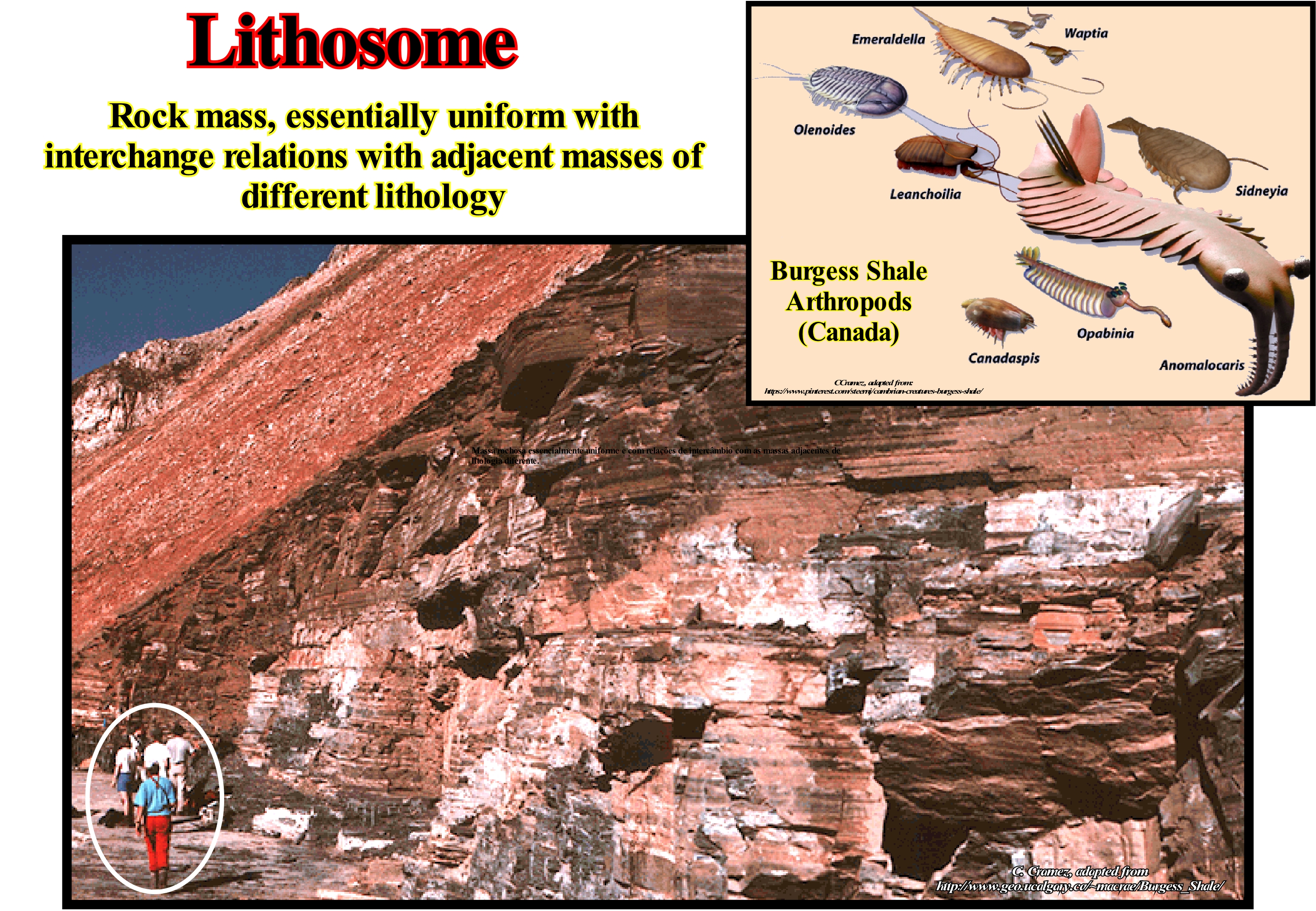 Currently, one of the most well-known lithosomes in the world is the lithosome of the Cathedral Shales (Middle Cambrian) of the Stephen formation, in the Burgess Pass region, between the mountains of Wapta and Field (Rocky Mountains). These rocks formed at about 530 Ma. In them there is a great variety of marine fossils, vastly, superior to the one that is in the present seas. At the time-deposition, it appears that the region of Burgess Pass, which was near the equator, was a the divergent continental margin of North America. On the other hand, it appears that the more or less carbonated shales were deposited under anoxic conditions (low oxygen content), at the base of a significant escarpment, in association with significant submarine failures (slumps). The absence of bioturbation (the process of constructing sedimentary structures of biological origin characteristic of specific environments, disturbing the sedimentary or pedogenic structure to which they overlap) and the presence of a large amount of pyrite do not falsify, but rather corroborate an environment of deep-water deposition, which implies that all organisms were transported to the base of the cliff by small debris streams that have escaped from the edge of the cliff. This hypothesis explains in a satisfactory way the very different orientation of the fossils and their extraordinary preservation. Up to 1994, 125 genera have been described in these shales. Among the main fossils that can be found there are, among others: (i) Anomalocaris or anomalous shrimp, which is an extinct proto-arthropod ; (ii) Marrella splendens, which is a small trilobite-like arthropod ; (iii) Olenoides serratus, which is a trilobite ; (iv) Vauxia gracilenta, which is a sponge (the simple or sessile organism, which may be fresh or salt water, is fed by filtration, pumping water through the walls of the body by holding the food particles in its cells) ; (v) Tuzoia, which is a crustacean bivalve similar to certain shrimps living in modern pickles ; (vi) Ottoia, who was a carnivorous priapulid, probably, living in pits like modern priapulidae ; (vii) Leanchoila, which is a spider-shaped arthropod, etc., etc. In this figure are illustrated several arthropods reconstituted from fossils found were found in the Cathedral shales: (a) Emerald, small, predatory arthropod with a long tail and antennae; (b) Wapiti, had a shell bivalve and superficially resembling a Perspicaris, but must have occupied a different place in the food chain, since the poor composition of its jaw suggests that it probably spent most of the time in the bottom from the sea in search of food ; (c) Olenoids, followed the basic structure of all trilobites - a cephalon, a thorax with seven articulated parts and a semicircular pigment, with long antennae and curved back along its sides ; (d) Leanchoilla, about 5 centimeters in length and long, whip-like probes mounted on front arm appendages ; (e) Sidneyia, with a length between 51 to 127 mm is one of the largest arthropods found in-the Cathedral shales. It is thought to have been a benthic carnivore that walked along the seabed in search of hard shell prey ; (f) Canadaspis had claws at the end of its frontal appendages that could have been used to stir the sediment, or to scrape the top layer which may have been a nutritious layer of microbes ; (g) Modest size Opabinia had a soft, segmented body with lobes along the sides and a fan-shaped tail (the head had five eyes, a mouth under the head and turned back, and a proboscis that probably passed food to the mouth), probably lived on the seabed, using the proboscis to look for small, soft foods ; (h) Anomalocaris, had a large head, a single pair of large, stalk-like eyes comprising approximately 16,000 lenses and a disc-shaped mouth. Stephen Jay Gould in his book "Wonderful Life", published in 1989, contributed to the dissemination of Burgess shale fossils. Gould suggested the extraordinary diversity of fossils indicates that life forms at the time were much more different in body shape than those surviving today, and that many of the original lineages were evolutionary experiences that became extinct. Gould's interpretation of the diversity of the Cambrian fauna was strongly based on the reinterpretation of the original publications of Charles Walcott Simon and Conway Morris. However, Conway Morris strongly disagreed with Gould's conclusions, arguing that almost all the Cambrian fauna can be classified in modern phyla.