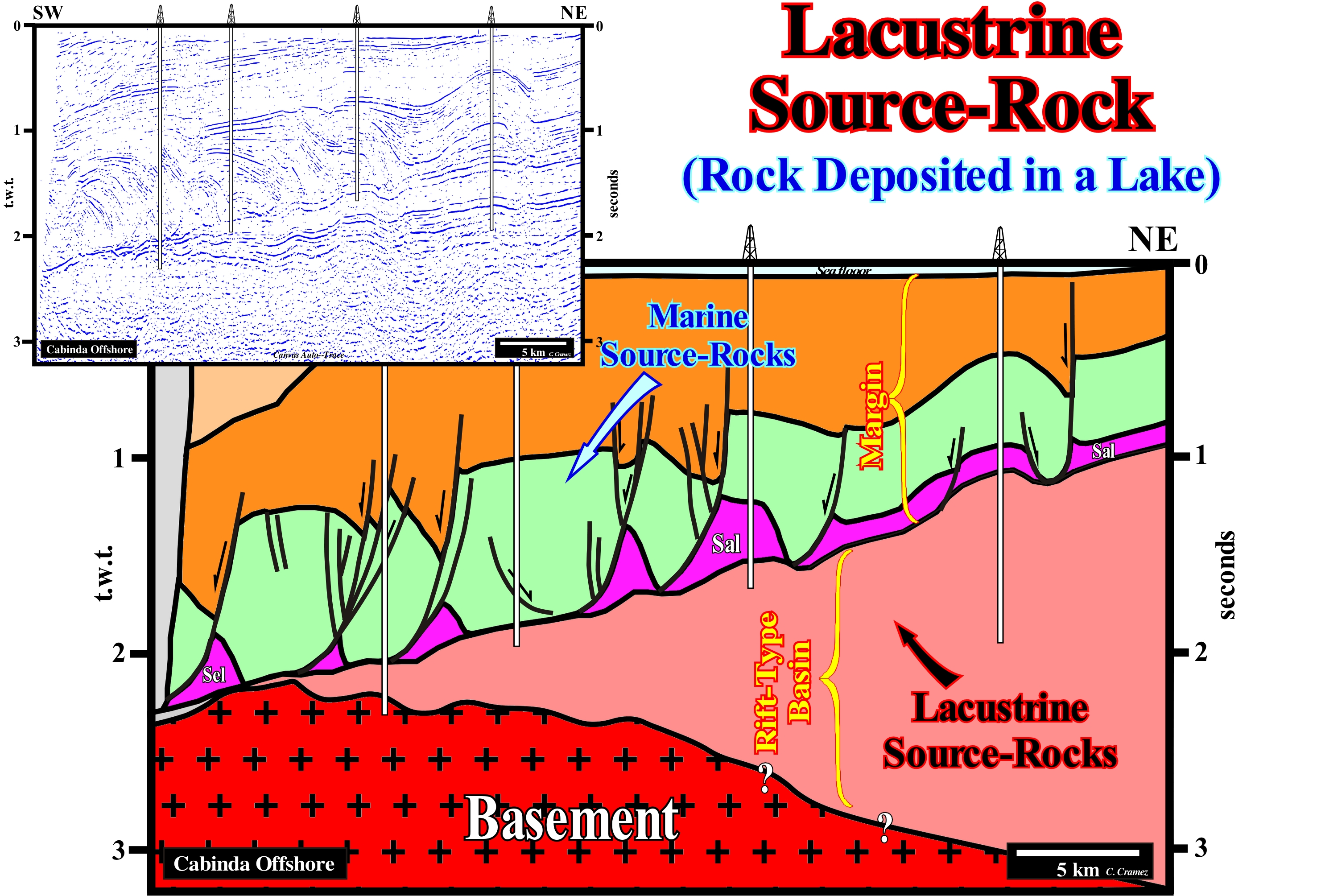 On this tentative geological interpretation of a Canvas auto-trace of a Cabinda (Angola) offshore seismic line, not far from the coastline, the lacustrine source-rock interval, within a rift-type basin is, easily, identifiable: its thickness is, more or less, constant and the internal configuration of the reflectors is, roughly, parallel. Such geometry means that during a certain period of lengthening of the lithosphere, before its break-up, i.e., during the formation of the rift-type basins, the rate of lengthening (extension) was, largely, superior to the terrigeneous influx. In other words, the terrigeneous influx was insufficient. Under these conditions, the formation of a water-depth is inevitable, which creates a, more or less, deep lake and, later, the deposit of a lacustrine interval rich in organic matter, if the conditions of formation and preservation of organic matter are present. When the rate of lengthening of the lithosphere, i.e., the differential subsidence, which creates the rift-type basins is, more or less, compensated for by the terrigeneous influx, all the created available space for the sediments is filled and no water-depth is developed. This implies, necessarily, that the deposited sedimentary intervals thick toward the normal fault bordering the rift-type basin and the internal configuration of the sedimentary intervals, which are composed mainly of sandy material, is divergence. Within a rift-type basin, which, generally, has the geometry of a half-graben, the entire interval with a, more or less, constant thickness and a parallel internal configuration is, likely, to correspond to lacustrine organic rich shaly rocks, i.e., they can be considered as potential source-rocks. If the burial of these intervals is large enough for their organic matter reach maturation, as it is the case illustrated on this tentative interpretation (taking into account the recent uplift of the margin), such lacustrine rocks are, generally, good source-rocks with high productivity.