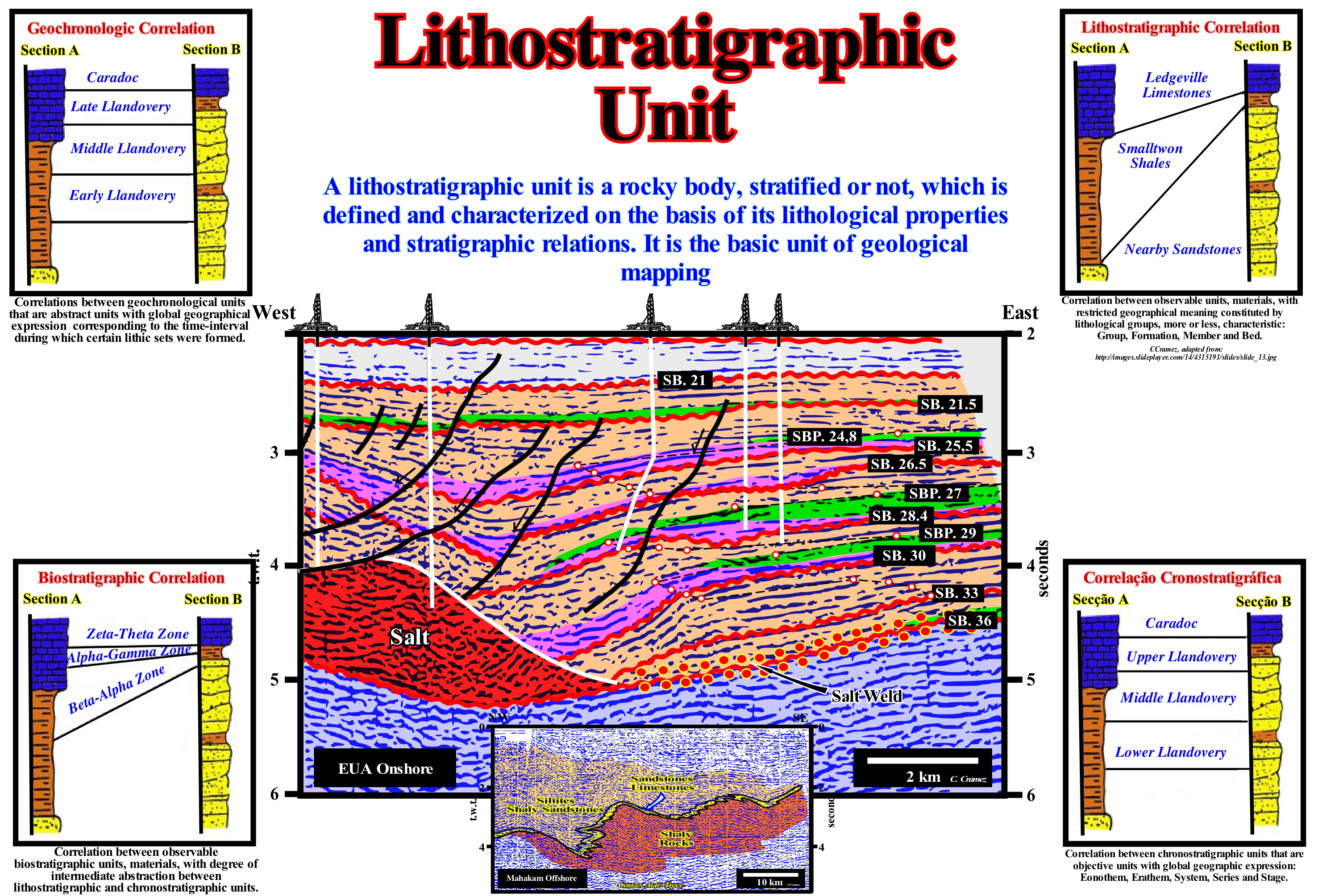 The strata can be sub-divided according to the physical characteristics, fossils that they contain and spatial relations between them. Three types of stratigraphic units are generally considered: (i) Lithological ; (ii) Biostratigraphic and (iii) Chronostratigraphic. A biostratigraphic unit is a set of rocks or strata unified by their fossils or paleontological characteristics, which differentiate them from the adjacent rocks or strata. It can be defined by: (a) The presence of fossils ; (b) The type of fossils it contains or, solely, by the fossils of a certain type ; (c) A taxon, which is a taxonomic unit, essentially associated with a scientific classification system, which may indicate a unit at any level ; (d) A particular association of fossils ; (e) The distribution of taxon or fossil taxa ; (f) the abundance of certain species of fossils ; (g) The morphological characteristics of the fossils ; (h) The way of life and habitat of fossilized organisms ; (i) The stages of evolutionary development of fossils ; (j) The variations of other factors related to the fossils that the strata contains, etc. A chronostratigraphic unit measures the geological time, which scale is based on the timing of major geological events occurring on Earth since its formation about 4.6 Ga. The main chronostratigraphic units are Era, Period, Age and Age, which correspond respectively to the chronostratigraphic units, Group or Erathem, System, Series, and stage or Sub-stage. A lithostratigraphic unit can be formed by sedimentary rocks, igneous, metamorphic and, in some cases, by an alternation of these types of rocks, which means that a lithostratigraphic unit corresponds to a rocky body to three dimensions. The concept of lithostratigraphic unit is applied vertically and laterally. There is no specific geographical extension for lithostratigraphic units, which always depends on the continuity and extension of the characteristics that are verified. In order to facilitate the field localization, geoscientists select the sites that most highlight these particularities. The lithostratigraphic units are divided into: (i) Group ; (ii) Formation ; (iii) Member and (iv) Bed. A group, which consists of two or more formations that do not need to be of the same location (a Super-group refers to the association of several Groups whose characteristics are inter-related, whereas Sub-group corresponds only to the set of some of the formations of a Group). The formation is a rocky-body identified by its lithological characteristics and stratigraphic position, the dimensions of which permit cartography. A member is characterized by the potential peculiarities of an area which differentiates it from the rest of the adjacent formation. A bed is a stratum whose thickness can vary from 1 cm to several meters and whose contact, which may correspond to a stratigraphic discontinuity. The upper and lower limits may be of several types: abrupt, gradual, undulating, etc. On this tentative of geological interpretation of a Canvas auto-trace of a detail of a Texas onshore seismic line, made at the hierarchical level of the sequence-cycles, the different groups of sedimentary systems tracts, individualized within each sequence-cycle, can be considered, in an approximate way, as lithostratigraphic units. Each sedimentary systems tract, which corresponds to a sequence-paracycle consists of two or three depositional systems (each depositional system is characterized by a lithology and associated fauna). A sequence-paracycle is induced by an eustatic paracycle (relative sea level rise), but it is deposited during the stability period of relative sea level that occurs between successive eustatic paracycles (there is any relative sea level fall between the eustatic paracycles). The basic lithostratigraphic unit is the Formation, which has an intermediate position in the hierarchy of lithostratigraphic units. It is the only formal unit that is used to subdivide the entire world stratigraphic column into units on the basis of lithological characteristics. As stated above, geological formations (a set of rocks or minerals that have their own characteristics in relation to their composition, age, origin or other similar properties) are subdivided in members and beds. A member is always a part of a formation, but a formation is not necessarily divided into members. According to the International Guide to Classification Stratigraphy, the formal name of a stratigraphic unit should be the name of the geographical location where it emerges in combination with the appropriate term of its hierarchy (Group, Formation, Member, Layer). The "La Lluna" formation, for example, known for its source-rock characteristics, is the typical lithological unit of Cenomanian-Turonian of Venezuela onshore and offshore.