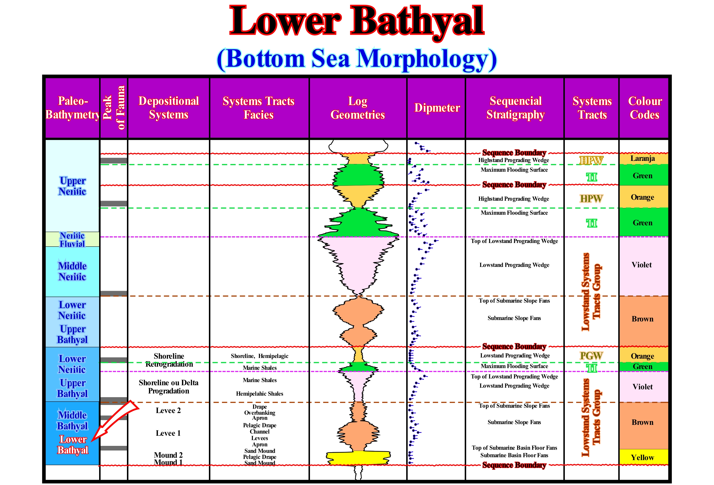The lower bathyal sub-environment is part of the bathyal environment which makes the connection with the abyssal plain. It is the domain of the first submarine slope fans, which are deposited since the relative level of the sea begins to rise. Submarine basin floor fans, on the contrary, settle, during relative sea level falls, preferably, on the abyssal plain. When the turbidite (or turbidity) currents decelerate, due to the lower slope break (abyssal plain - continental slope limit), they lose competence (transport) and the transported sedimentary particles begin to settle down. It can be said the deposit of the submarine basin floor fans (SBFF) is synchronous with the surface of erosion caused by the relative sea level fall. In other words, the age of the submarine basin floor fans gives the age of the lower unconformity or lower boundary of the associated sequence-cycle, although, in the abyssal plain, there is no unconformity, but rather a correlative paraconformity. When the turbidite currents are very competent, which implies a large volume of material transported, the submarine basin floor fans are separated from the rupture between the continental slope and the abyssal plain (deposited further away). Thus, the submarine slope fans (SSF) can be deposited, directly, in the abyssal plain. In this figure, the sequential analysis of an exploration well is outlined. In the first column are marked the depositional environments. At the bottom it is observed that the sediments deposited in the lower bathyal sub-environment are the submarine slope fans (SSF) and that in the middle bathyal, they correspond to the apron (basal slope deposit) and to the natural marginal dikes (levees) of the submarine slope fans, which were deposited on the submarine basin floor fans. In upper bathyal environment, the sediments are mainly deltaic. In the electrical logs, the submarine slope fans have, generally, coarsening upward pattern, whereas the submarine basin floor fans have a cylindrical pattern. The interface between the basin and slope submarine fans corresponds to a fauna peak, which means that the non-deposition hiatus between the two turbidite systems allowed the accumulation of large numbers of remains and fragments of animals and plants.