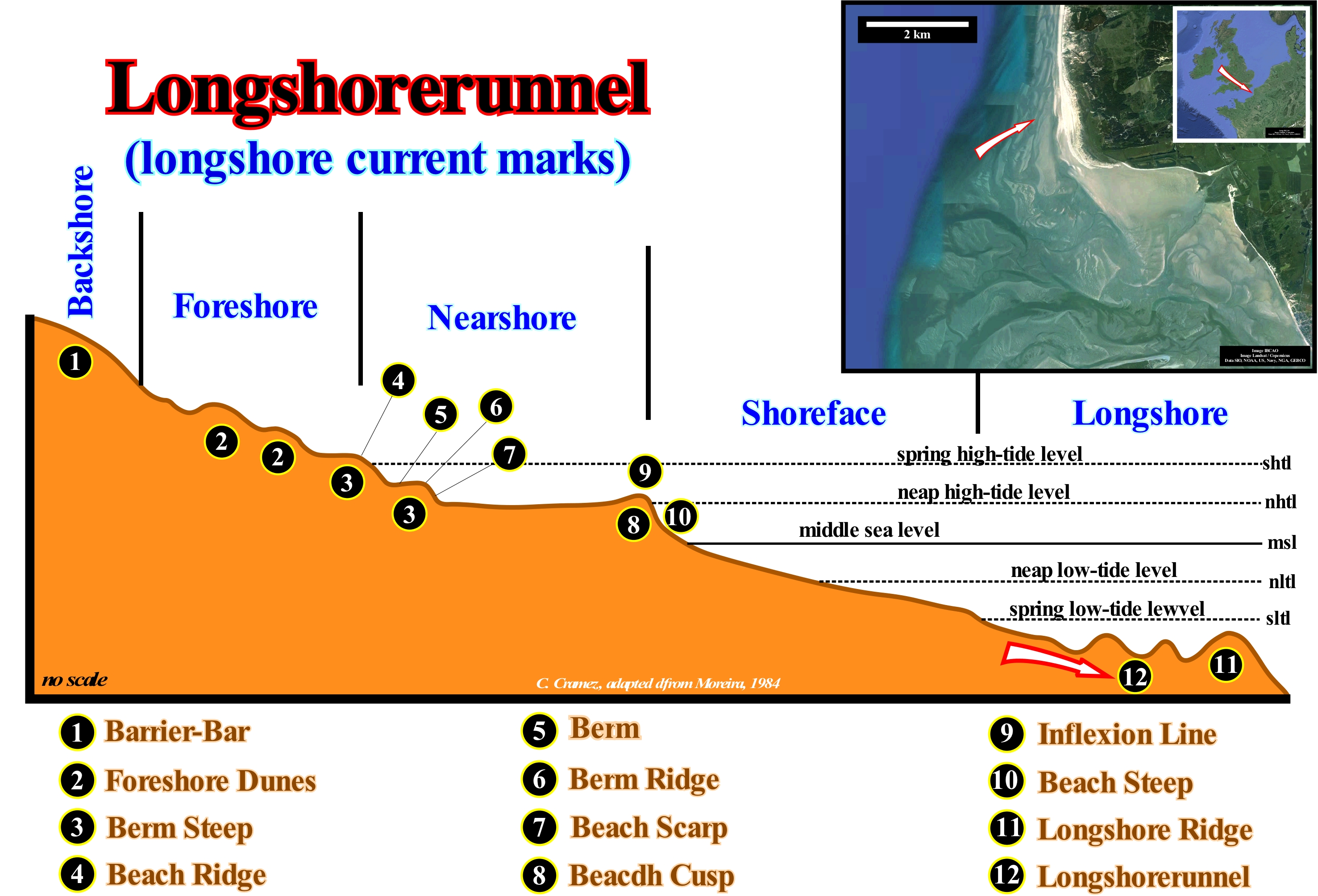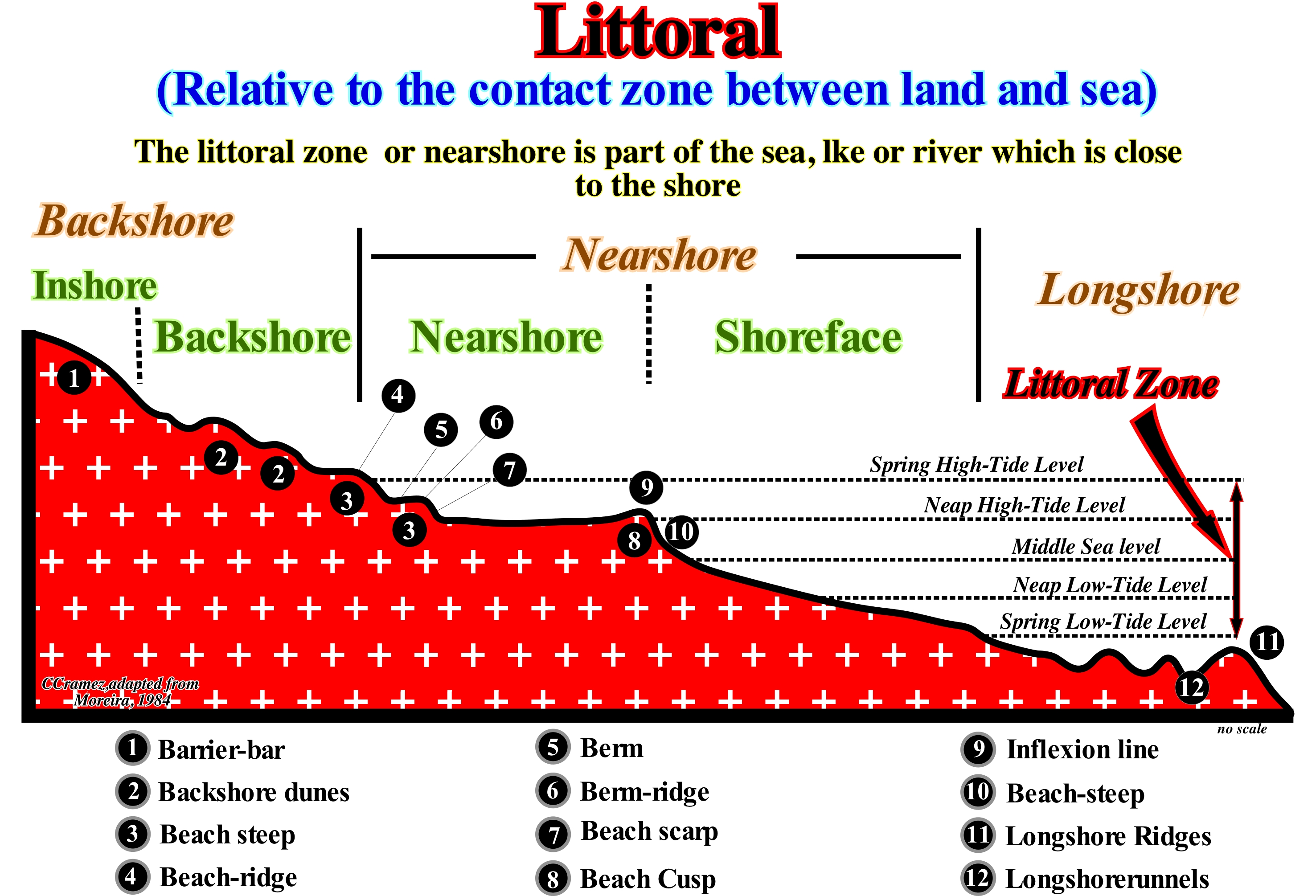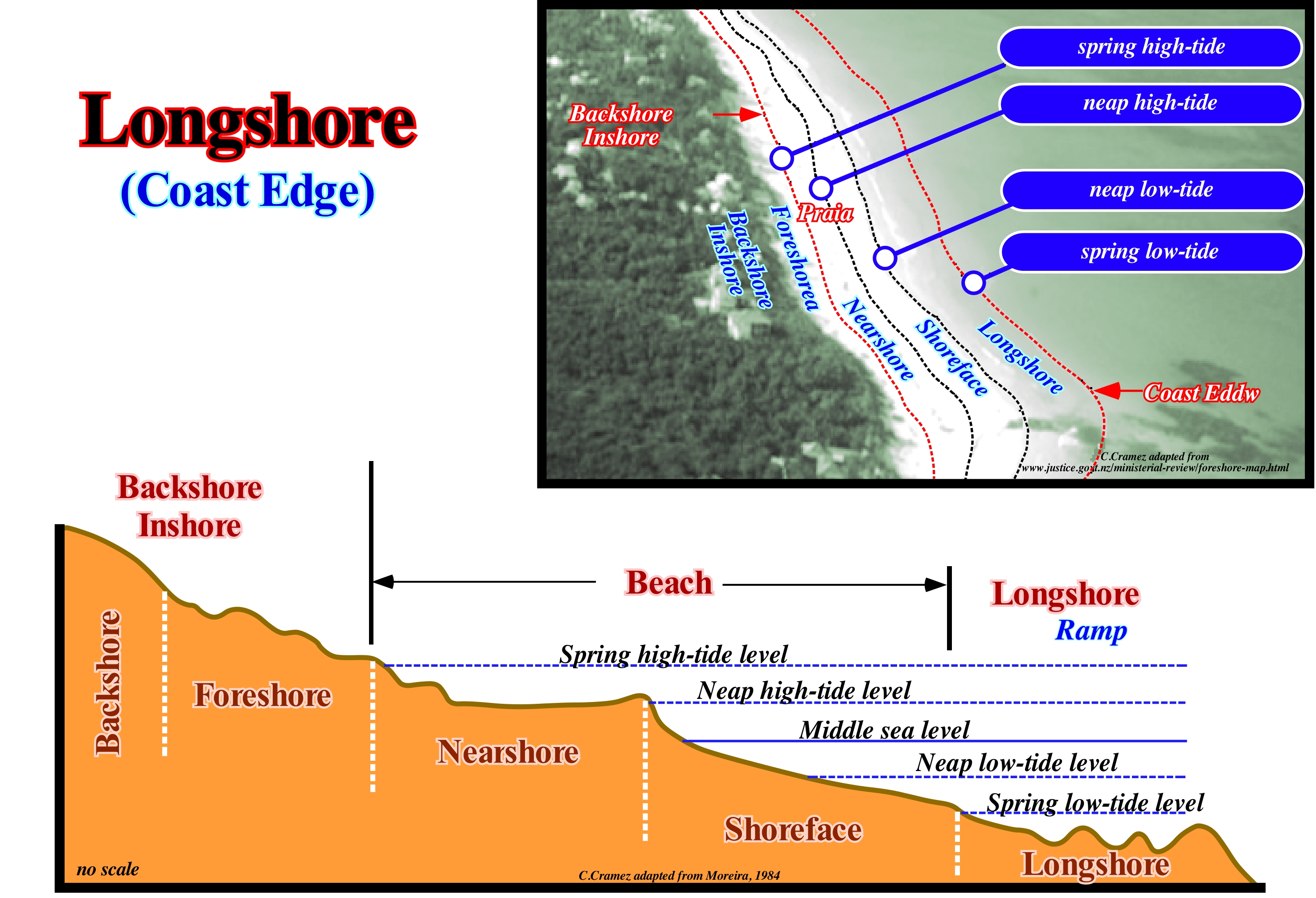 As illustrated in this sketch, some geoscientists restrict the littoral to the intertidal range. Others extend it to the interior, by a space whose limits are not, always, easy to define and, also, seaward to the surf wave line. Other consider the littoral synonym of the coastline, i.e., the strip of land that separates the area between a maritime area and the mainland, or the hinterland. Based on the distribution of the coastal biocenoses (balanced relation of the living beings with the natural environment), depending on the times of emersion, the littoral (coastline) can be divided into bands or zones, parallel to the shoreline: (i) Supralittoral ; (ii) Mesolittoral and (iii) Infralittoral. The supralittoral zone comprises the space reached directly by the sea-spray above the spring high-tides level (always emerged), and which, in turn, can be sub-divided into: (a) Upper, which is the part struck only by small bubbles of air with crystals saline and (b) Lower, which is the part reached by the sea-spray and directly by the foam of the surf in the high-tide. The meso-littoral zone, which corresponds to the intertidal range, can also be sub-divided into: (a) Upper, which is the area between the middle sea level and the spring high-tide level, and (b) Lower, which is the part between middle sea level and the spring low-tide level. The infra-littoral zone, which is below the spring low-tide levels (always immersed), can be sub-divided into: (a) Upper, i.e., the part between the spring low-tide levels and the breaking zone and (b) Lower, i.e., the part that corresponds to the strip of surf (Moreira, 1984). It should be remembered that the tides are oscillation waves of low amplitude (few meters), great wave-length (several hundred kilometers) and a very large period (30-300 seconds). They are formed in the high sea due to the attraction of the Moon and Sun over sea-water. Along the coast, these waves change and are extended by waves of translation that give rise to the tidal currents : (1) Flood (High-tide, Rising tide, Flow), that goes towards the coast and causes an accumulation of water whose maximum is called high-tide and (2) Ebb or Falling tide, which is directed seaward, draining the water accumulated along the coast during the high-tide, and whose lowest level is the low-tide. When the Sun and Moon are in conjunction or opposition the tides are spring tides (with great amplitude). When the Moon is in waning or crescent (quadratures), the tide is neap tide, that is with minimum amplitudes.