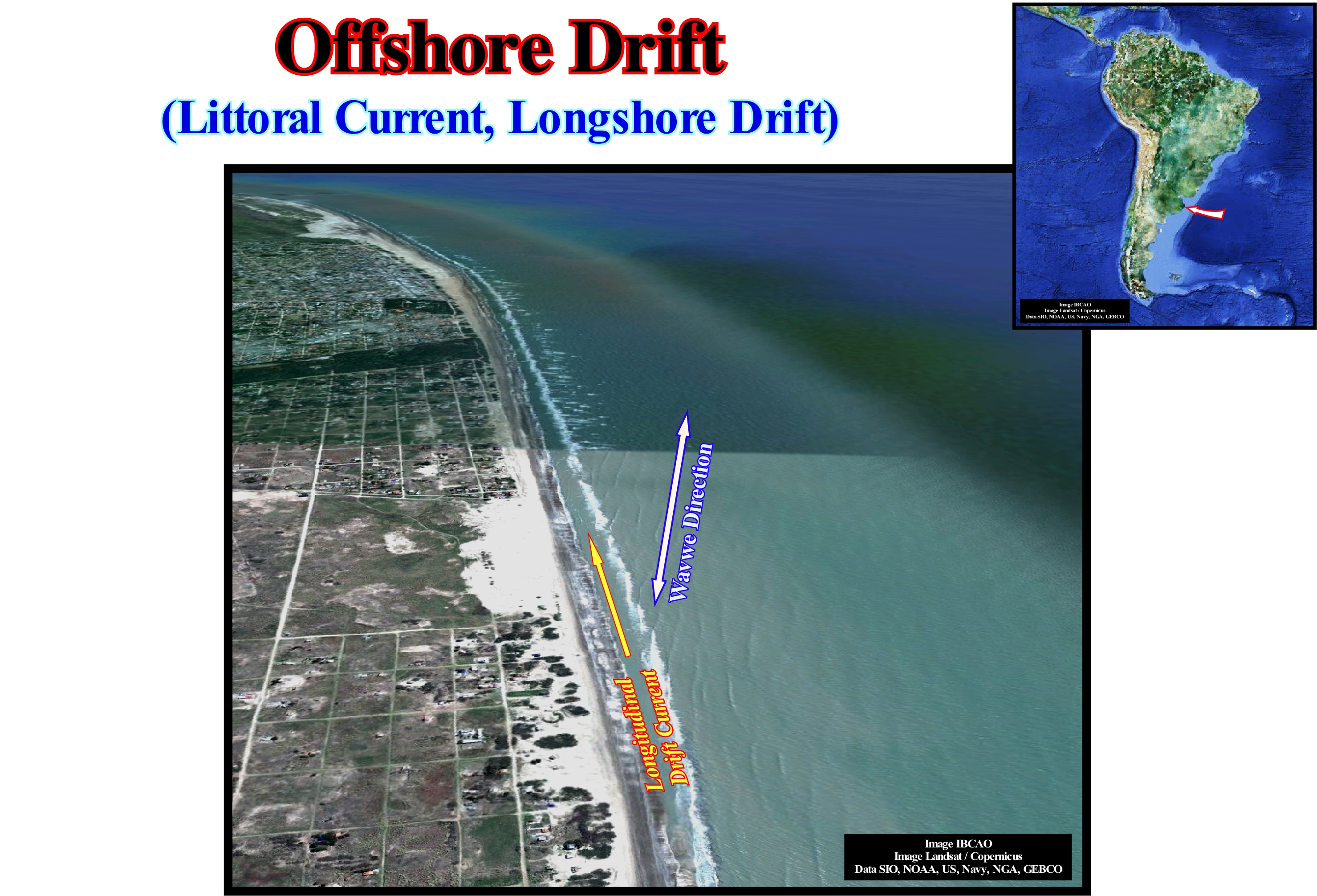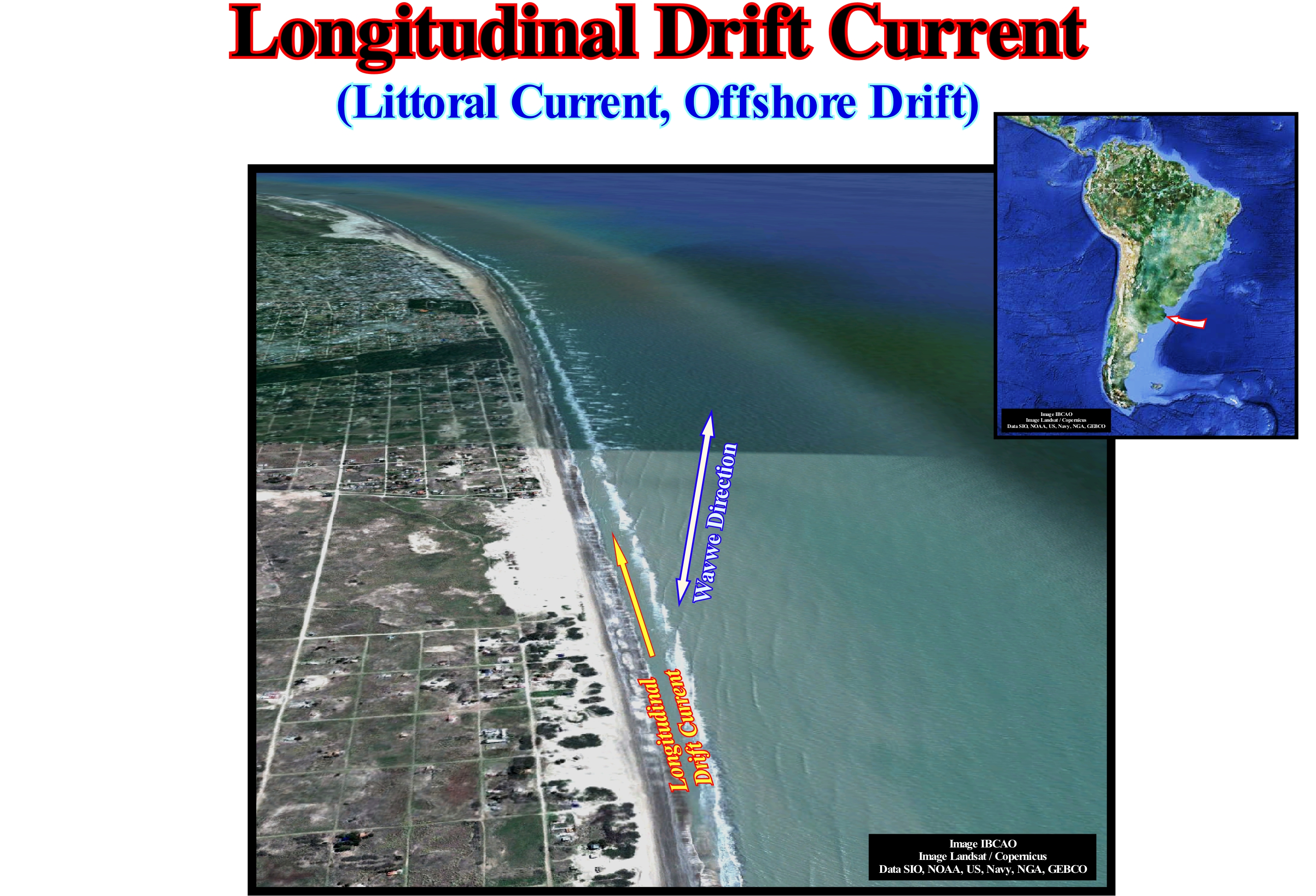 In this photograph of the east coast of Argentina, the dominant direction of the sea-waves is, clearly, visible (perpendicular to the blue arrow). The aggregation of the coastal strands that form the successive coastlines can be explained as the result of the longitudinal drift current. In fact, as soon as the waves break, in the surf zone, a current flows towards the beach. It flows, perpendicularly, to the direction of the wave crest (perpendicularly to the blue arrow drawn in the photograph). Such a current is called uprush current ( one of the two swash currents). Gradually, this up-dip current loses energy and, eventually, reverses itself, that is, it starts to lean seaward, following the slope of the sea floor. This current is the second swash current or backrush current. Thus, the uprush and backrush currents have not only an opposite direction, but also different flow directions. The interaction of these currents forms what some call geoscientists, a zigzag current, whose final result is the formation of a current, more or less, parallel to the coastline, called longitudinal drift current or littoral current or offshore drift, which is responsible for the erosion of the beach, in certain places, and for the deposit of sand in other places. In this example, the beaches are eroded in the south, along the agglomeration of San Clemente del Tuyu, and the sand is transported and deposited in the north, in the form of barrier bars. Often, to protect the shores of the coastal drift, populations build piers (quays or piers) perpendicular to the coastline. Once these protective structures are built, the width of the beach varies greatly on each side of the piers. The wider beach is the side of the jetty which offers a resistance to the offshore drift current, which loses transport competence deposits the sediments that it carries. When the wave direction is NO-SE, as in this example, and the NNO-SSE coastline, if a quay is constructed perpendicular to the coastline, the broadest beach will be located to the south of the quay.