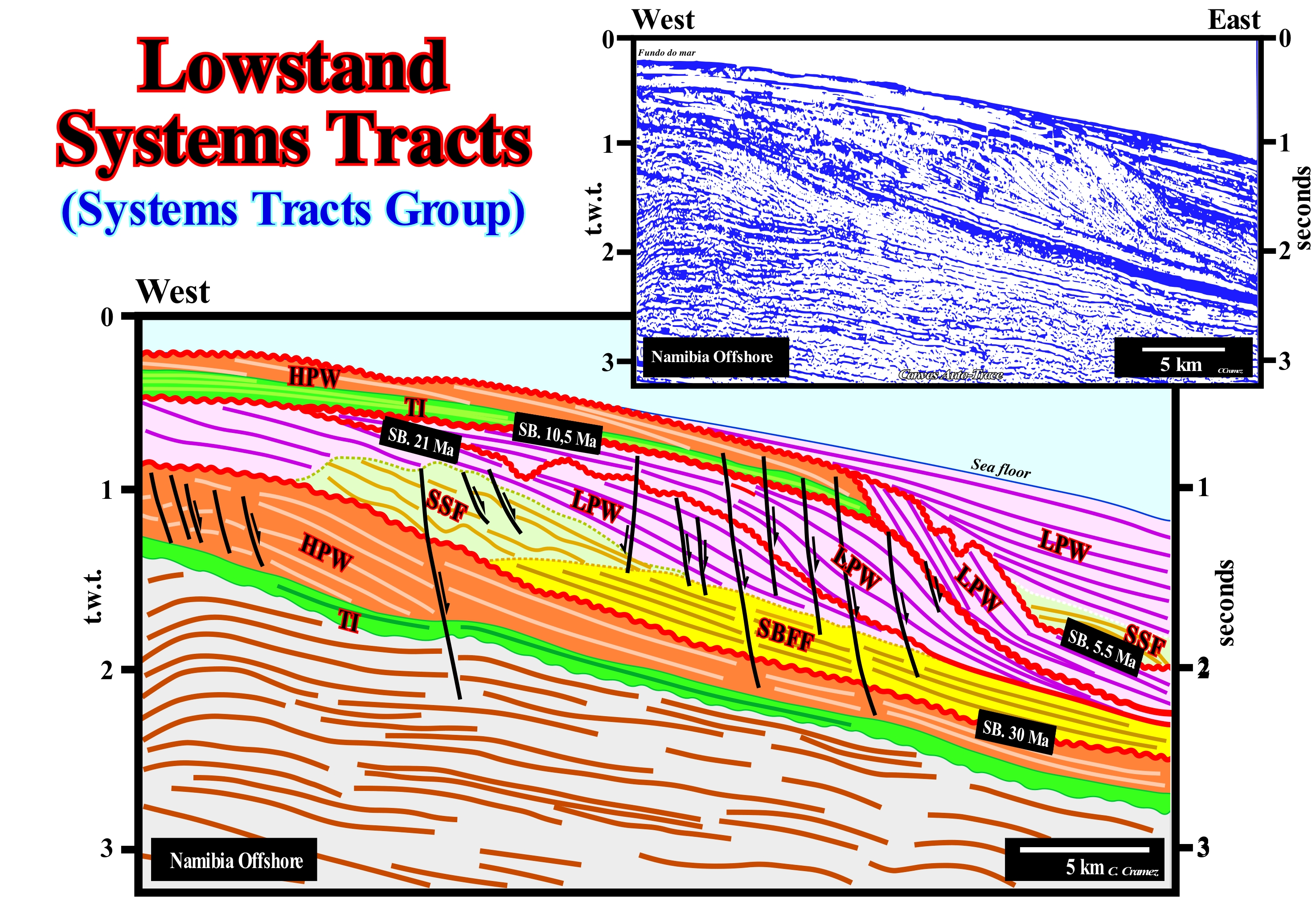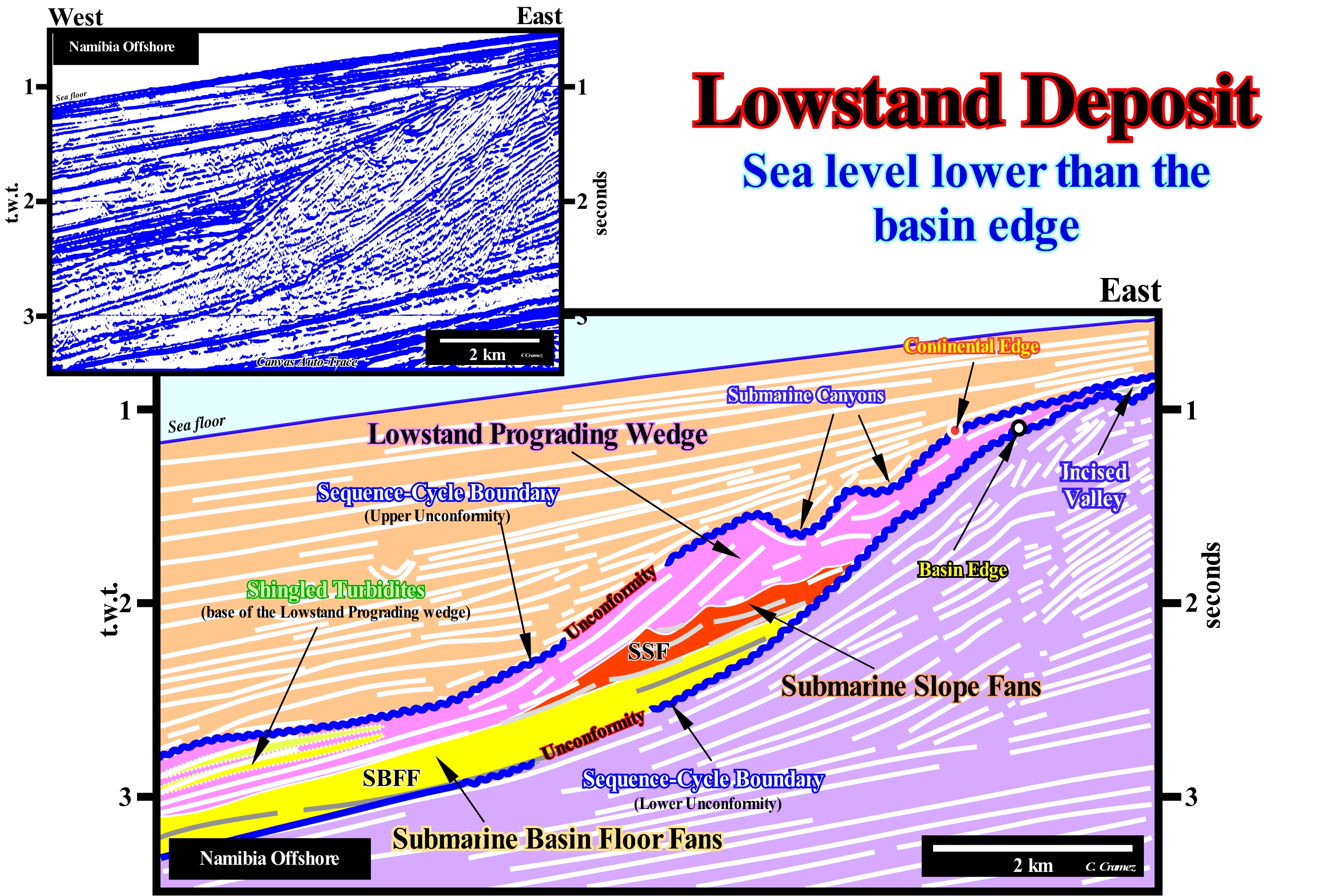 On this tentative geological interpretation of a Canvas auto-trace of a detail of a Namibia offshore seismic line , it is easy to recognize a stratigraphic cycle called the sequence-cycle, induced by a 3rd order eustatic cycle, i.e., an eustatic cycle with a time-duration between 0.5 Ma and 3-5 My. This sequence-cycle, as all sequence -cycles, is bounded by two unconformities (blue-coloured wavy lines), i.e., bounded by two erosional surfaces created by two significant successive relative sea level fall resulting of the combination of absolute (eustatic) sea level, which is supposed to be global and referenced to the Earth's centre and tectonics (subsidence of the sea floor, when the predominant tectonic regime is in extensional or uplift when the predominant tectonic regime is in compressional). It may be said that each unconformity corresponds to a hiatus surface, along which the gap decreases basinward. The upper unconformity is characterized by onlap surface of the overlying sediments. The lower unconformity may be characterized by the onlaps of the internal reflection terminations of the cycle-sequence. The great majority of reflectors with reservoir-rock characteristics terminate by onlaps against the unconformity which limits, at bottom, the cycle-sequence, which can also be put in evidenced ±by the toplaps of the underlying sediments. This is one of the main reasons why sequential stratigraphy is, widely, adopted by geoscientists working in the oil industry, since one of their main concerns is the location of reservoir-rocks within potential traps. As can be seen, on this tentative interpretation, the illustrated sequence-cycle is incomplete. The highstand systems tracts sub-groups, i.e, the transgressive interval (TI) and the highstand prograding wedge (LPW), which form, normally, the highstand systems tracts group (HSTG), were not deposited. Just the lowstand systems tracts sub-groups were deposited. From bottom to top, these sub-groups are: (i) Submarine Basin Floor Fans (SBFF), coloured in yellow ; (ii) Submarine Slope Fans (SSF), coloured in red and (iii) Lowstand Prograding Wedge (LPW), coloured in violet. In association with the lowstand prograding wedge (LPW), one can recognize in the upper part (Eastward), an incised valley fill and, in the lower part (Westward), a set of shingled turbidites (proximal turbidites). The filling of the incised-valley is synchronous with the deposition of the upper part of the lowstand prograding wedge (LPW). Shingled turbidites are deposited on the base of the progradation of the lowstand prograding wedge following failures and ruptures of the continental edge (at the top of the lowstand prograding wedge). The wavy geometry ("gull wings" structures of P. Vail) of the submarine slope fans (SFF) contrasts with the parallel geometry of the submarine basin floor fans (SBFF). The first is associated with natural marginal dykes (levees) and the depression or channels (in case of erosion) fills between them. The parallel geometry is associated with the turbidite lobes of the submarine basin floor fans. As suggested on this tentative interpretation, the age of the unconformities, which limit this incomplete sequence-cycle is given by the age of the overlying submarine basin floor fans. They fossilize the smaller depositional hiatus between the sediments underlying and overlying the sequence boundaries. It is important to note that in the deep parts of the basin, the sequence boundaries are not the unconformities but their correlative deep-water paraconformities, since there is any attitude difference between the overlapping and underlying intervals, but just an hiatus due to the absence of deposition between them.