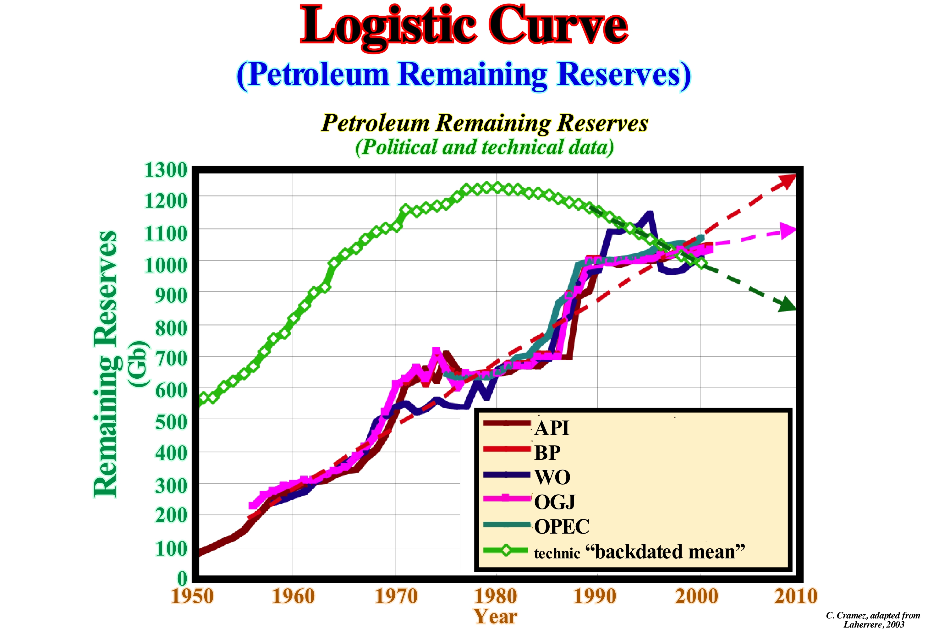 The curve of the rate of oil production, which depends, linearly, on the amount of oil that still exists on the ground to be produced, i.e., the oil still remaining underground, is a function of time and can represent by a logistic curve or by its derivative as shown in this figure. The scales of the derivative curve are: (i) Time, in general, years in abscissa and (ii) Remaining Reserves in ordinates. In this example, it can be said that the technical data (expected value at the time of discovery) strongly suggest that from the year 1980, more reserves were produced than were discovered. However, the various oil companies and international organizations continued to say (these curves were made by J. Laherrere in 2003) that more reserves were discovered than were produced. Of course, all geoscientists knew and know, that was a lie. The vast majority of oil companies, but not all of them, in order to pass on such a message included in the remaining reserves not only unconventional reserves (e.g., reserves of the oil shales) but also what might be called the reserves (purely speculative reserves) to justify production quotas. Anyway, in the oil industry, whatever the curve is presented, there is always a maximum point of production based on the rate of discoveries, rate of production or cumulative production. At the beginning of the curve (before the peak) the rate of production increases, due to the rate of discoveries and the development of infrastructure. In the final part of the curve (after the peak) production decreases due to depletion of resources.