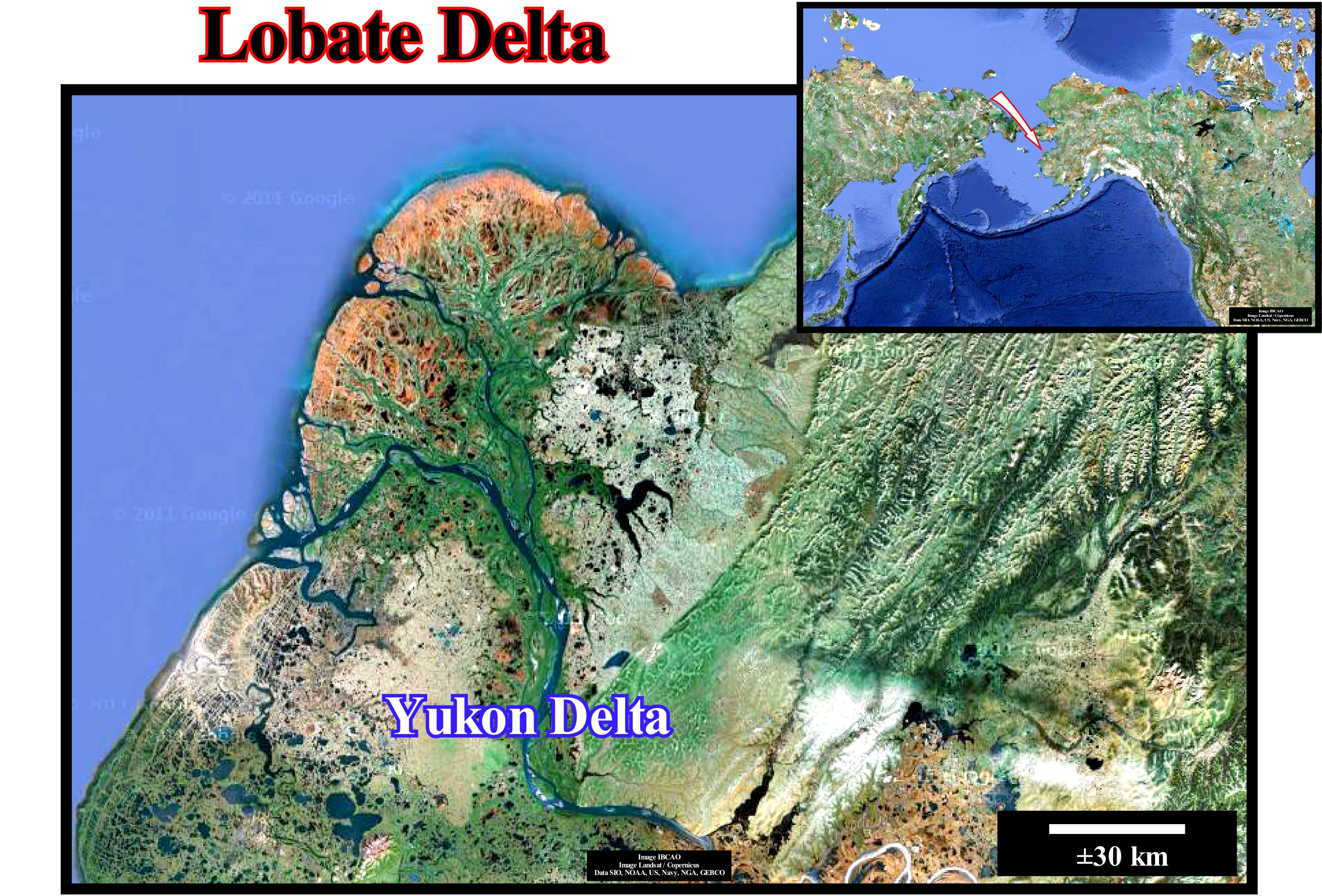 Taking into account the dominant forces in the formation process, geoscientists, such as Galloway, classified the deltas into three main types: (i) River-Dominated ; (ii) Wavy-Dominated and (iii) Tidal Dominated. The river-dominated deltas are those dominated by the terrigeneous influx of rivers. The wavy-dominated deltas are dominated by the activity of the sea-waves. The tidal-dominated are those where by tidal activity and tidal-currents are predominant. The river-dominated deltas are cut and have many distributaries with marshes, bays or tidal flats in the inter-distributary regions. They occur when the water-course and sedimentary particles transport are strong and other effects, such as rework by waves or tides, are smaller. These deltas tend to form large delta lobes in the sea, which may have little more than the distributary channel and have a natural marginal dykes (levees) exposed above sea level. Due to their resemblance to a bird's foot, they are, often, referred to in the geological literature as a "bird's foot delta", as is the case of the Mississippi River Delta Building*. When much of the floodplain between the distributary channels is exposed above sea level, the delta displays a lobate form. Wave-dominated deltas are more regular, exhibiting curved and arched shapes with frequent beach ridges, such as in the Nile delta or Niger delta buildings. In these deltas, the surf of the waves causes a mixture of fresh and salt water so that the flow, immediately, loses its energy and deposits all its load along the coast. Tidal-dominated deltas occur in areas with high tides or with high velocity tidal currents. Such deltas, often, resemble to an estuarine bay filled with many elongated islands parallel to the main tidal stream and perpendicular to the shoreline, such as the Brahmaputra Delta or the Mahakam Delta buildings. The deltas of the Mississippi River and those of the Yukon River are typical deltas dominated by the terrigeneous influx carried by the rivers. The deltas associated with the Senegal and San Francisco (Brazil) rivers are dominated mainly by the activities of the sea-waves, while the deltas associated with Fly river (Papua New Guinea) are dominated by the tidal action and tidal currents. The deltas dominated by the influence of the rivers may have an elongated or lobular geometry. Lobated deltas, such as those of the Yukon delta building, have, generally, many distributive (current flowing out of the main channel of the river), some of which may be inactive for some time. The bays between the distributives are very small or may not even exist. On the contrary, marshes and peat bogs (peat deposits, which are the fuel formed by vegetable matter, more or less, carbonized) almost always exist between the channels. The sand is deposited at the mouth of the distributives, around the delta front, which creates a, more or less, continuous planar sandy body, which, downstream, passes to a silty barrier bar and then to prodelta shales. The progradation (seaward displacement or outbuilding and, generally, upward (upbuilding), i.e., with aggradation) of the coastal onlaps of a lobate delta is, relatively, slow. This type of delta was, predominantly, in the former Mississippi Delta, with fairly thick (20/30 m) sandy delta fronts. After a period, more or less, long of growth, the main current of the Mississippi, it turned aside, laterally, and created another lobed delta. This pendulum effect allowed the formation of several delta lobes up to about 1,500 years BC when the modern delta on bird's paw began to form. The development and, above all, the enormous thickness of the modern Mississippi Delta Building was possible due to the strong subsidence created by compaction of the sediments (reduction of volume or thickness of sediments, usually of fine grain, due to the increase of the sedimentary load or the tectonic pressures), which has caused, several times, the flood of the delta by the marine waters. A great number of coarsening upward sedimentary intervals were formed by the successive growth and abandonment of the lobate deltas. This photograph illustrates the lobate geometry of the modern Yukon Delta (Alaska), which is one of the largest deltas in the world. It developed where the Yukon and Kuskokwima rivers (or Kusko, south of the Yukon) discharge into the frigid Bering Sea on the western coast of the state of Alaska. With about 129,500 km2 in size, the Yukon Delta is one of the largest deltas in the world. It is larger than the modern Mississippi Delta and comparable in size to the entire state of Louisiana in the United States. The geometry of the delta suggests the influence of the terrigeneous contribution of the river is predominant, although the Arctic climate plays an important role in the construction and lobular geometry of the delta. Other types of delta that can be considered, as a function of delta dynamics and the shape of the lowland surface, are: (i) Abandoned Delta or Sub-delta ; (ii) Alluvial delta ; (iii) Arctic Delta; (iv) Rounded Delta; (v) Atrophied Delta; (vi) Complex or Polymorphic Delta ; (vii) Cuspate Delta ; (viii) Finger Delta ; (ix) Flood delta ; (x) Closed Delta ; (xi) Gilbert type Delta ; (xii) Lava Delta ; (xiii) Rising-Tide Delta ; (xiv) Tidal Delta ; (xv) Submarine Delta ; (xvi) Storm Delta ; (xvii) Wave Delta ; (xviii) Ebb Delta.