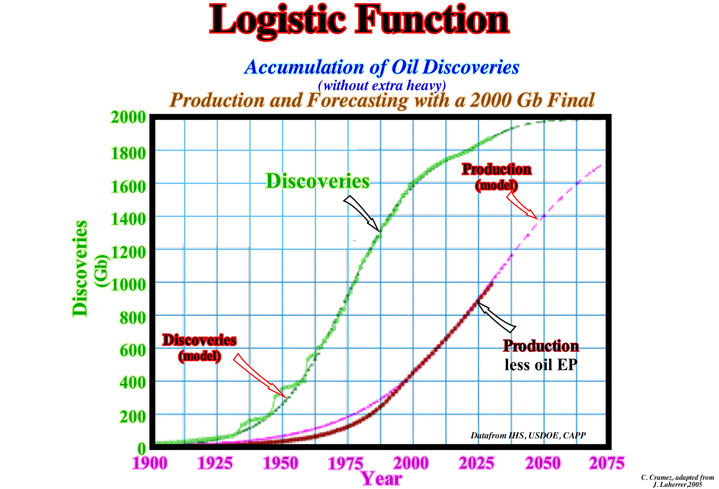 Logistic functions combine, in a single diagram, two characteristic types of exponential growth. The first type of exponential growth is the familiar increasing curve with a rising rate, that is, how growth is exponential: the growth rate is proportional to the amount of the function value (curve with the parabola half-face up) concave upwards. The second type of exponential growth is usually called limited exponential growth. This type of growth is decomposed into parts that are subtracted from a fixed limit. As the exponential decomposition tends to disappear, the differences at the fixed limit increase up to this limit (curve with a half parabola facing downwards). This type of function models a growth that is limited by certain fixed capacities. Logistic functions combine the first type of exponential growth (when values are small), with the second type of exponential growth (when values are close to capacity). Logistic functions model features with limited exponential growth. Logistic functions, which have a characteristic S form , apply to population studies, bacterial development, plant growth with seeds, analysis of fossil fuel reserves and production, etc. This figure that cumulated oil discoveries (extra-heavy excluded), production (lower curve), which is smaller than the cumulation of the discoveries (upper S curve) and forecasts until 2075 (for last reserves of 2000 Gb). As can be seen, the maximum derivative (inflection point) of the production curve (lower S curve) strongly suggests that the peak of production, if it has not already been reached, will be between 2010/2020.