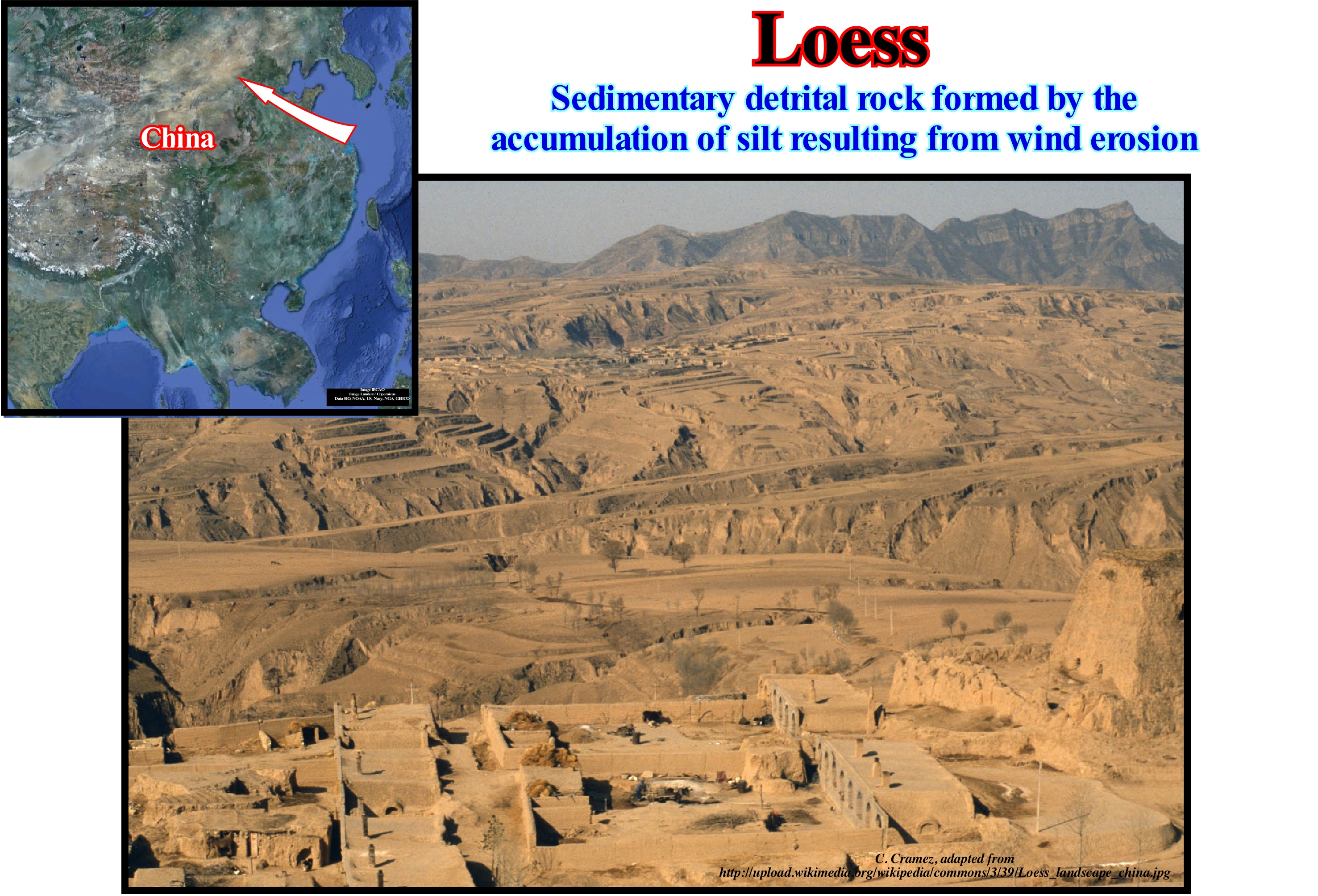 Loess (from the German Löss, loose) is a fertile soil of yellow coloration, formed by sediments deposited by the wind. The loess is found in part of Europe (France and Netherlands) and mainly in China, especially, along the Yellow River, where it is, widely, used for rice cultivation. The definition of loess is twofold: (i) Lithological (calcareous silt) and (ii) Genetic (wind deposit). The loess is, mainly, formed of silica (detrital quartz) and calcium carbonate (CaCO3), but it contains, to a lesser extent, feldspar, biotite (two minerals that, with the quartz, enter in the sand composition) and clays, often kaolinite (these clays can be agglomerated and form fine silt grains). In terms of its structure, the loess is characterized by a good grain size calibration due to its wind origin, with grains between 10 and 50 micrometers (a size between 2 and 50 microns, which corresponds to what certain geoscientists call slime). The loess is homogeneous, without stratification, but has a very high porosity resulting from the traces of roots and a carbonated cementation of the grains. During the Pleistocene, the loess is the result of soil accumulation under cold and dry conditions of wind-blown silts from the source zones (alluviums, outwash or fluvio-glacial deposits, coastal and estuarine sediments, arid zones, etc.) subjected to wind deflation. A grain size drift (sandy loess) may be due to the proximity of the loess area of origin and thus due to less advanced wind screening. In Belgium, an area of "sandy loess" separates the wind sands of the Campine sands from the Hesbaye loess. A grosser granulometry may also be due to an enrichment of available local materials in abundance. As shown in this figure, when loess formations are plentiful, they tend to create a specific morphology, either because of their deposition (poorly marked topography of small hills and disorganized river network) or because of their sensitivity to erosion (plateaus Chinese loess, lands, etc.) (http://fr.wikipedia.org/wiki/Loess).