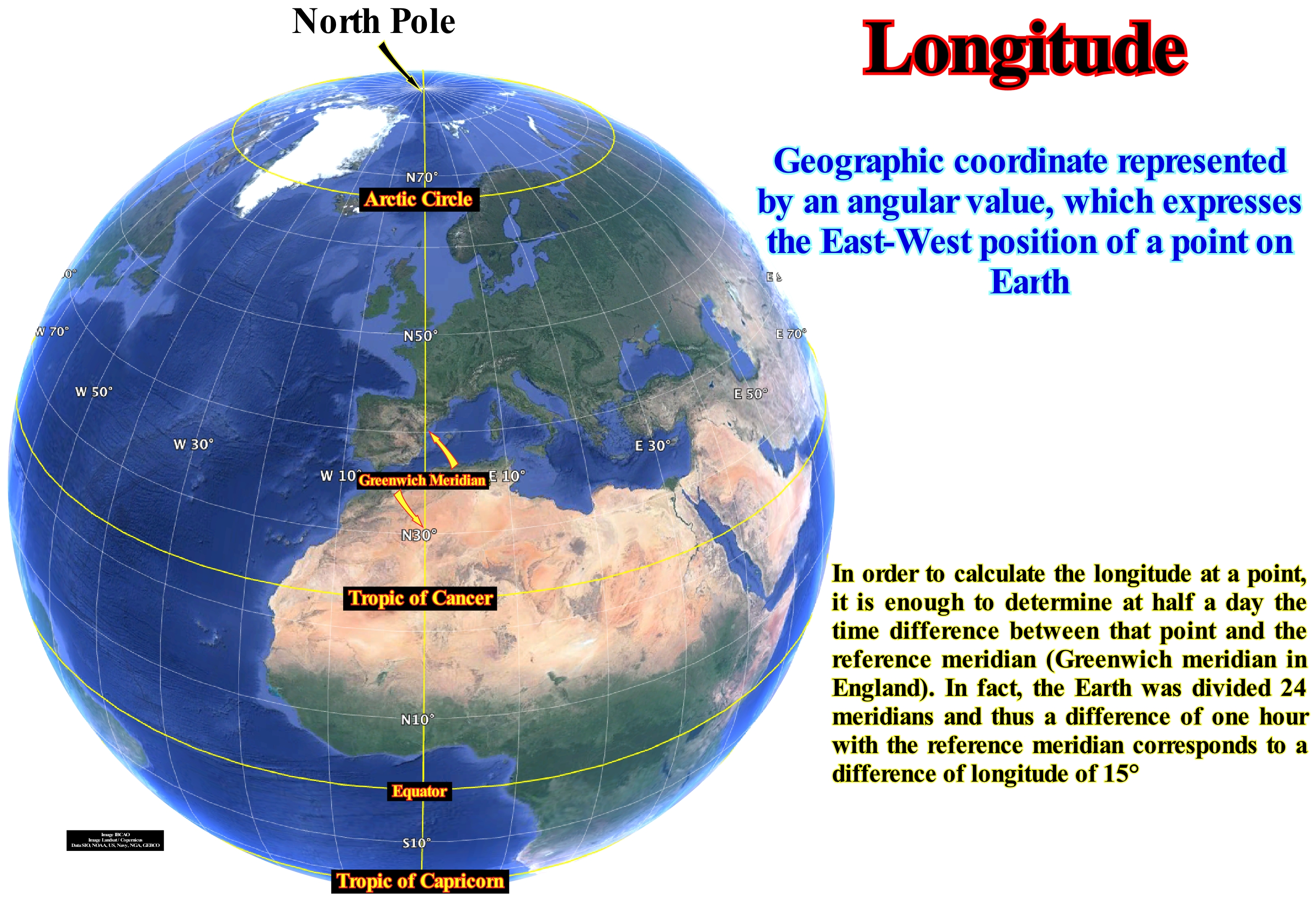 The longitude, which is, sometimes, represented by the Greek letter λ (lambda), describes the location of a place on Earth measured in degrees, from zero to 180 to East or West from Greenwich Meridian (it is the meridian which passes over Greenwich at the Royal Observatory on London surroundings, UK) and, by convention, divides the globe into the west and east. Unlike latitude, which has the equator line as a natural starting point, there is no natural starting position to mark the longitude. A meridian of reference had to be chosen. While British cartographers used the Greenwich Meridian long ago, other references were used as: El Hierro, Rome, Copenhagen, Jerusalem, St. Petersburg, Pisa, Paris, Philadelphia and Washington. In 1884 at the International Meridian Conference the Greenwich Meridian was adopted as the first meridian of the world. Each degree of longitude is subdivided into 60 minutes, and these in 60 seconds. A longitude is specified in degrees (°) degrees minutes (') 'seconds (''). If the locality is in the west a negative sign (-) is placed in front of the longitude. Instead of using the negative sign, you can also use the letters E and W to indicate "East" and "West", respectively. A longitude can be combined with a latitude to give a precise position of a place on Earth. Unlike a degree of latitude, which always corresponds to a distance of 111.12 km, a degree of longitude varies from 0 to 111.12 km if the distance is measured in a circle of the same latitude, the distance is 111.12 km times the cosine of latitude. If the distance is measured in a maximum circle, the distance is slightly smaller. The length of a point can be determined by calculating the time difference between the locality and Coordinated Universal Time (UTC). As one day has 24 hours and a circumference has 360 degrees, the Sun moves through the sky at a rate of 15° per hour (360° divided by 24 hours = 15° per hour). To perform this calculation, you need a clock by checking UTC, and determining the local time through astronomical observations (http://en.wikipedia.org/wiki/Longitude).