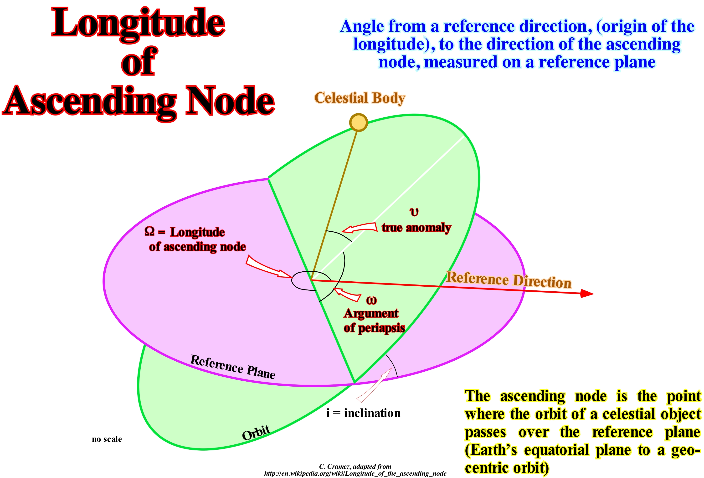 The longitude of the ascending node (Ω) is one of the orbital elements of the orbit of a celestial body. In addition to the longitude of the ascending node or other orbital elements of a celestial body are a set of six numerical values that allow to define its orbit around the Sun or any other celestial body of totally, univocal form. These six quantities are: (i) Orbital Inclination (i) ; (ii) Argument of the Perihelion (ω) - if it is not the Sun, we call it periapsis argument ; (iii) Larger Semicircle of the Orbit (a) ; (iv) Eccentricity of the Orbit (ε) and (v) Mean Anomaly of the Time (M0). The orbital elements of real objects tend to change over time. The evolution of the orbital elements takes place mainly due to the gravitational force of the other bodies. In the case of satellites, due to lack of primary sphericity, or to friction with the atmosphere. This is fundamental in the Earth's artificial satellites or other planets. In the case of comets, the expulsion of gas and the pressure of the radiation, or the electromagnetic forces introduce small non gravitational forces that must be considered to explain their movement. For an object that orbits around the Sun, it is the vertex angle in the Sun, which goes from the Aries Point (or vernal point) to the ascending node of that orbit, measured on the reference plane of the ecliptic (plane of Earth's orbit around the Sun, or the orbit described in this plane; the name comes from the fact that eclipses are only possible when the Moon is very close to this plane), in the direction of the translation of the body. The following are the lengths of the ascending node of the 8 planets of the Solar System: (a) Mercury = 48.331° ; (b) Venus = 76.67029° ; (c) Earth = 348, 73936° ; (d) Mars = 45.562° ; (e) Jupiter = 100.492° ; (f) Saturn = 113.64281° ; (g) Uranus = 73.98982° ; (h) Neptune = 131.79431°. Do not forget that the slope and the longitude of the ascending node indicate the plane of the orbit, that the perihelion argument guides the orbit within its plane, that the larger semi-axis (or the period, indistinctly) determines the size of the orbit, that the eccentricity determines its shape and that the time of passage through the perihelion (or the average anomaly) allows to locate the object in its orbit.
